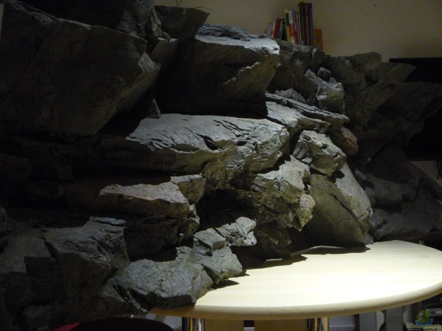 Die Gestaltung meines Beckens, soll eine kleine Hangnachbildung in Ufernähe darstellen mit Geröll von rechts nach links in einen natürlich durchgeschliffenen Seegrund der Höhlen und Verstecke bietet. Die Module sind so angeordnet das fast alle durch-bzw-unterschwimmbar sind.