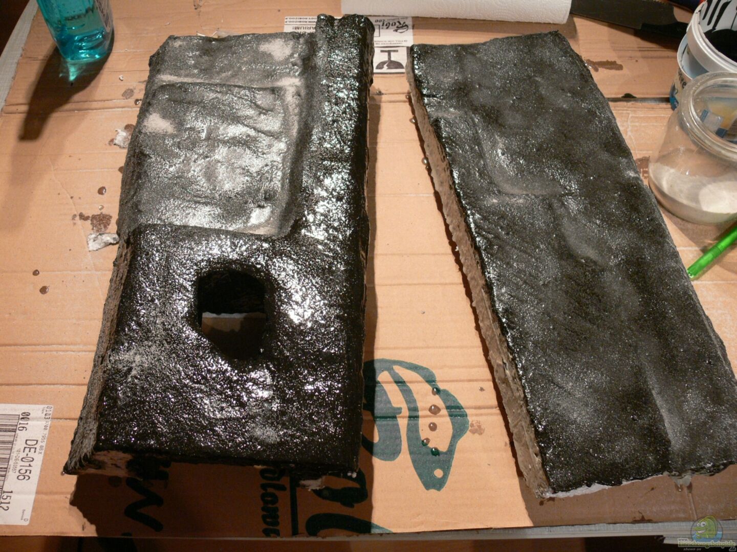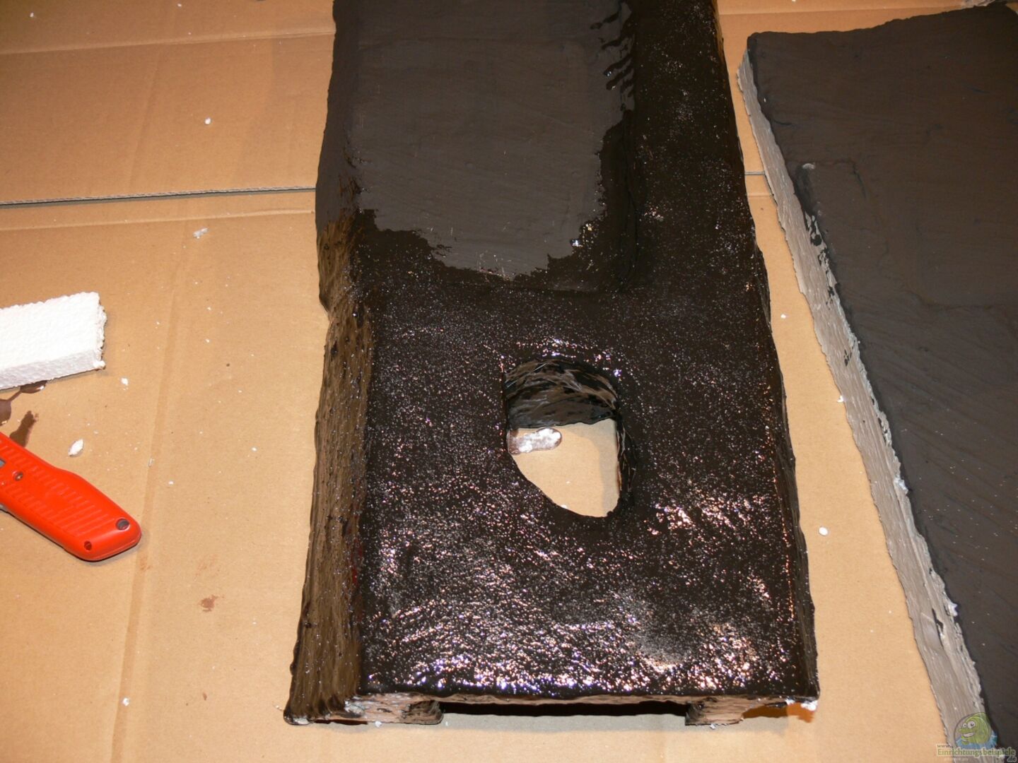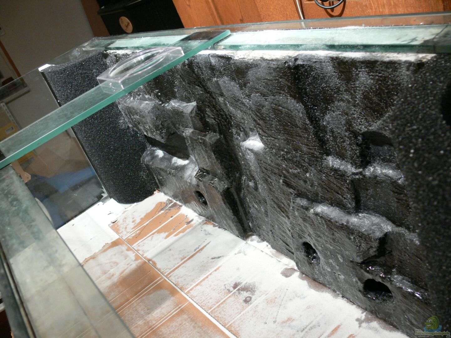Rückwand: aus 10 cm Styropor in zwei Teilen geschnitte, ausgearbeitet und Geföhnt. Nächste Woche wird mit Portlandzement (gute anfangstrocknung) ausgearbeitet. Ich wei?? noch nicht, ob im Aquarium oder auf den Tisch mit den Zement Arbeiten soll. Ich hoffe das bald auch Epoxidharz Aquarium E45TM zum versiegeln bald kommt.