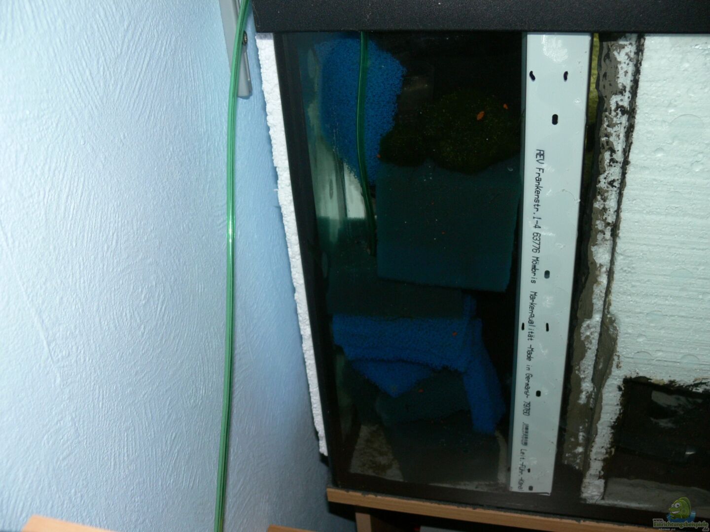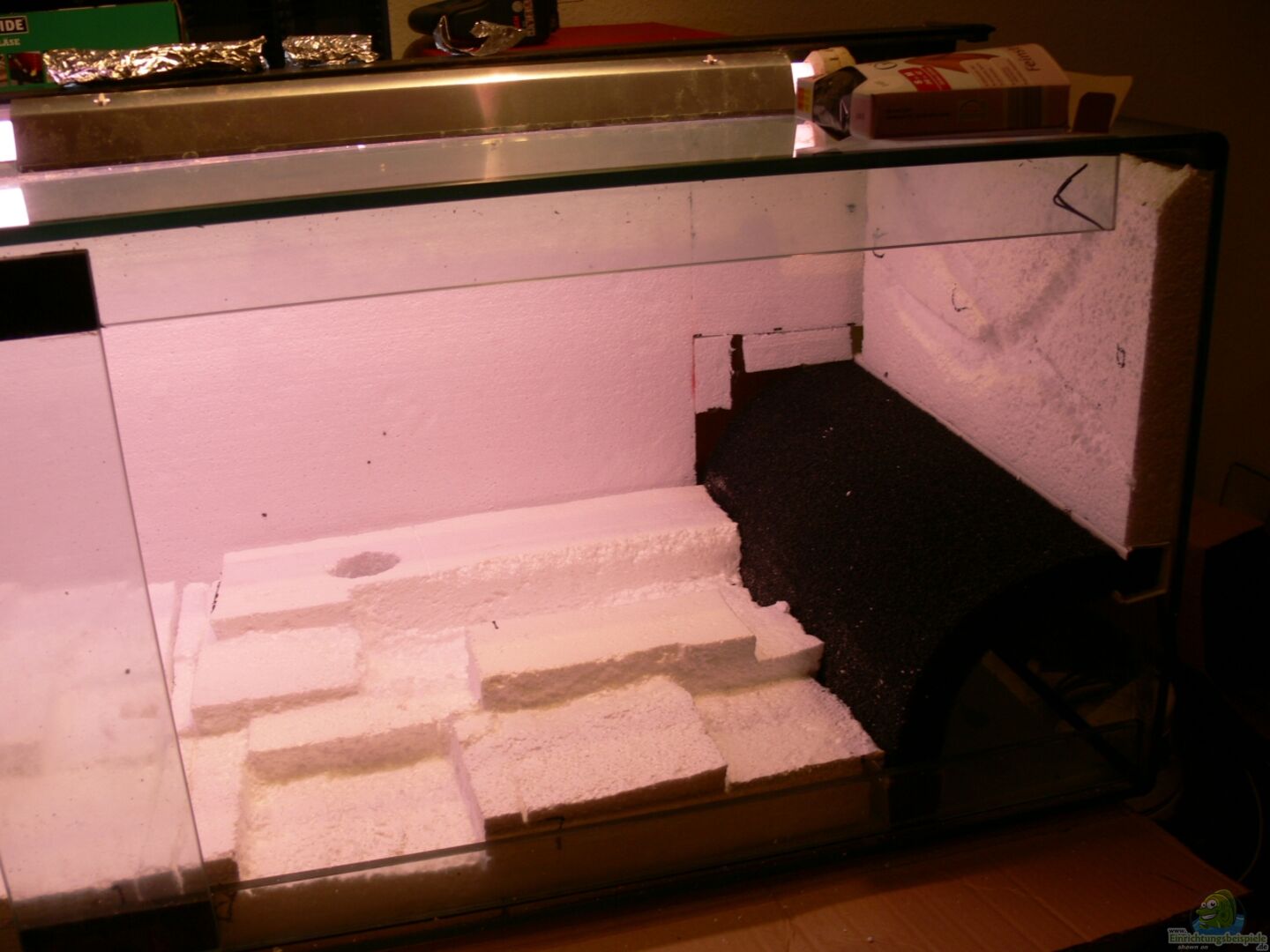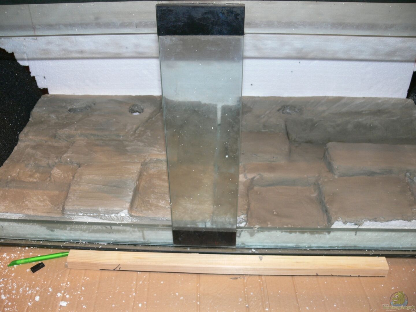 selbstgebaute Rückwand, ehemaliges showaquarium, eine 5mm Polystyrol Glatt klar Platte aus den Baumarkt als Abdeckscheibe,
