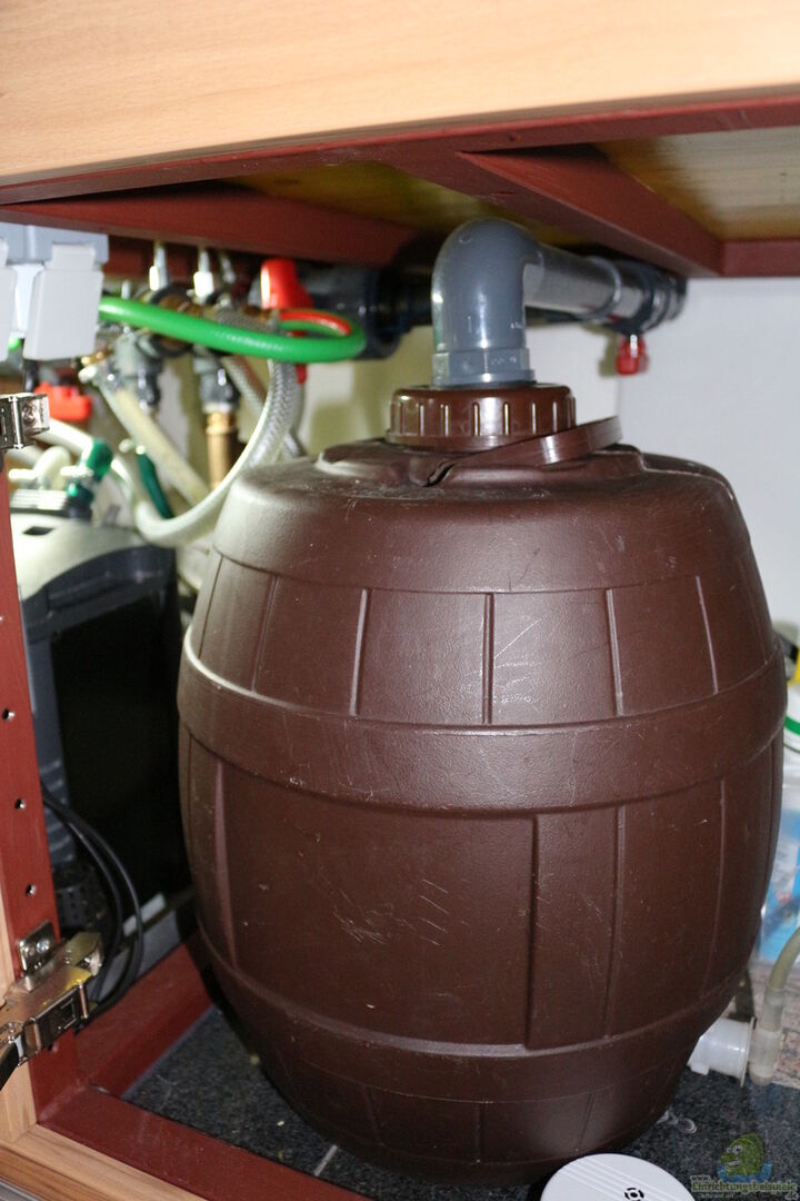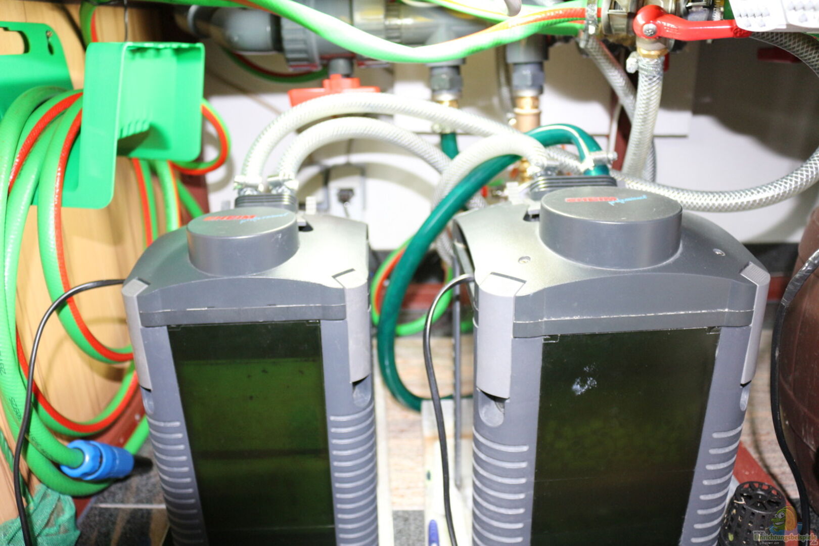 Zwei Eheim Aussenfilter (2224 und 2226), aufgrund der niedrigen Höhe des Unterschranks passen nur sehr niedrige Filter unter das Becken. Der Eheim 2224 wird demnächst durch einen zweiten Eheim 2226 ausgetauscht.