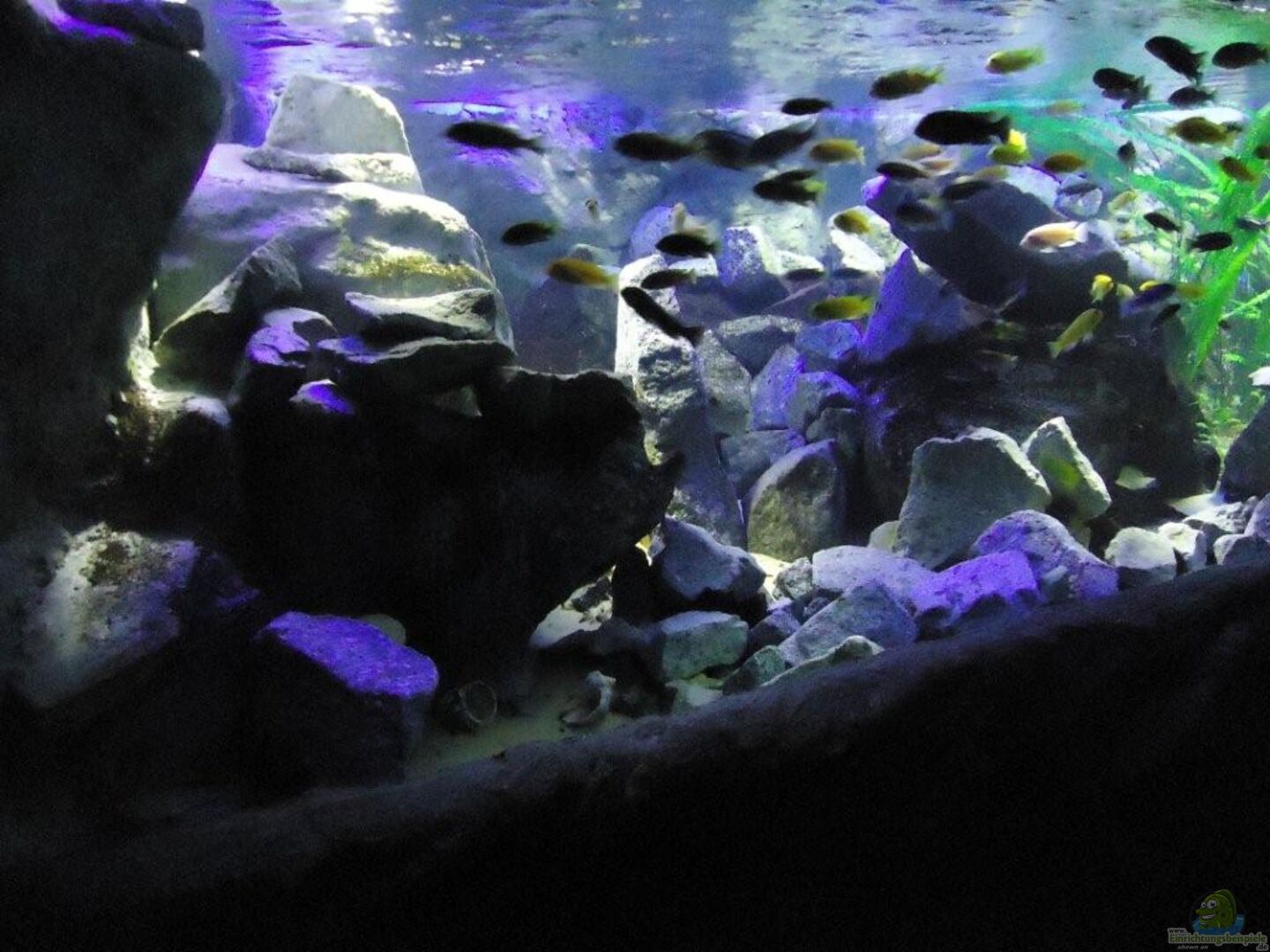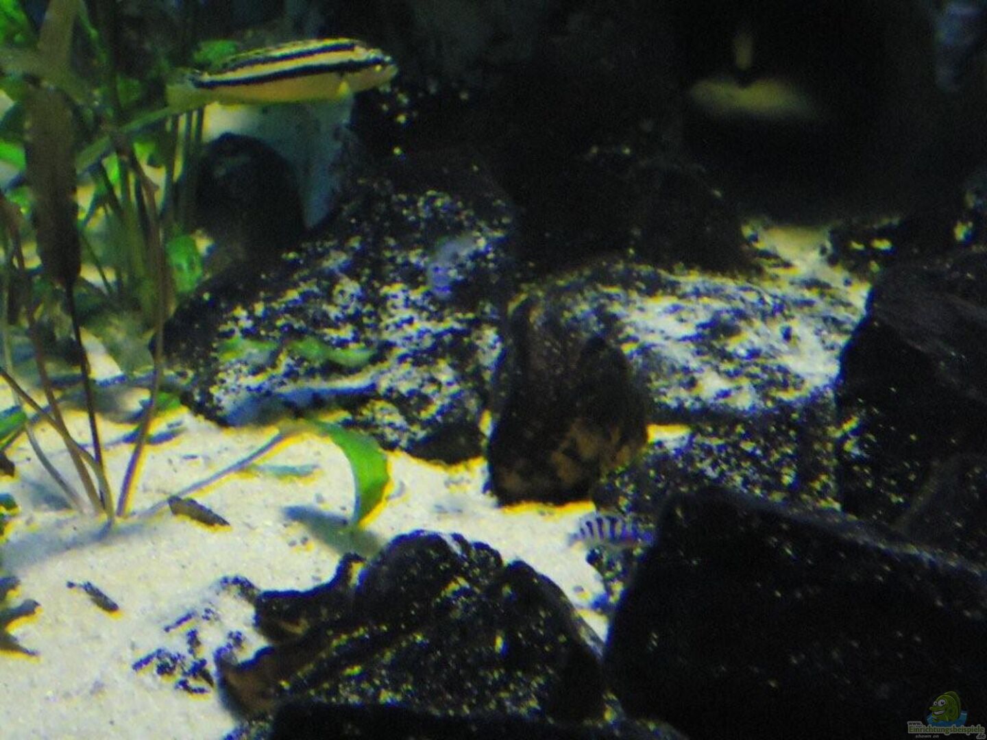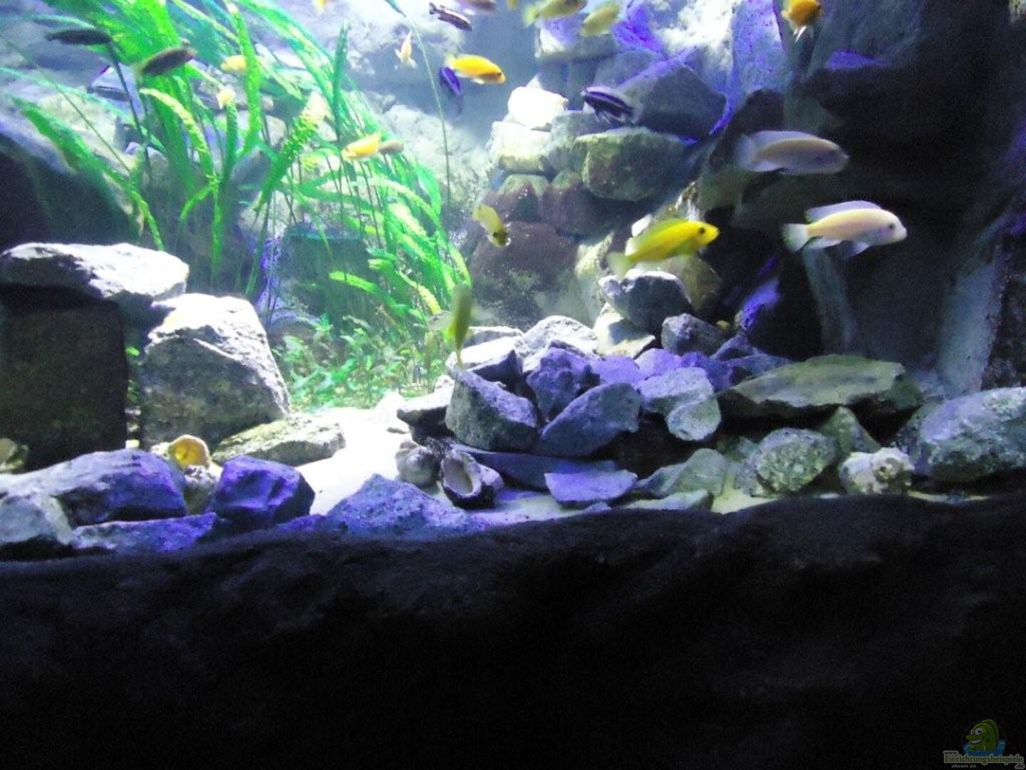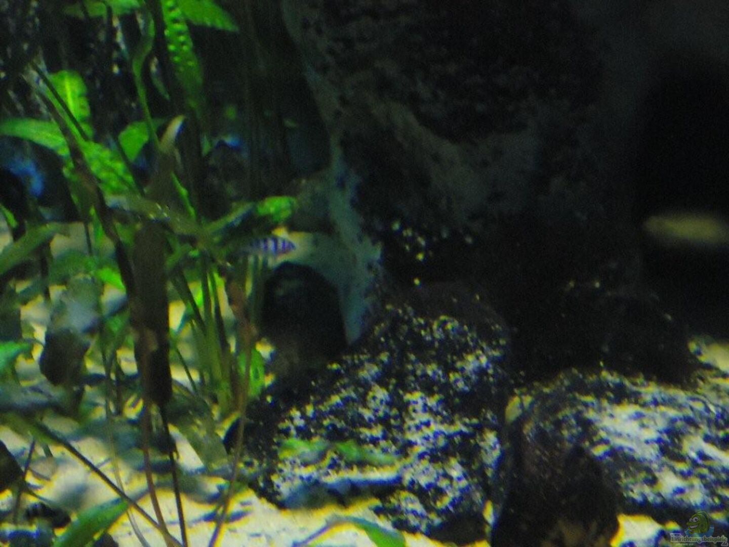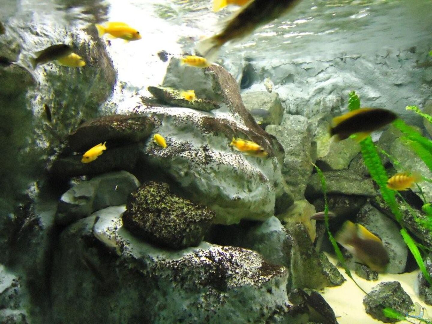 aufgrund der reichlichen Verstecke und Steinspalten immer wieder junge Mbunas nebenbei aufwachsen. Darum auf den Photos auch halbwüchsige Melanochromis maingano / auratus und Pseudotropheus estherae.