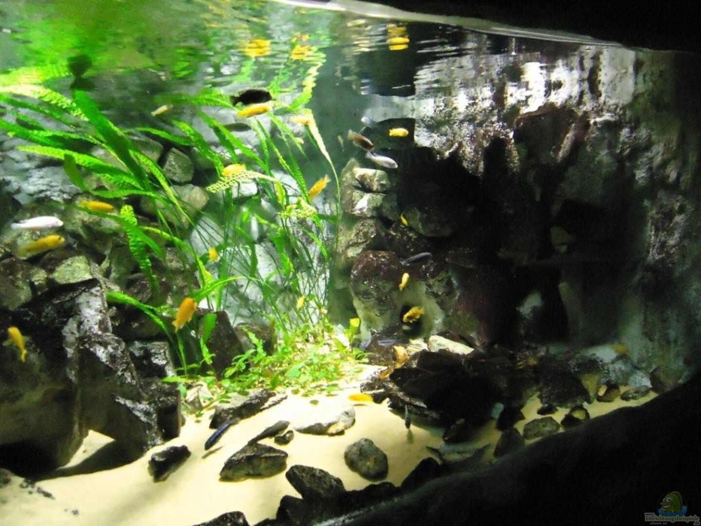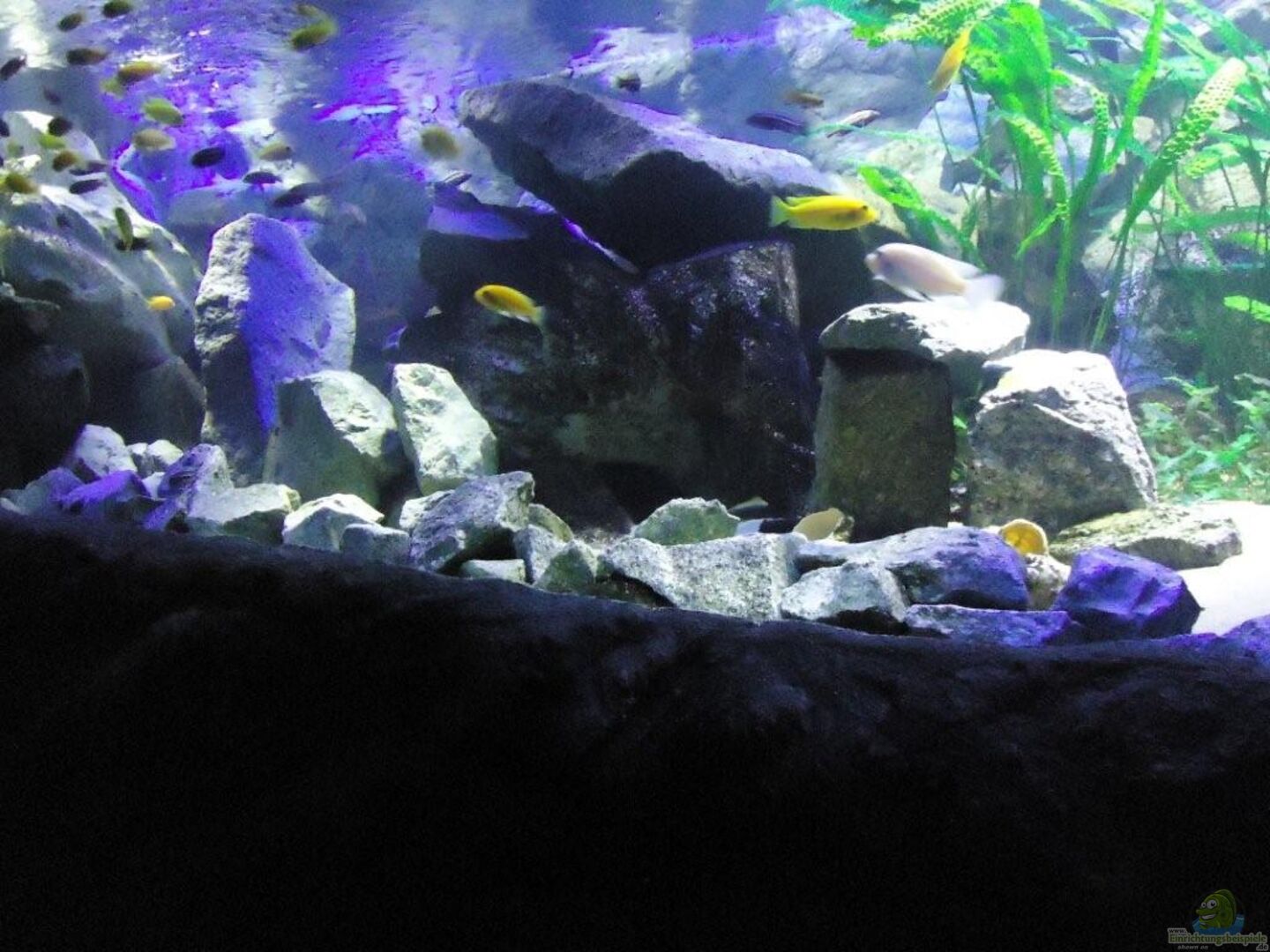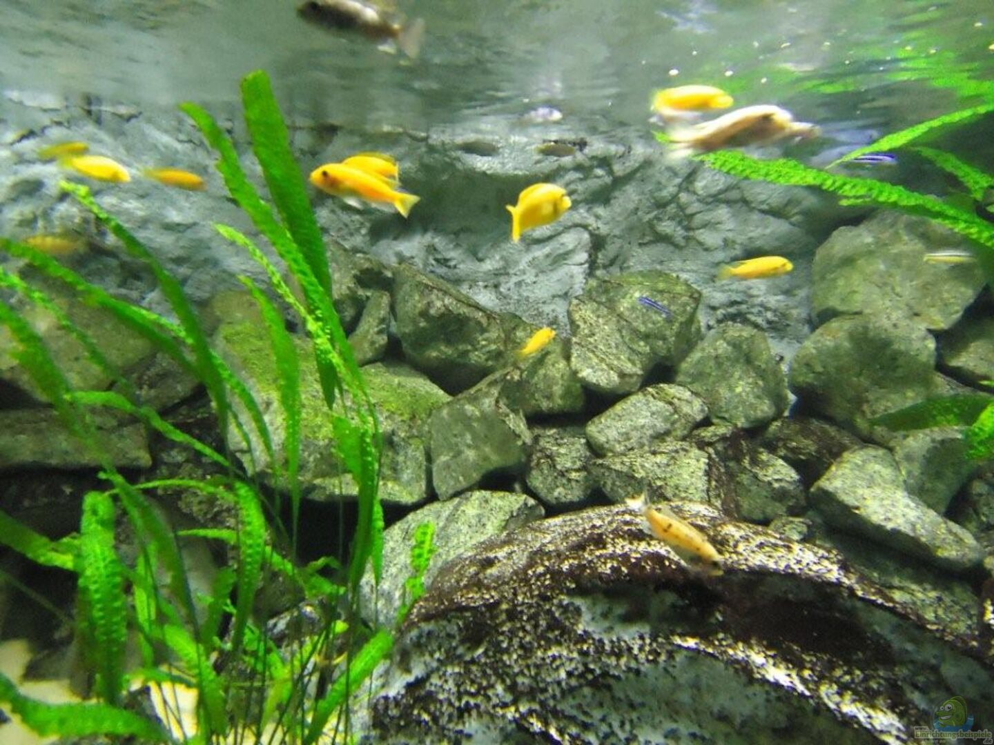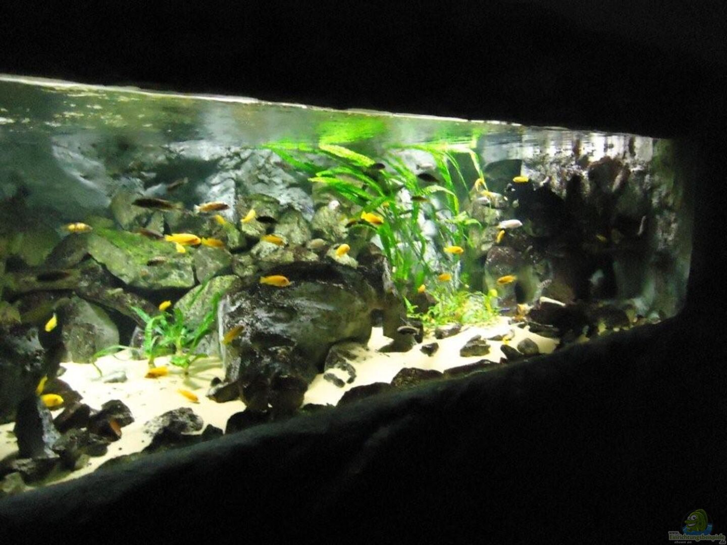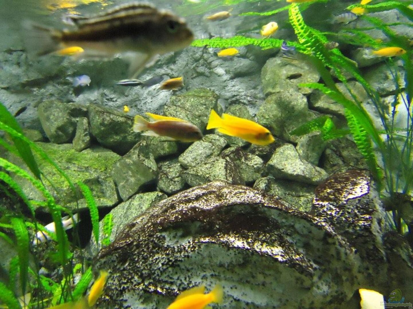 aufgrund der reichlichen Verstecke und Steinspalten immer wieder junge Mbunas nebenbei aufwachsen. Darum auf den Photos auch halbwüchsige Melanochromis maingano / auratus und Pseudotropheus estherae.