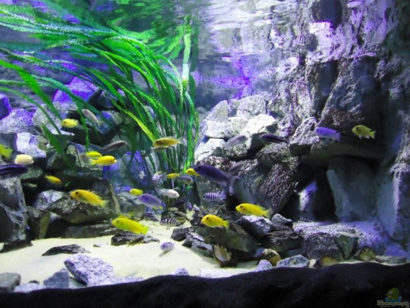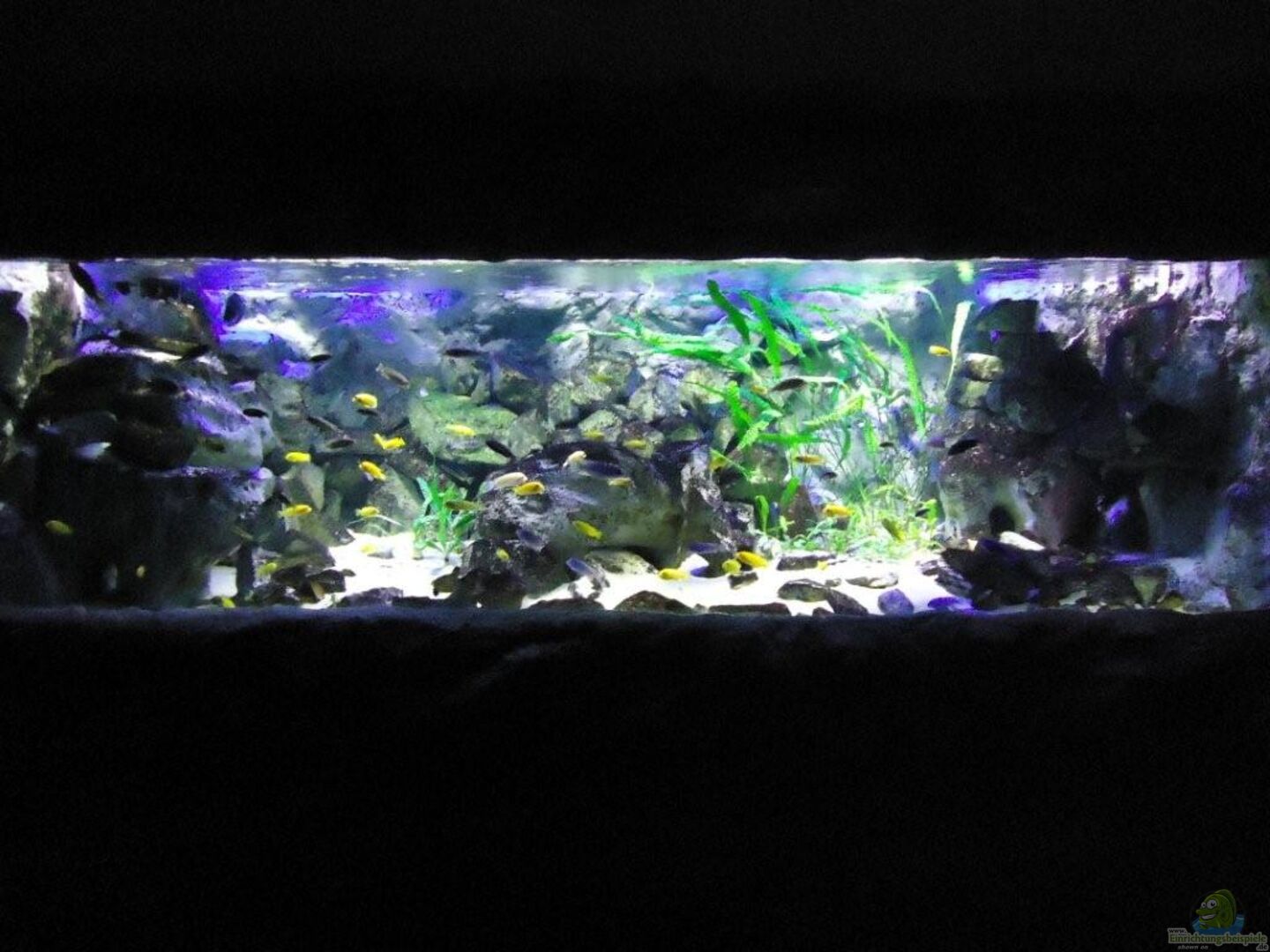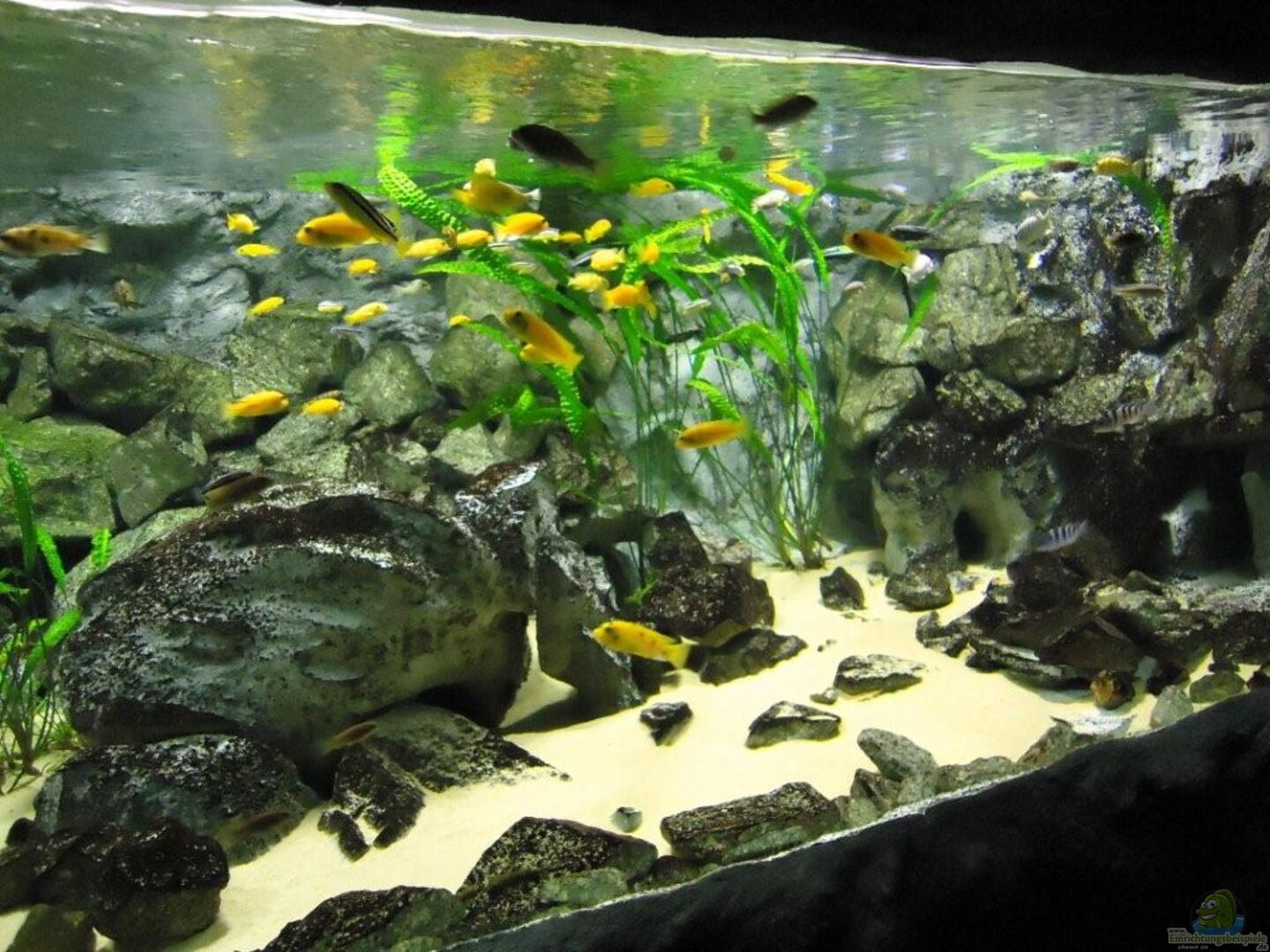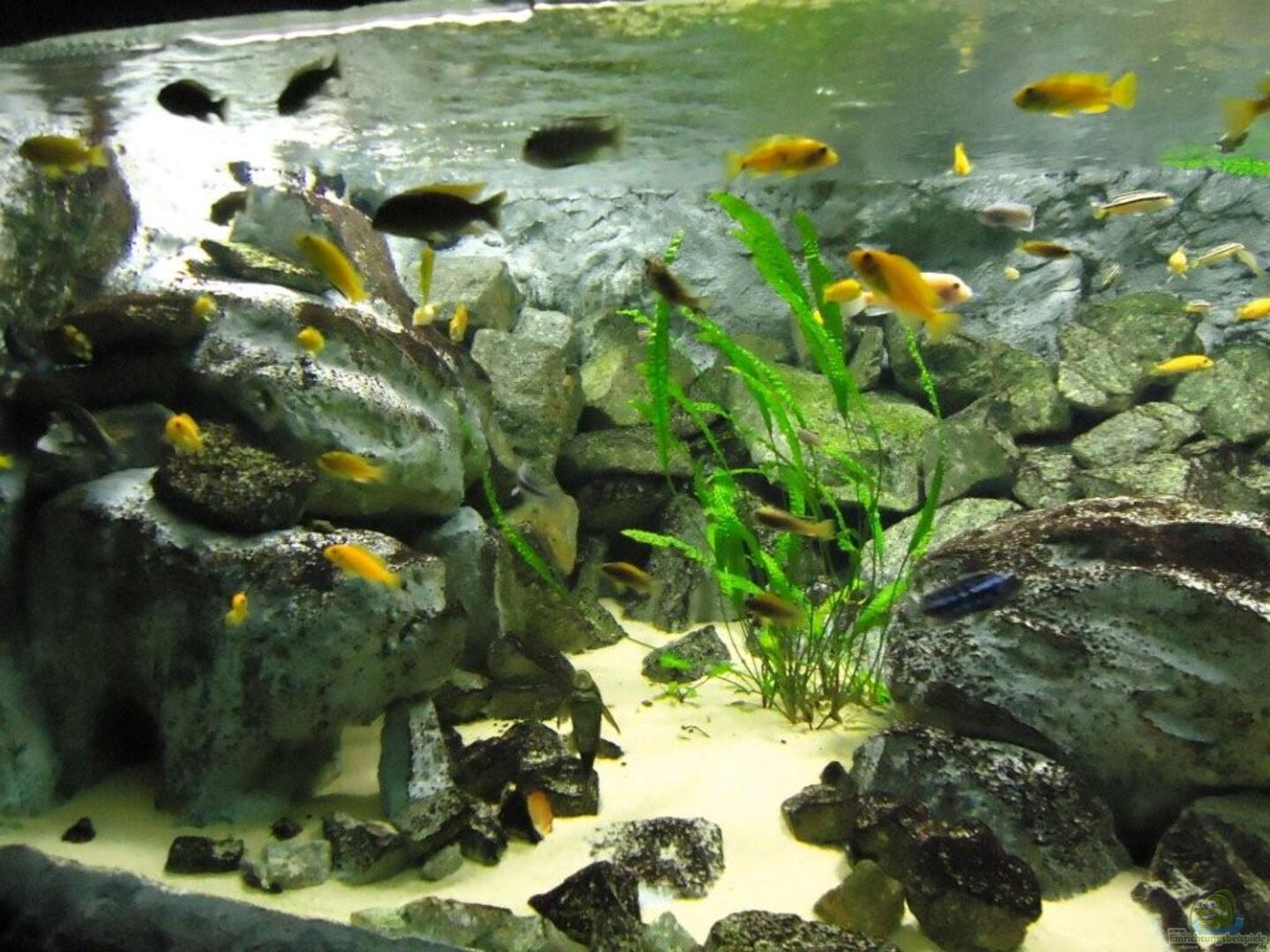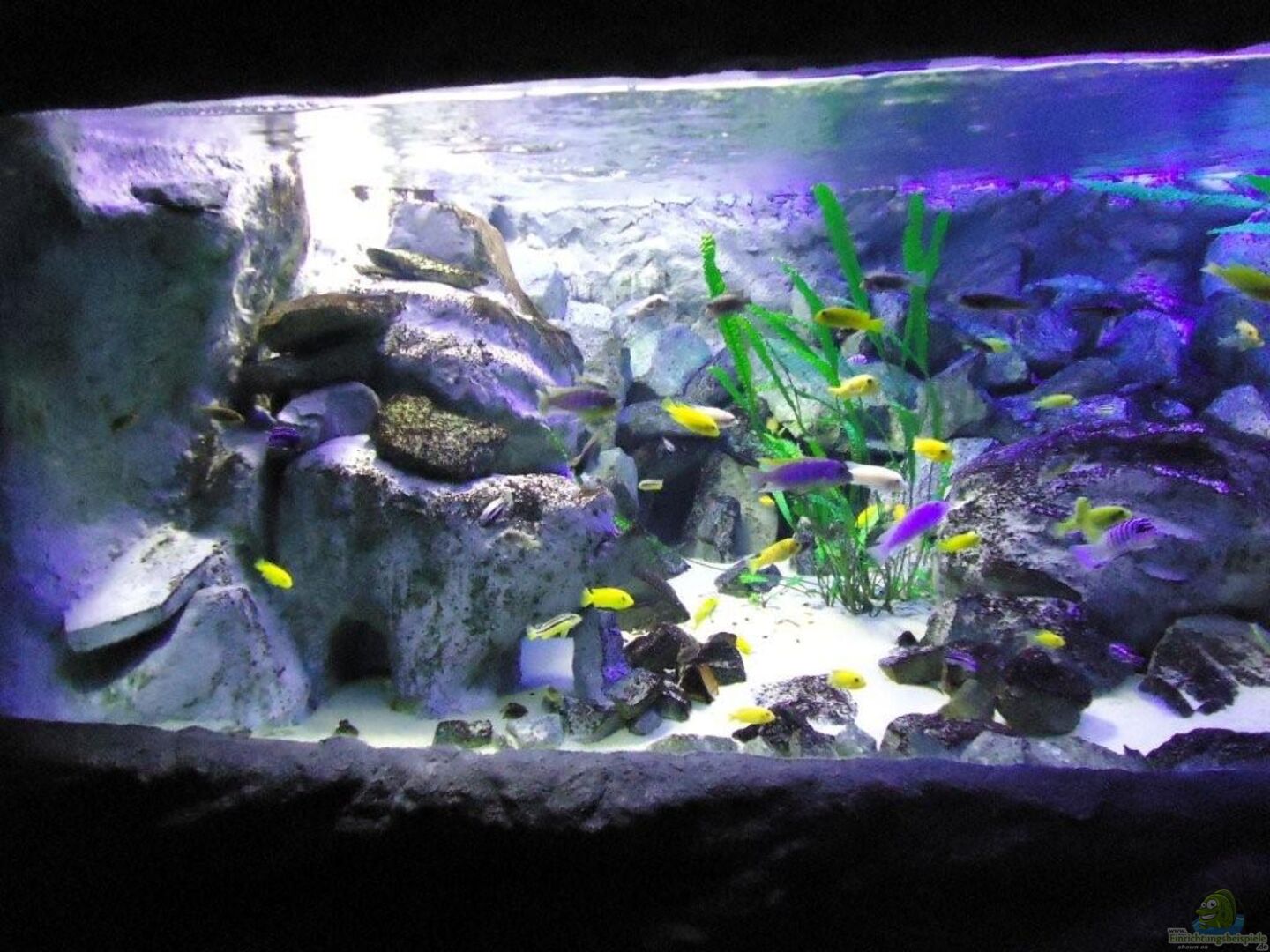 aufgrund der reichlichen Verstecke und Steinspalten immer wieder junge Mbunas nebenbei aufwachsen. Darum auf den Photos auch halbwüchsige Melanochromis maingano / auratus und Pseudotropheus estherae.