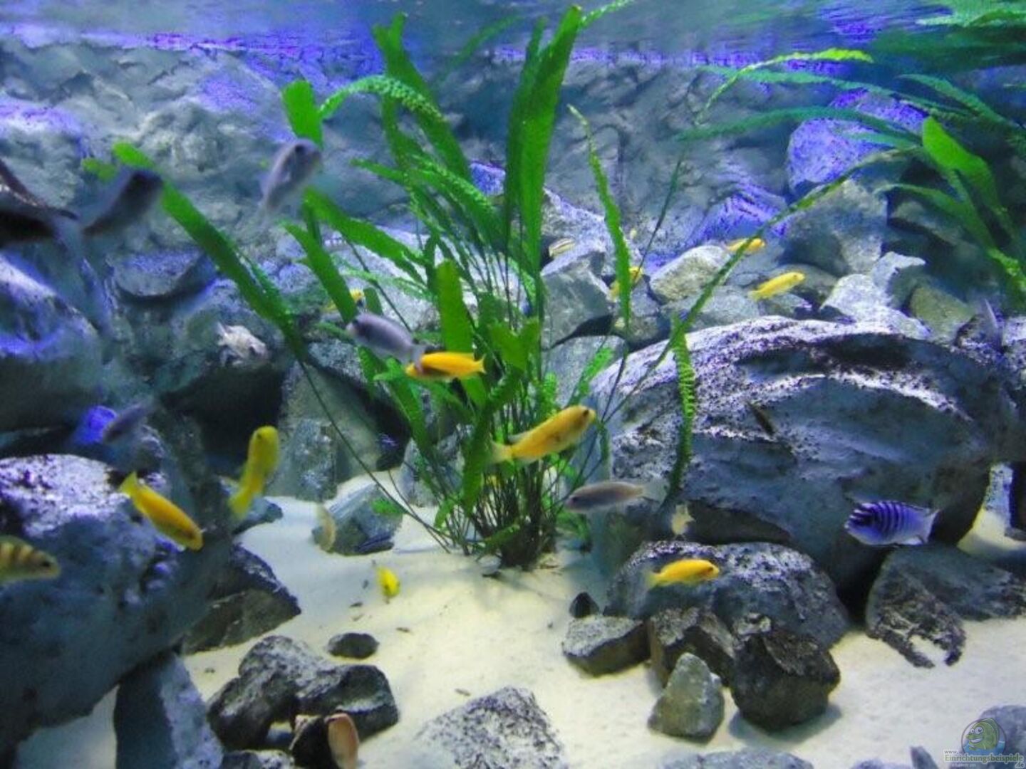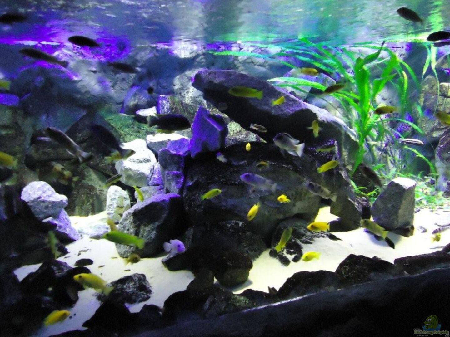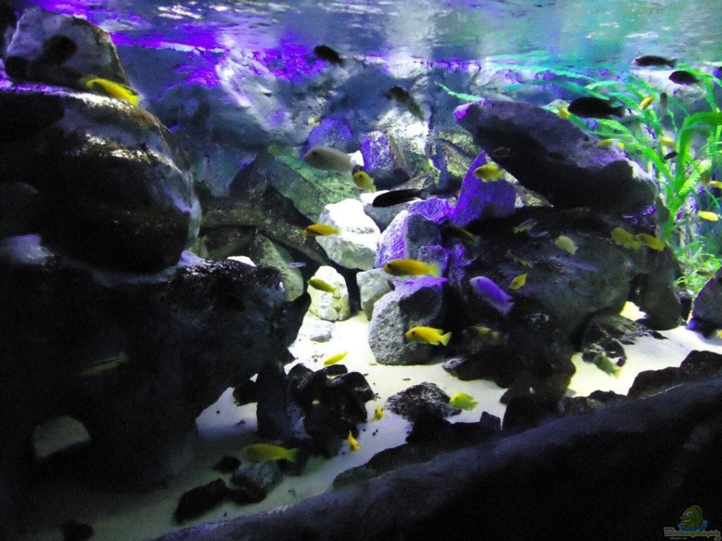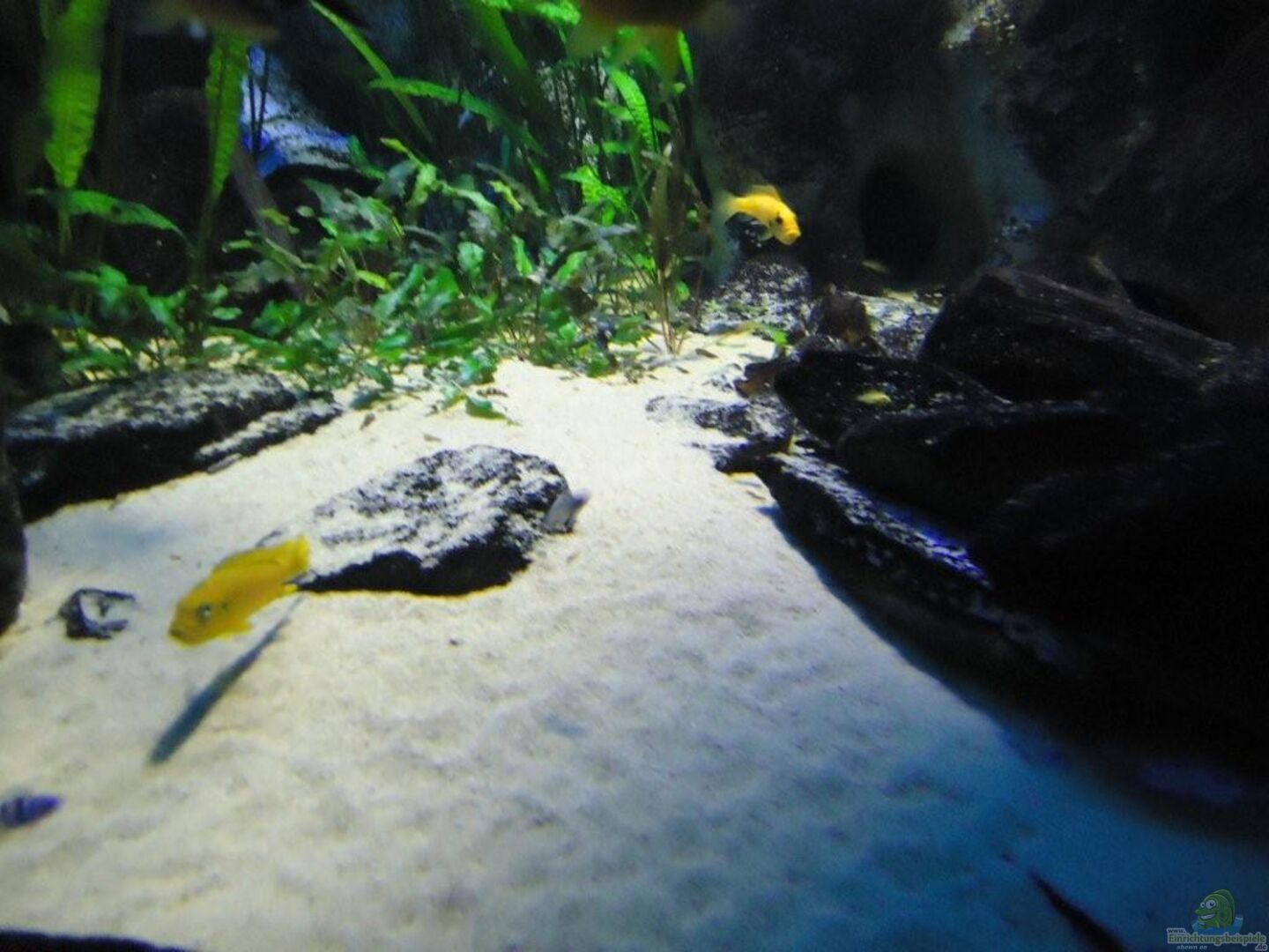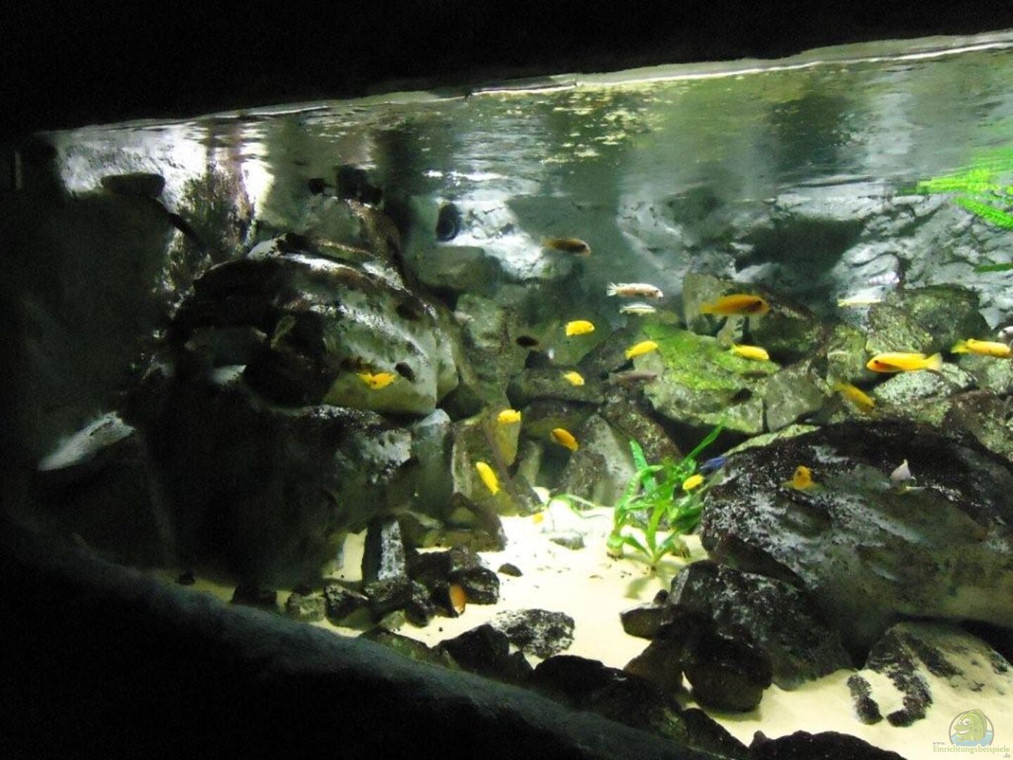 aufgrund der reichlichen Verstecke und Steinspalten immer wieder junge Mbunas nebenbei aufwachsen. Darum auf den Photos auch halbwüchsige Melanochromis maingano / auratus und Pseudotropheus estherae.