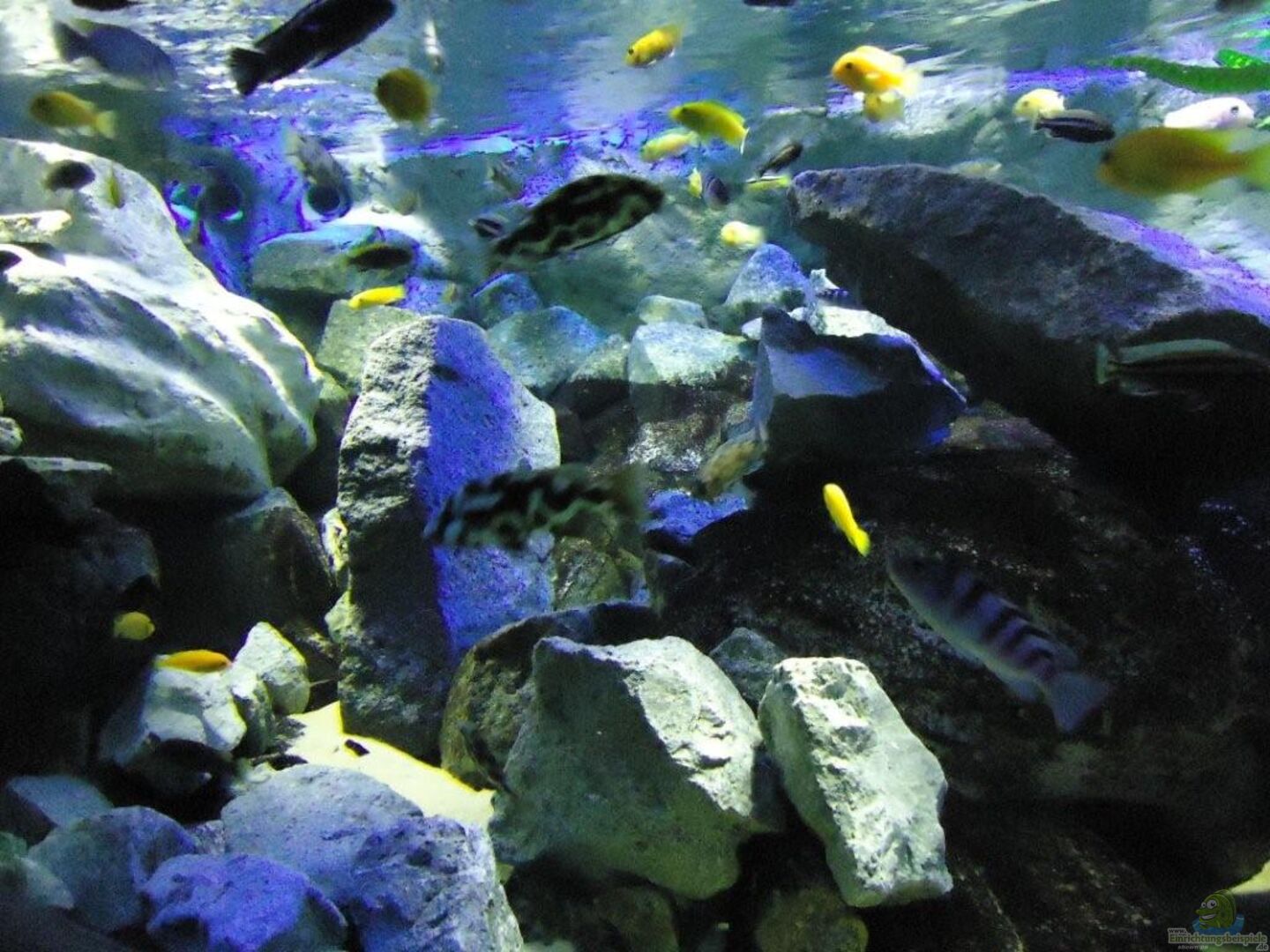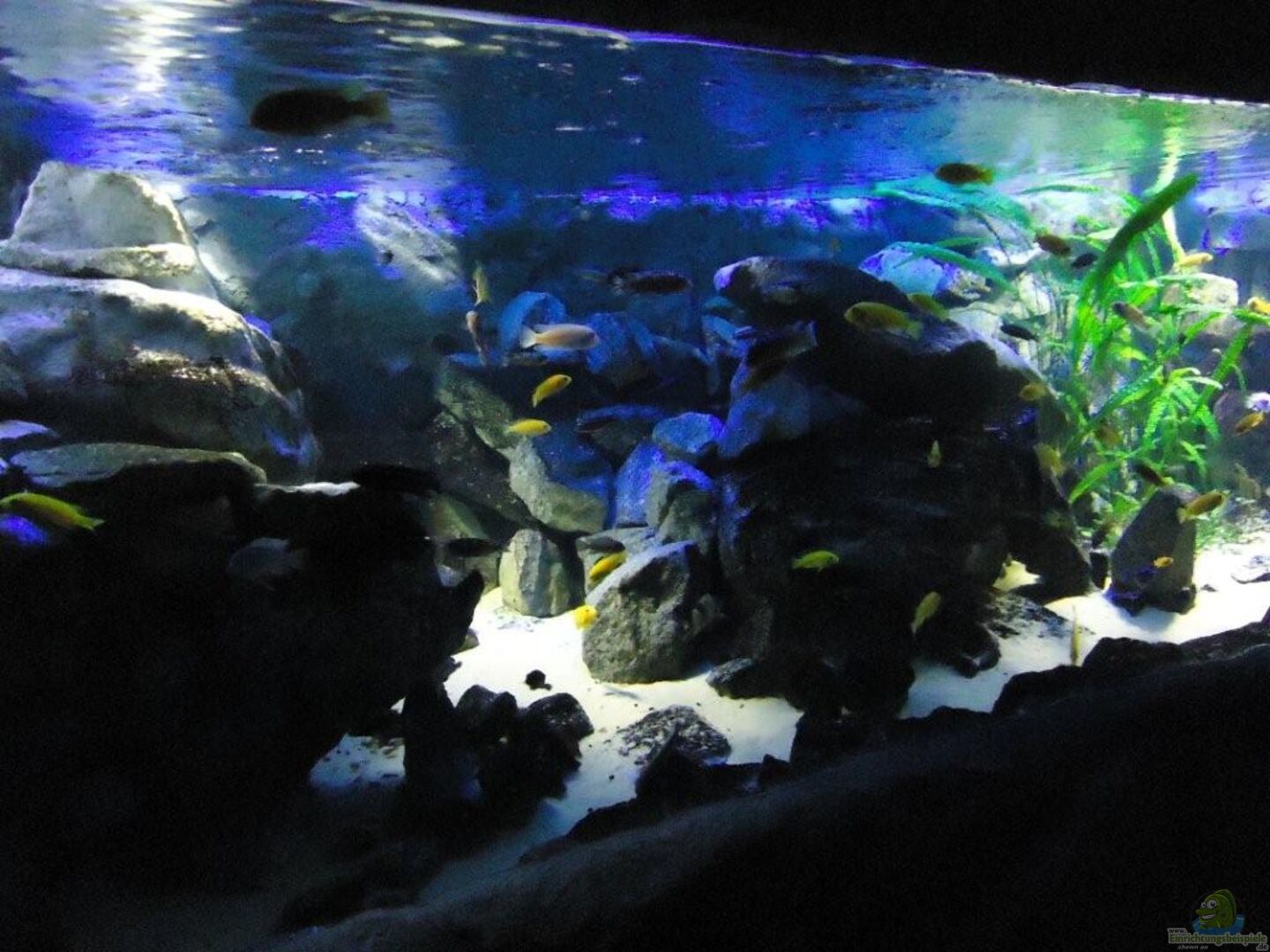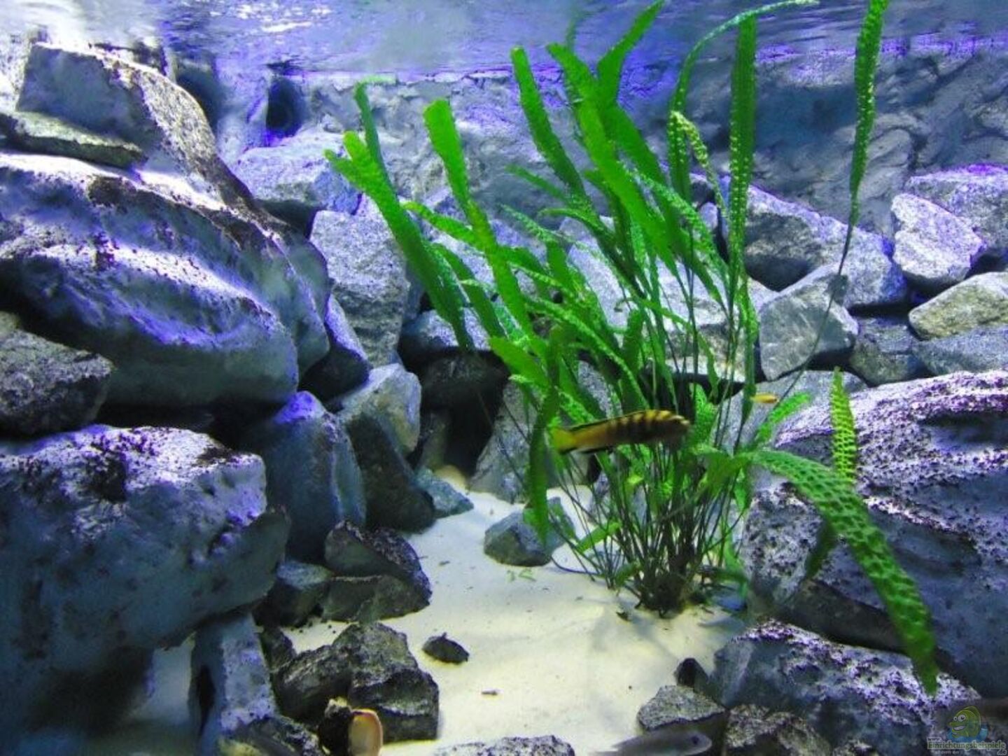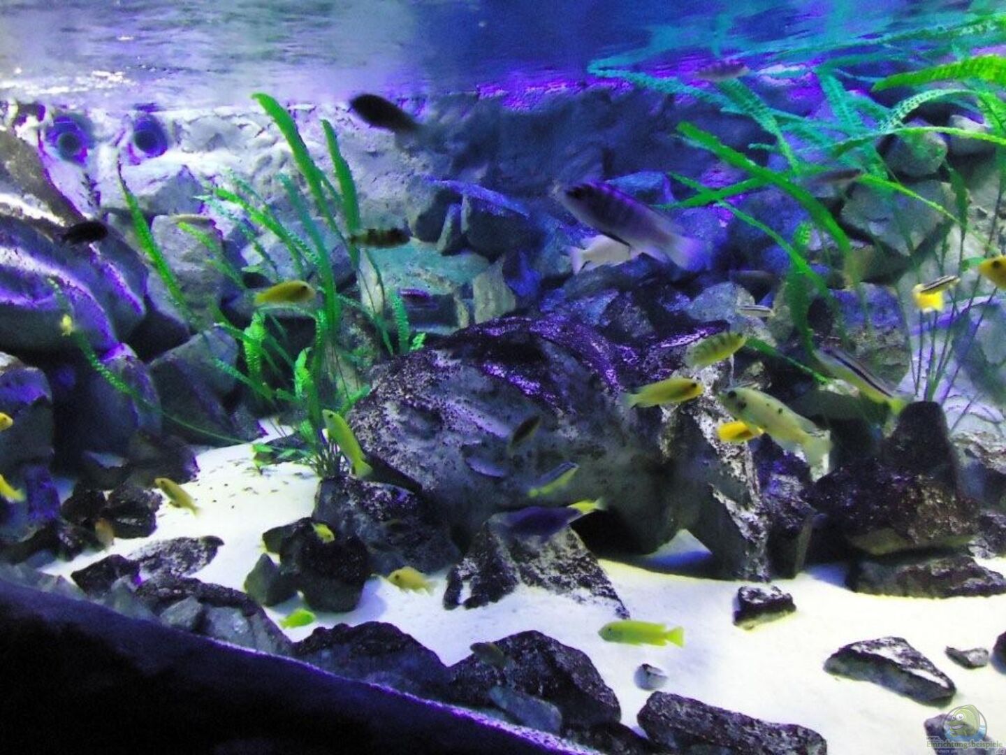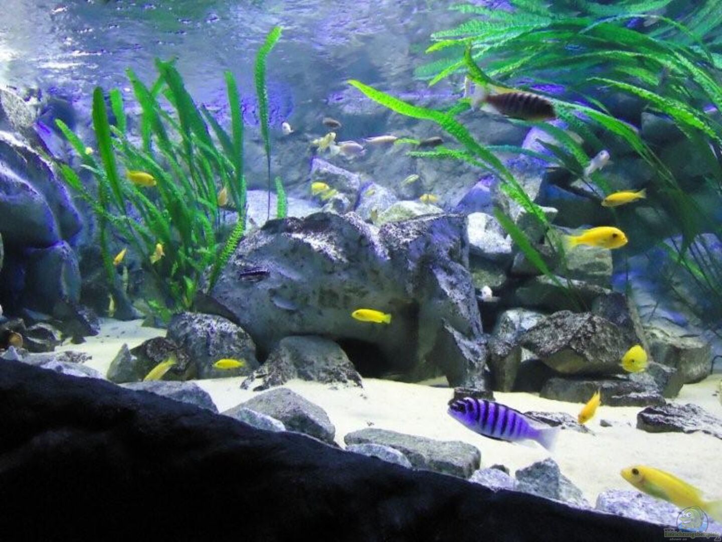 aufgrund der reichlichen Verstecke und Steinspalten immer wieder junge Mbunas nebenbei aufwachsen. Darum auf den Photos auch halbwüchsige Melanochromis maingano / auratus und Pseudotropheus estherae.