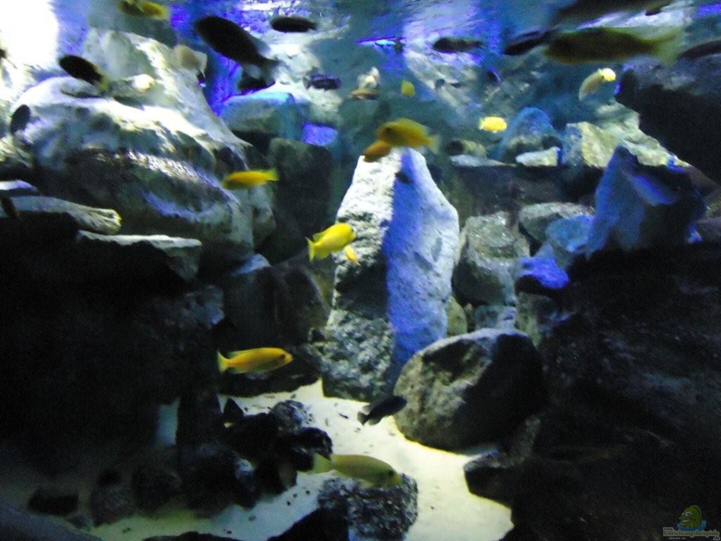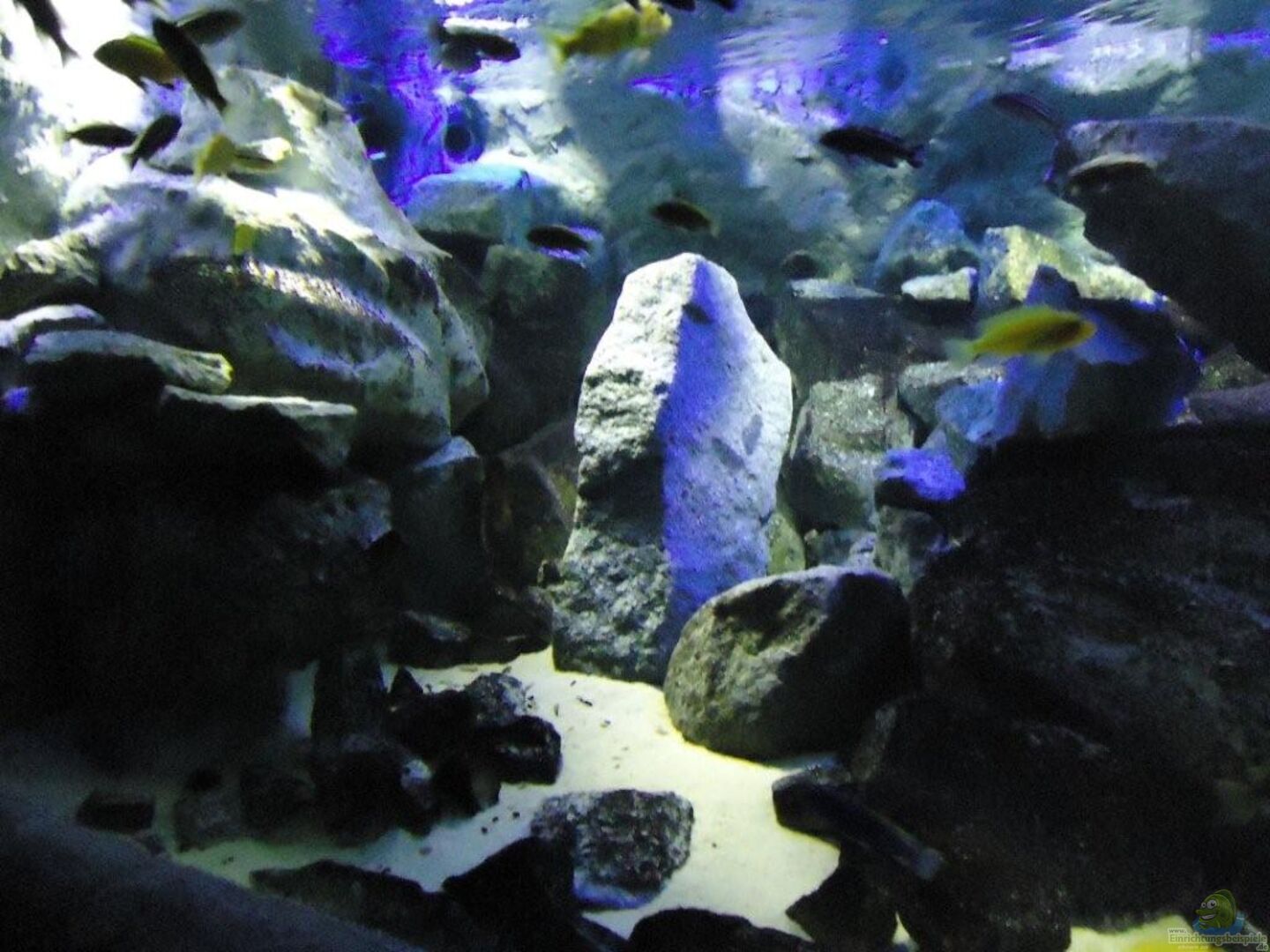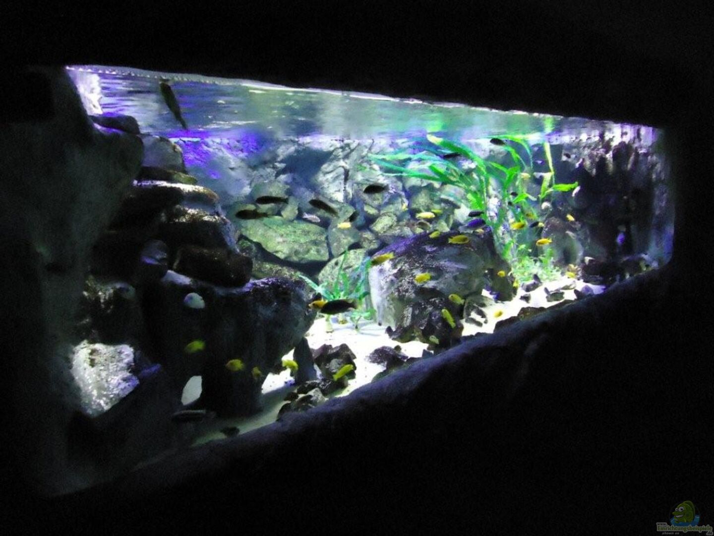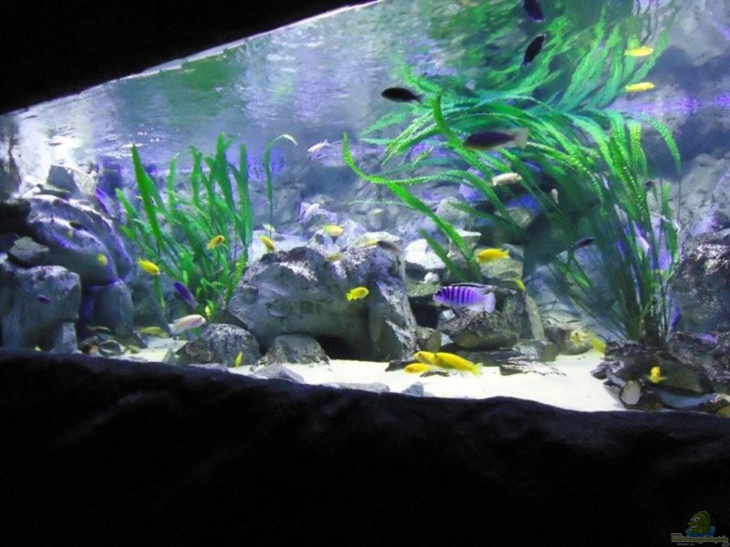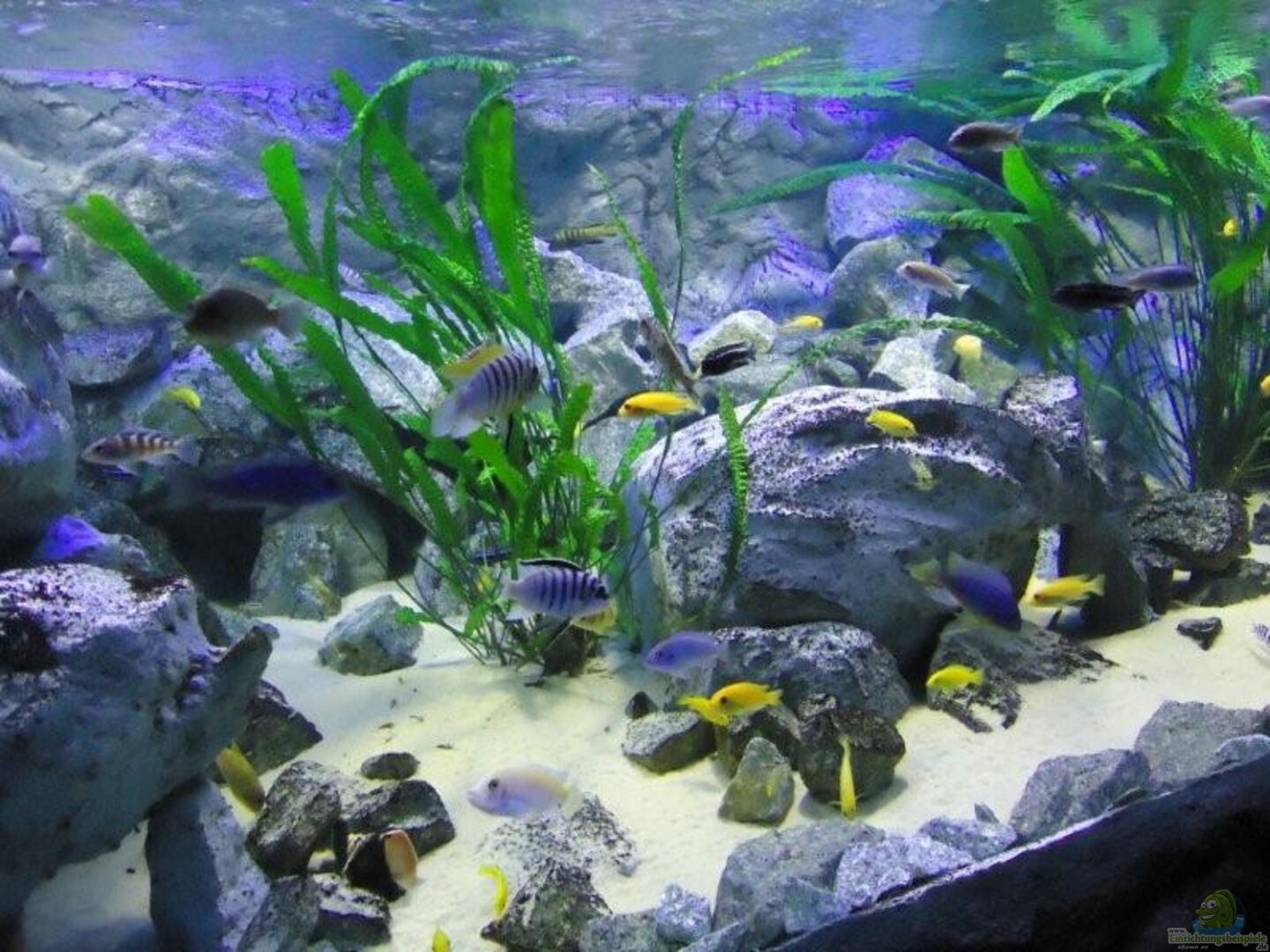 aufgrund der reichlichen Verstecke und Steinspalten immer wieder junge Mbunas nebenbei aufwachsen. Darum auf den Photos auch halbwüchsige Melanochromis maingano / auratus und Pseudotropheus estherae.