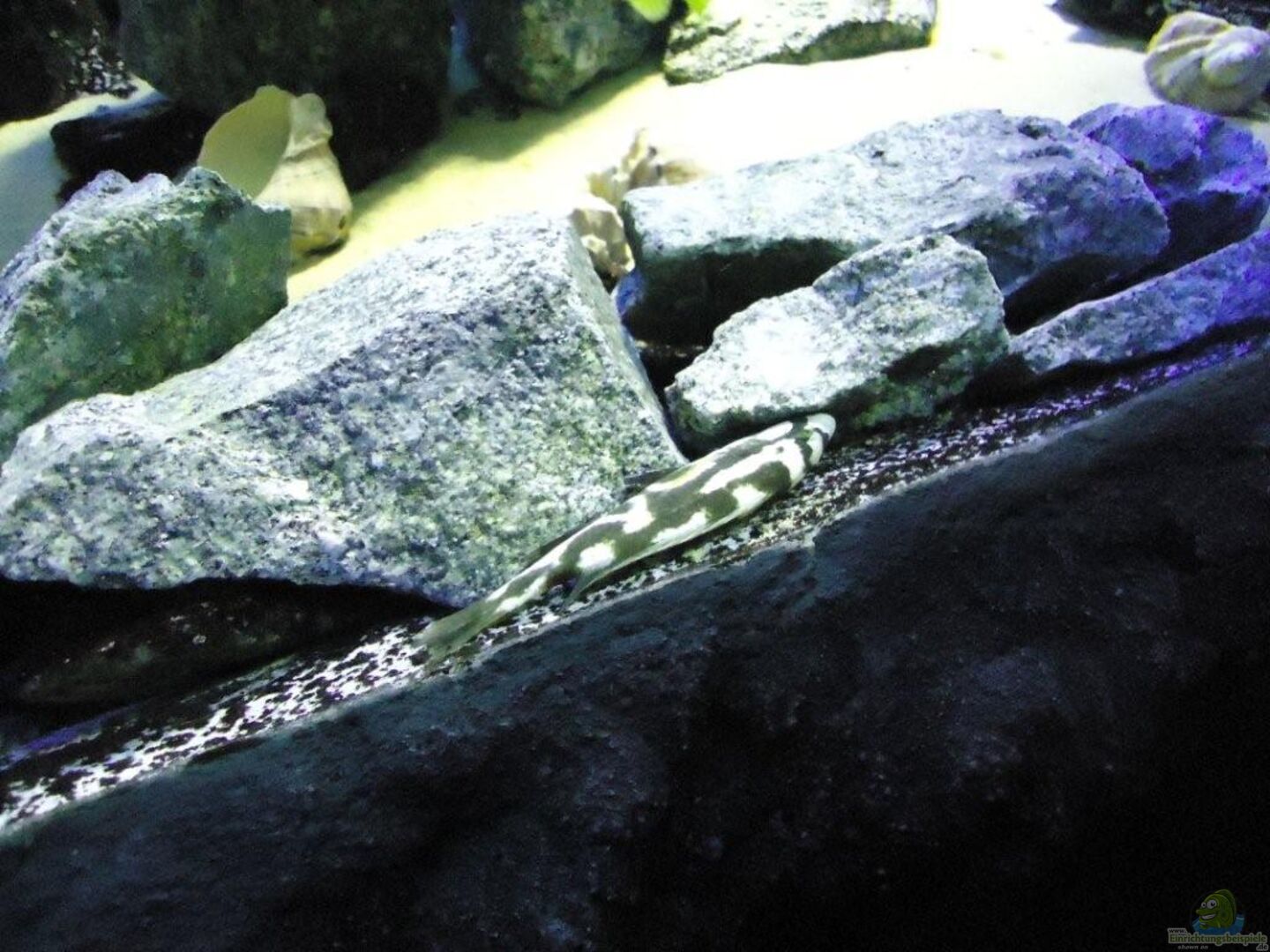 Zentral im Becken ein gro??er, modellierter Felsblock mit einer Höhle, wird an der Oberfläche aufgrund des Aufwuchses gerne abgeweidet. Darüber liegt ein 70cm gro??er, länglicher Granitfelsen.
