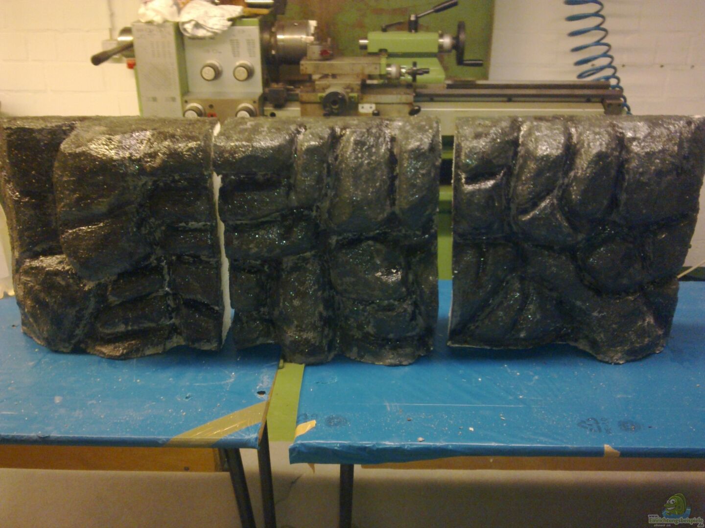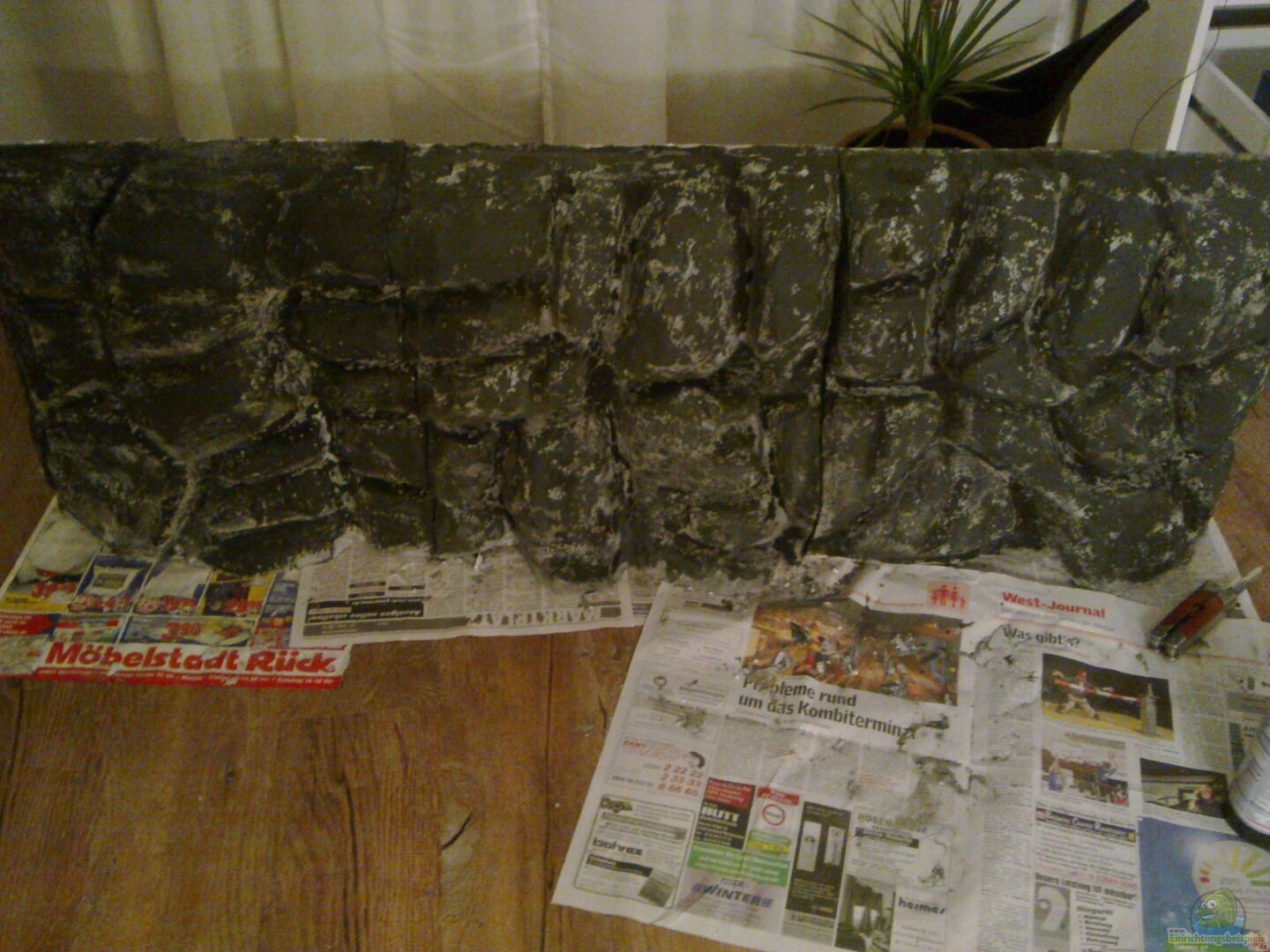 Anschlie??end wurde die Wand mit einem Putz überstrichen und mit Abtönfarbe bemalt. Nachdem die Wand trocken war erfolgte die Behandlung mit einem Epoxitharz. Dabei konnte ich auf die Erfahrung einer bereits von mir gestalteten Rückwand zurückgreifen (dazu sei gesagt, dass es nie Probleme bezüglich einer möglichen Vergiftung der Fische durch den Harz gekommen ist). Die Wand wurde anschlie??end zwei Wochen liegen gelassen um "auszudampfen".