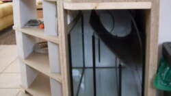 Der Unterschrank ist ein Eigenbau aus Spanplatten und Ytong-Steinen , verkleidet mit Gipsplatten (grün) , nach dem verspachteln mit Streichputz gestrichen und zum Teil mit Antik-Bruchsteinen verkleidet.