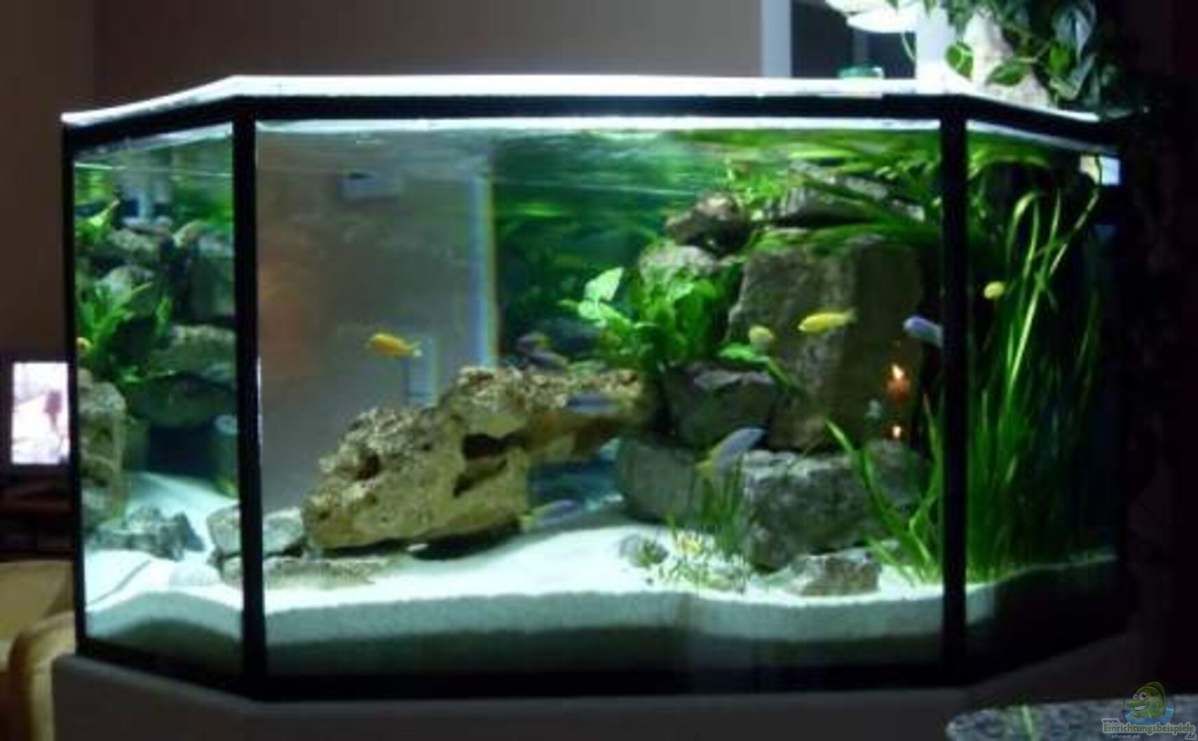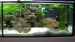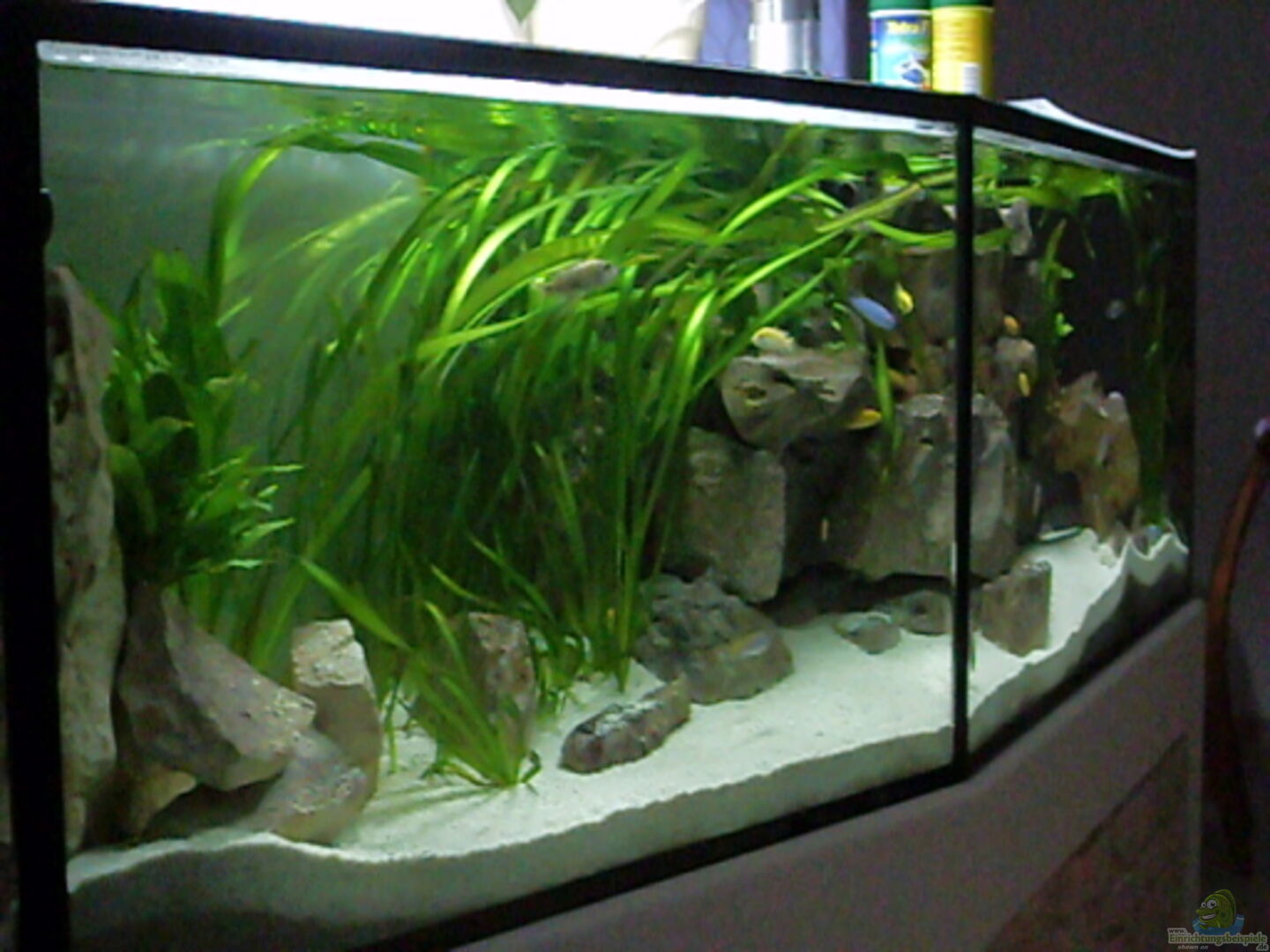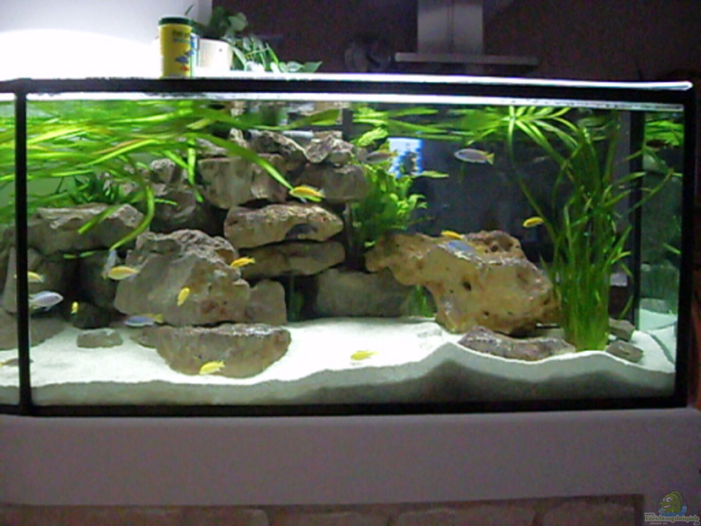 Der Aquarienboden wurde mit 20mm Styropor ausgelegt , darauf eine Kofferraumladung Kalksandstein aus einem nahe gelegenen Steinbruch im Bliesgau . Aufgefüllt mit 75 Kg feinem hellem Sand aus dem Aquarienhandel.