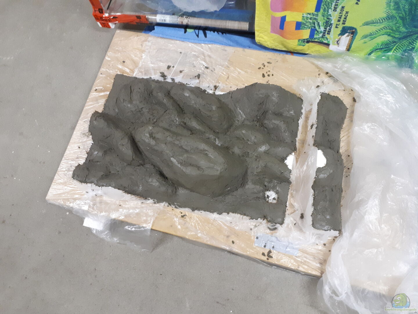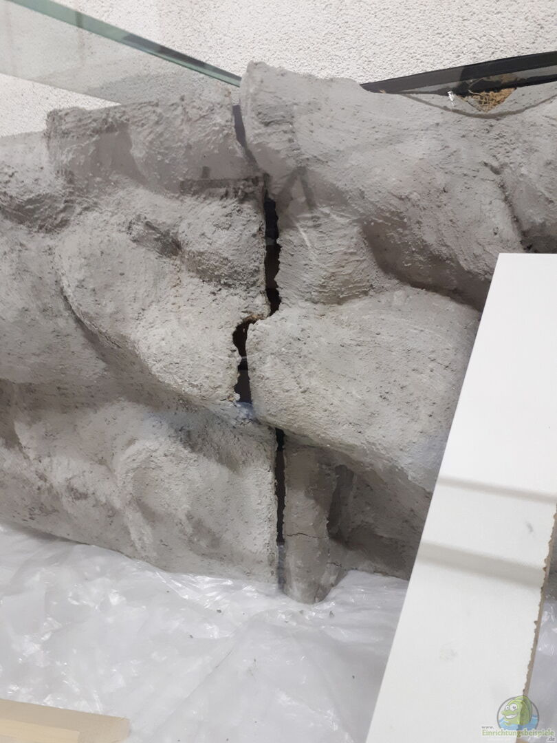 Zuerst musste der Mehrkammerfilter eingeklebt werden. Dazu wurden Plexiglasscheiben zugeschnitten und mit einem trinkwassertauglichen SIKA Kleber eingeklebt. Dann kam die grösste Arbeit: die selbst erstellte 3d-Rückwand. Nach vielem Styropor schneiden, Beton anmischen und verteilen und Wartestunden zum Austrocknen war die Rückwand im rohen Zustand fertig. Danach wurde sie mit Abtönfarbe gefärbt und mit Epoxidharz überzogen. Ich musste sie dreiteilig erstellen, damit sie nicht zu schwer und zu gross war, um sie ins Becken zu heben. Die Fugen wurden mit Aquariumsilikon zugemacht und anschliessend zugemörtelt und ebefalls gefärbt und beschichtet. Nach einigen Wochen bewässern kam dann die Einrichtung.