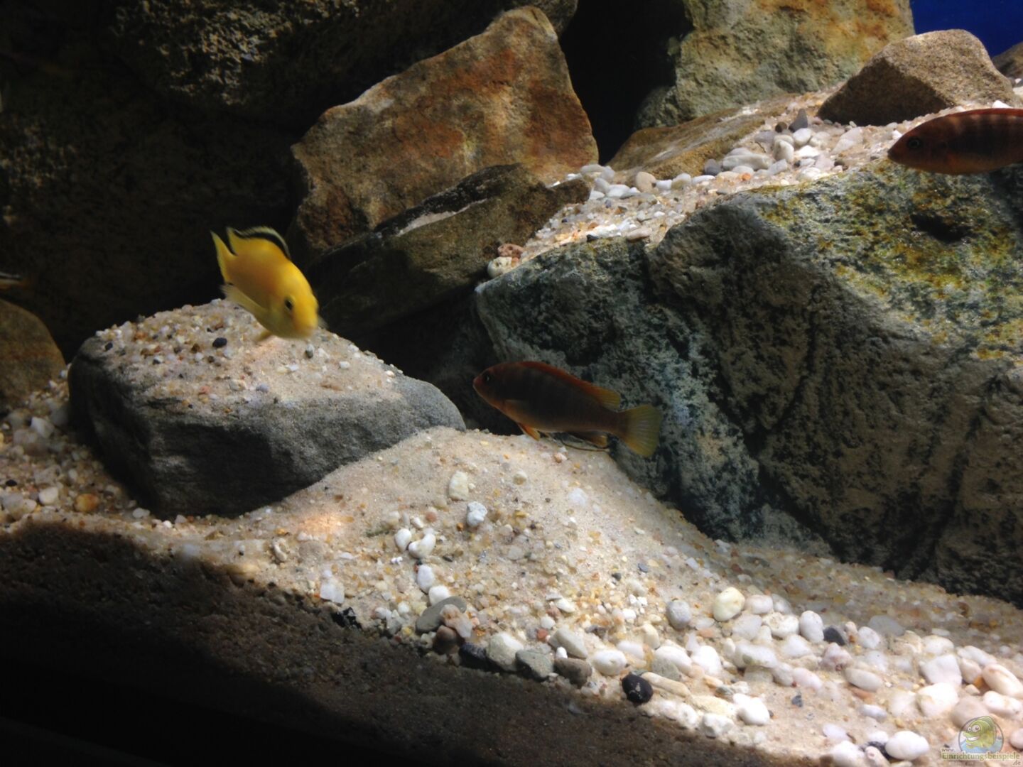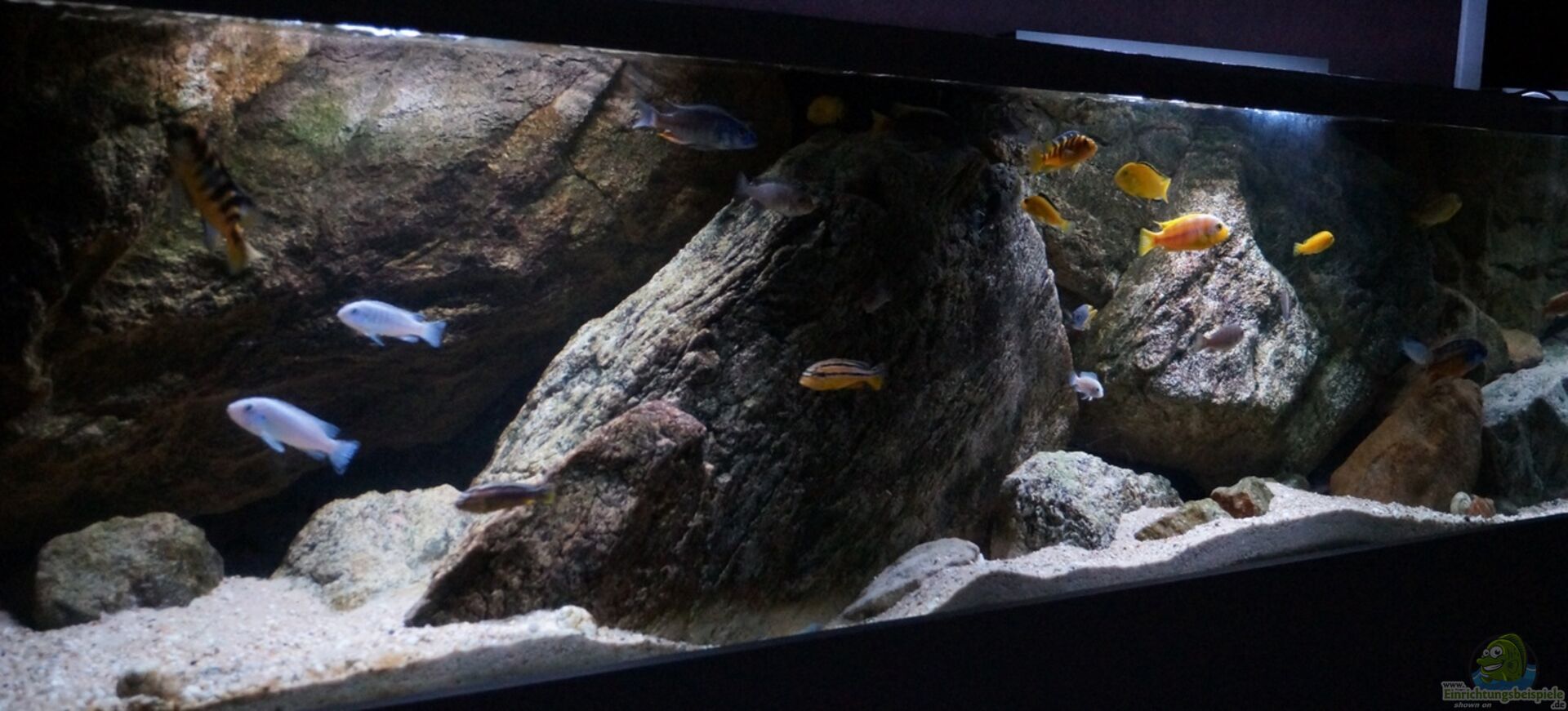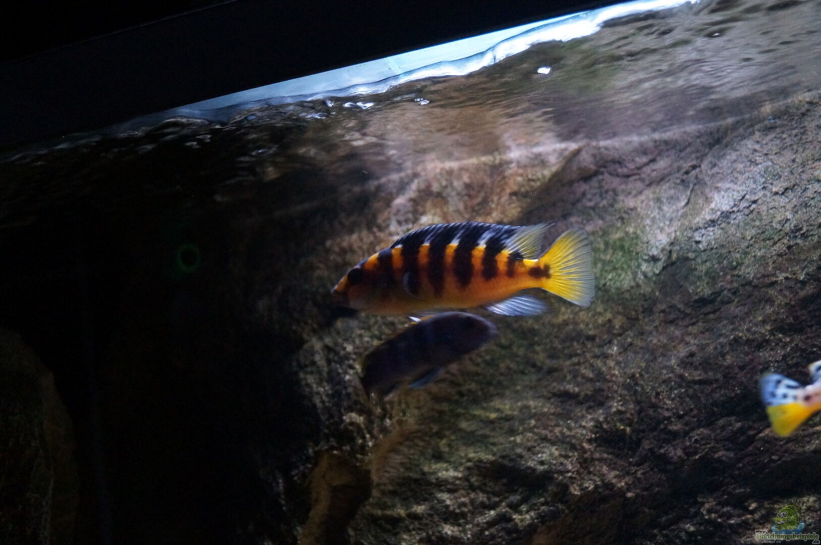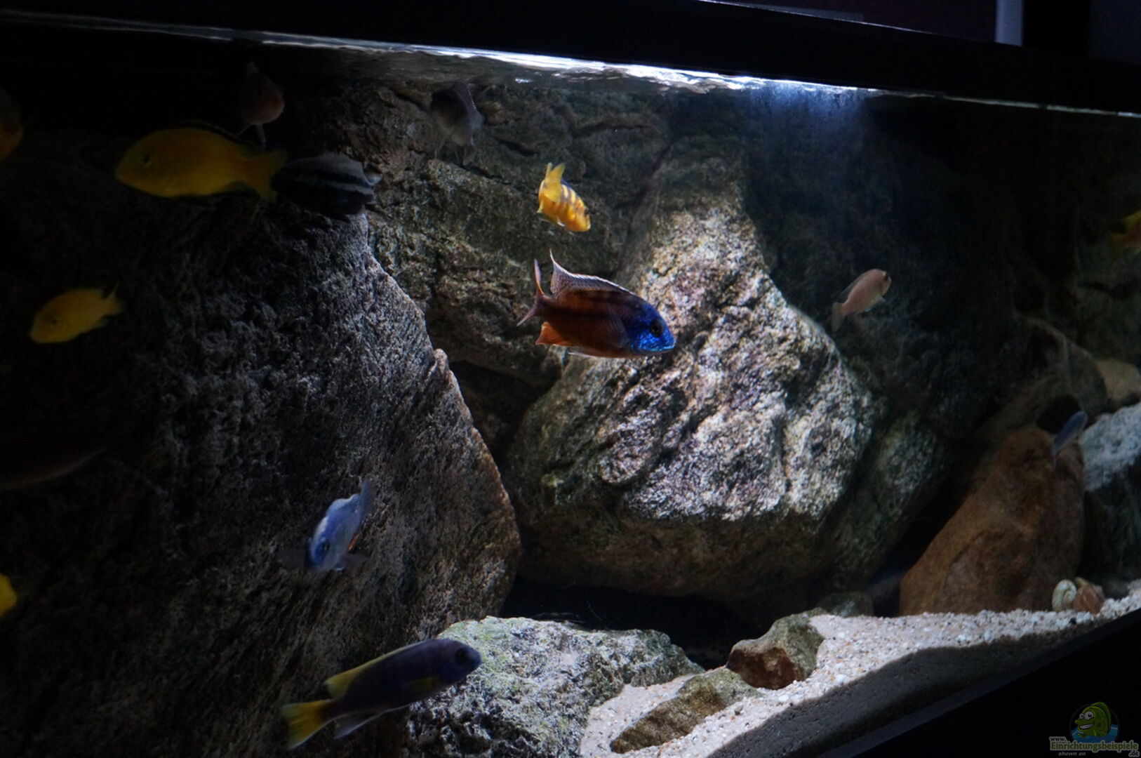 Aggressionen sind kaum vorhanden, so dass sogar der L. Mbamba Bay, der ja eher durchsetzungs-schwach ist, in voller Ausfärbung durch das Becken schwimmt und den Weibchen nachstellt. Das Becken läuft seit Dezember 2013.