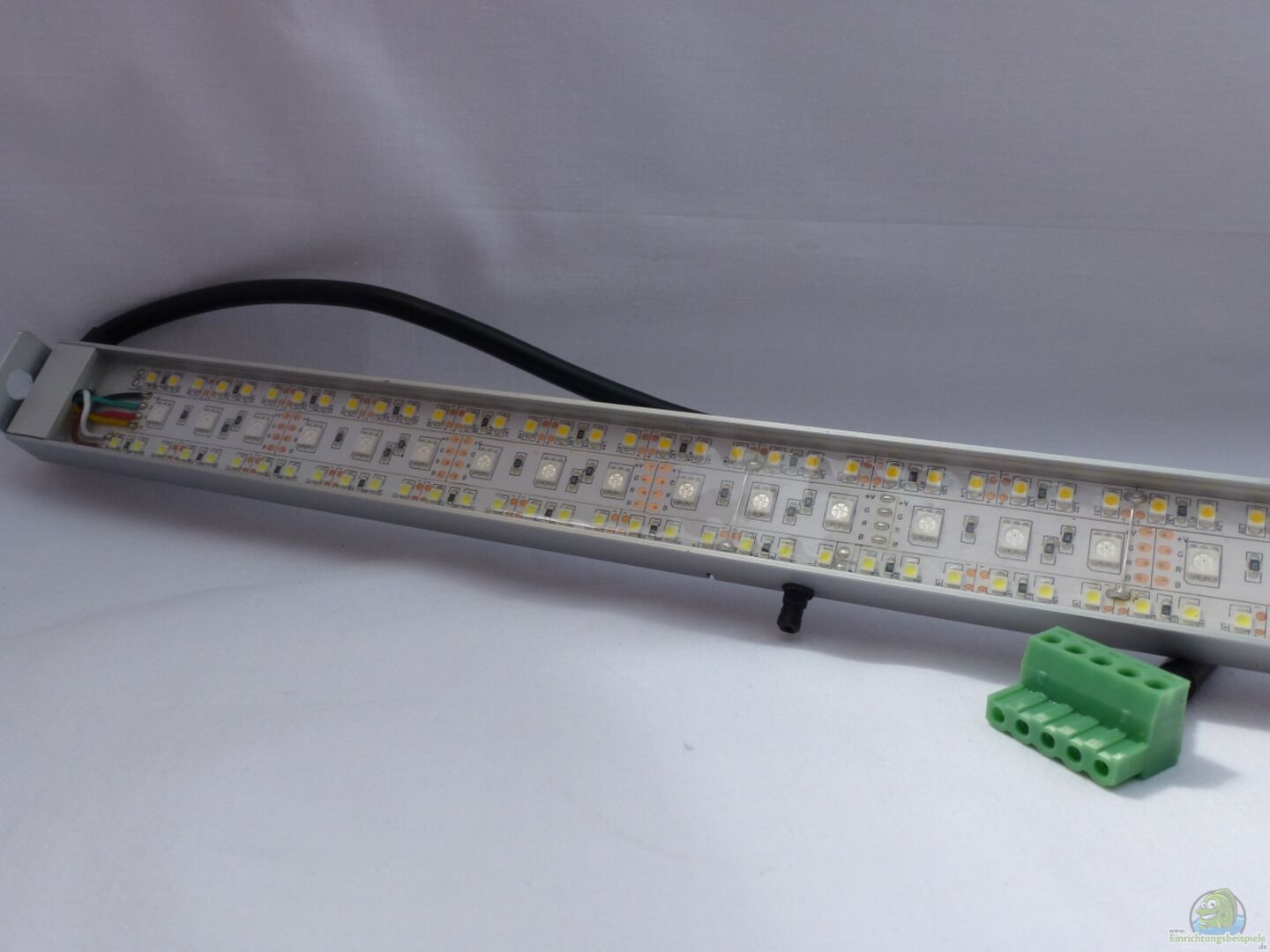 Um die Zeit bis zur Lieferung zu überbrücken, stelle ich ein paar Bilder unter Technik ein. Hierbei handelt es sich um den Lumlight LED Leuchtbalken (140cm), ich konnte nicht widerstehen und hatte die Version mit Wasserkühlung gekauft. In den ersten Testphasen der Beleuchtung und Simulation von Tagesabläufen wurde der Leuchtbalken gerade einmal handwarm. Evtl. steigt die Temperatur, wenn der Leuchtbalken in die Aquariumabdeckung integriert wird. Ob ich die Wasserkühlung als Bypass an die Pumpe anschlie??e, werde ich noch entscheiden.