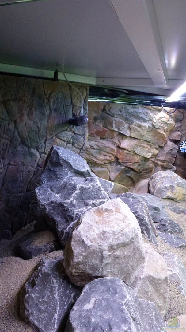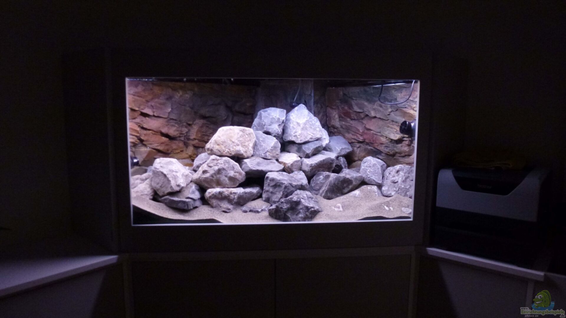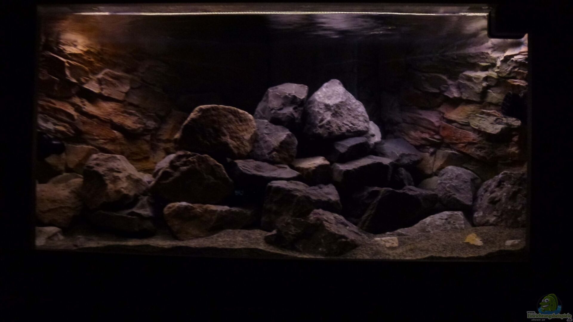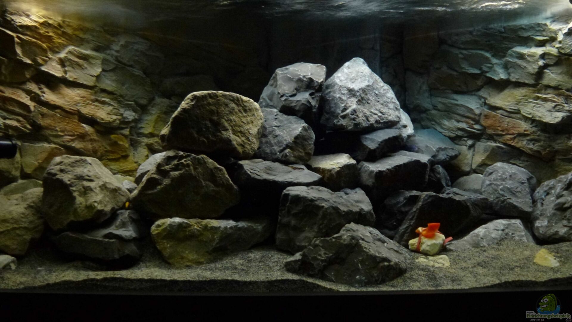 Als Bodengrund habe ich ein Sandgemisch aus beige/schwarzem Sand, ca. 60kg verwendet. Um das richtige Mischungsverhältnis zu bekommen, habe ich kleinere Portionen in einer Wanne angerührt und dann eingebracht. Die o.g. Schlupfwinkel sind zur Zeit nicht richtig zu erkennen, aber sobald das Wasser eingelassen wird, werden auch diese freigeschwämmt.