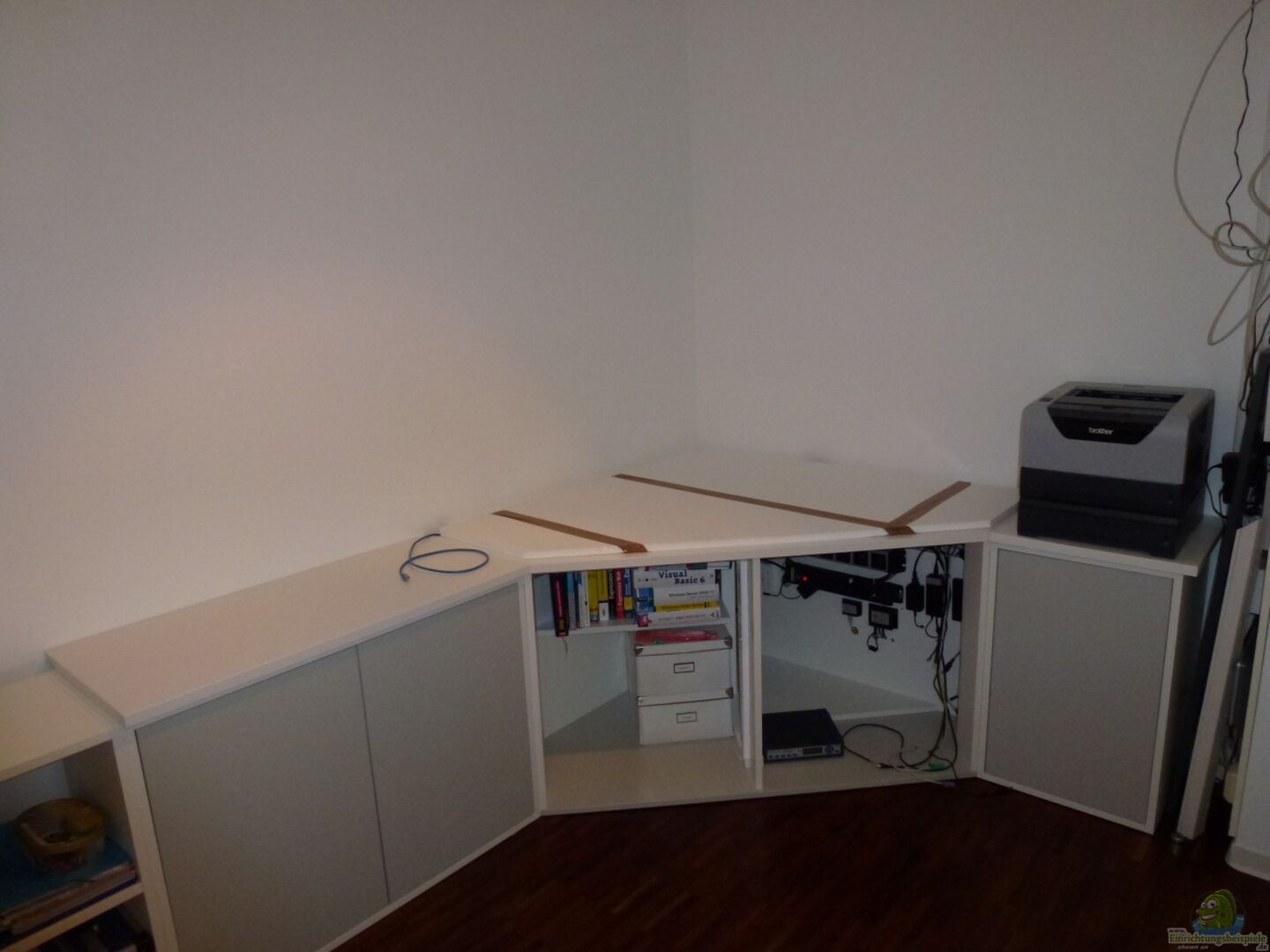 Und noch ein Highlight, die Firma Breyer hat eine Woche vor zugesagtem Termin mit dem Aufbau begonnen. Die Büroeinrichtung steht soweit und der AQ-Unterschrank wurde integriert. Für den Einbau der Verkabelung habe ich einen ganzen Abend gebraucht. Und das ist nur das, was ich ohne Aquarium vorab einbauen konnte.