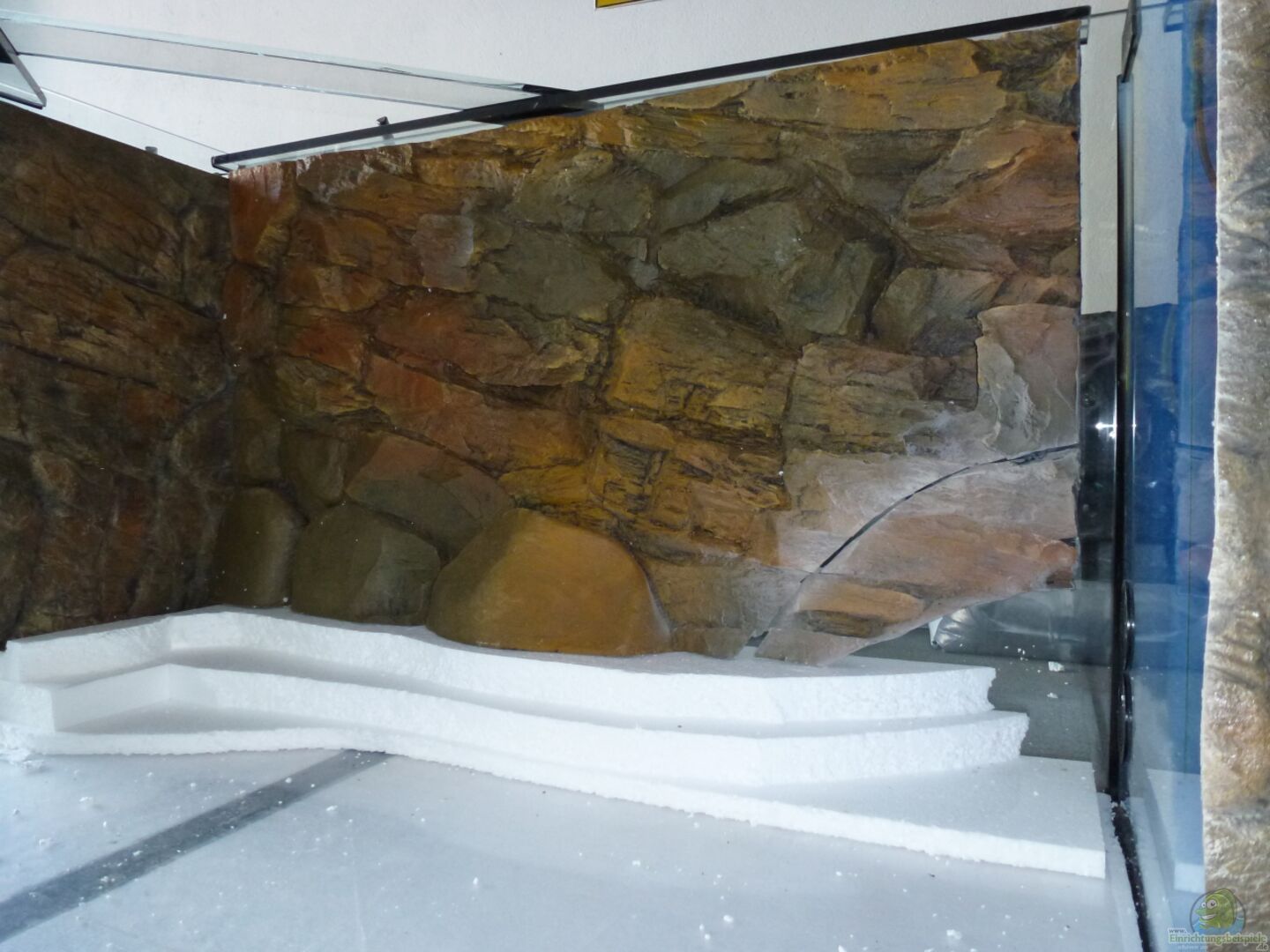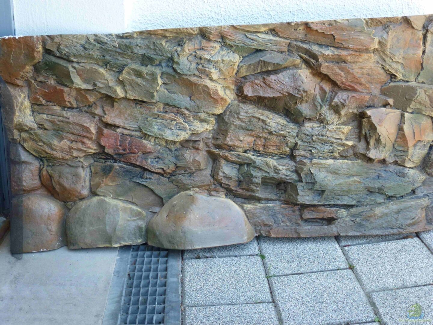 Diese Woche sind auch meine drei Rückwände gekommen. Zwei Rückwände mit Struktur und 3D Effekt für die 1, 20 Schenkel und eine Rückwand zum zuschneiden, um die kurzen Seiten und den Filter zu verkleiden. Da das Becken eine Höhe von 70cm hat und die Rückwand nur knappe 60cm, habe ich unter den Rückwänden jeweils drei "Stufen" aus Styropor eingebaut, um die Höhe auszugleichen und die Rückwand leicht aus dem Wasser schauen zu lassen. Damit die Fische beim Umgraben vom Sand nicht das wei??e Styropor freilegen, habe ich diese "Stufen" mit AQ-Silikon bereits verklebt und werde nächste Woche diese mit Zement bestreichen. Somit wirkt das dann wie eine Steinplatte, wenn sie den mal zum Vorschein kommt.