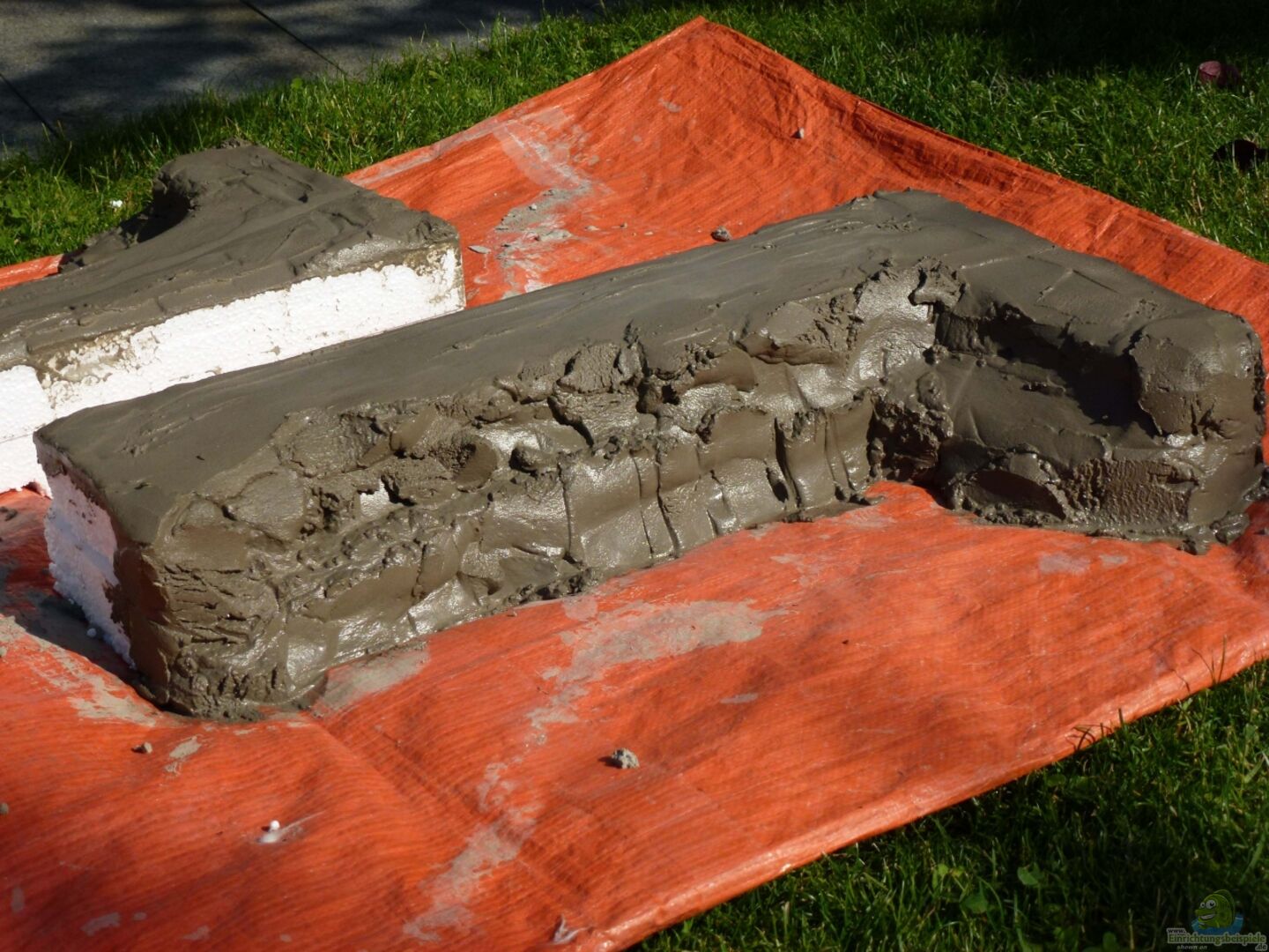 Heute habe ich die "Styropor-Steinplatten" bearbeitet und mit Portland-Zement überzogen. In letzter Minute ist mir eingefallen, die Materialstärke von 1-2cm vom Styropor zu raspeln, sonst hätte da nix mehr gepasst. Jetzt liegen die Platten zum Trocknen im Gartenhaus (siehe weitere Einrichtung) und werden dort erstmal drei Tage liegen gelassen. Klingt schizophren, aber wenn sie dann trocken und ausgehärtet sind, gehts ab in die Regentonne und werden dort zwei Wochen gewässert.