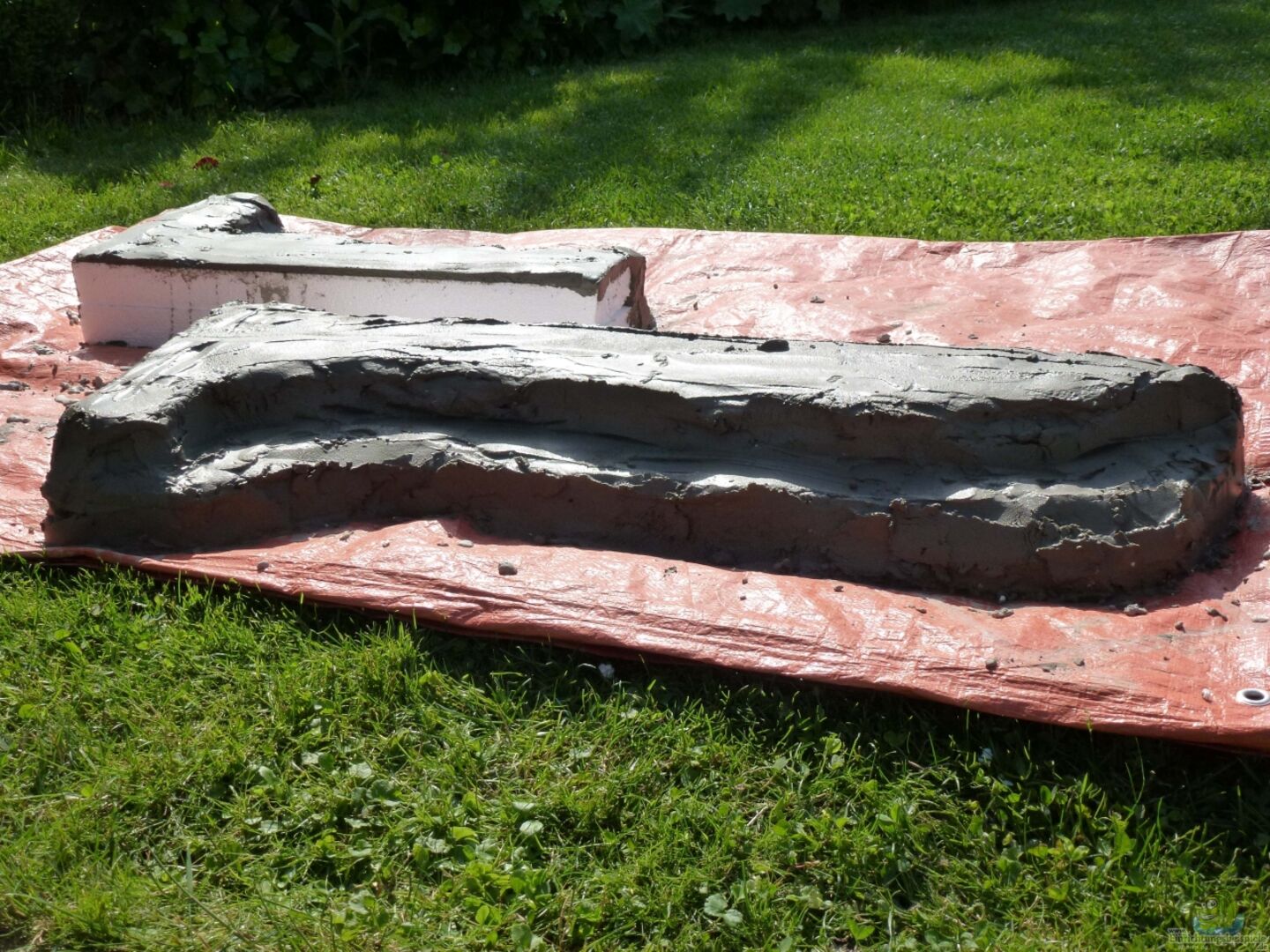 Gesagt getan. Heute habe ich nicht drei Styropor Stufen, sondern nur zwei mit entsprechender Stärke verwendet. Diesmal habe ich nicht an AQ-Silikon gespart, sondern habe die Platten ordentlich verklebt. Dann wieder Zement und Sand angerührt und ca. 1 bis 2cm Material aufgetragen. Zum Trocknen ging's wieder ins Gartenhaus.