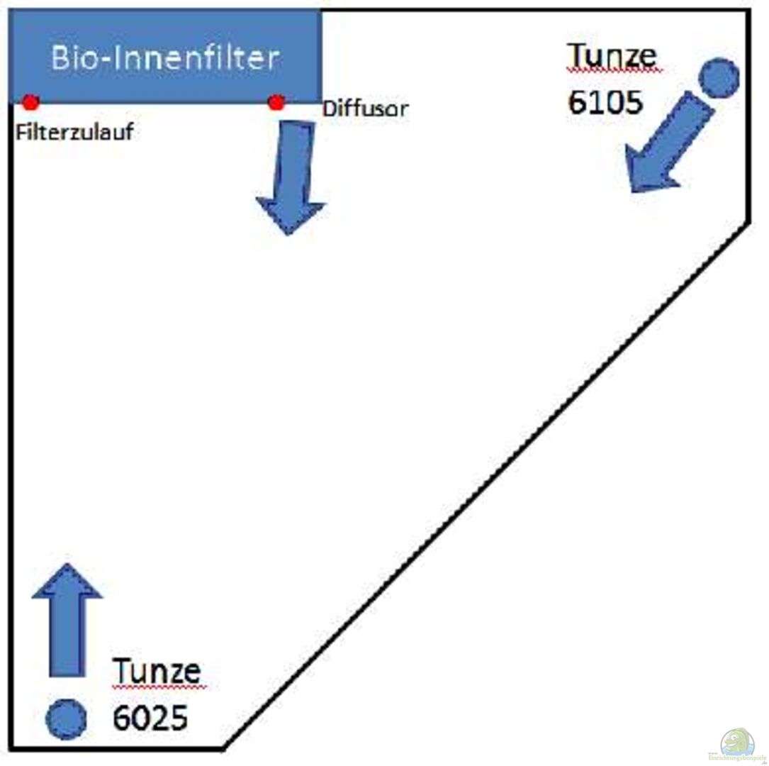 Was ist noch passiert? Ich habe mir noch über die Strömung Gedanken gemacht und habe mein "Strömungskonzept" überarbeitet und noch eine Tunze 6025 bestellt. Ursprünglich war geplant, die bereits gekaufte Tunze 6105 (steuerbar) auf der gegenüberliegenden Seite des Filters zu installieren und auf den Filtereingang zu richten. Durch die Verschiebung des Filters habe ich auch hier nachbessern müssen. Wie ich mir das ganze vorstelle, zeigt meine Skizze.