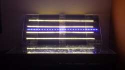 Die Aquariumabdeckung wurde auch selbst gebaut. Diese besteht aus einer Plexiglasplatte auf der verschiedene LED-Streifen mit Warm-Weiss und Kalt-Weiss angebracht wurden, zudem ist das Licht dimmbar und wahlweise kann es auf Rot, Grün oder Blau umgeschaltet werden.