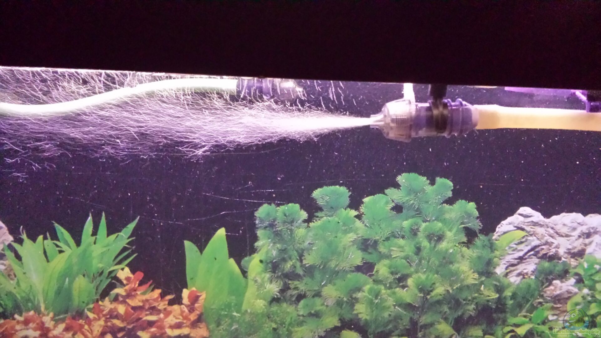 An jedem Auslass ist ein Eheim Diffusor angebracht um das Becken mit dem nötigen Sauerstoff zu versorgen. Den Diffusor kann ich nur empfehlen da ich mir die lästige "Luftpumpe" und somit ca. 2 Watt a 24h sparen kann. Zu beachten ist aber die Durchlaufmenge des Filters, wenn diese zu schwach ist nützt der Diffusor nichts da einfach zu wenig Druck fehlt um den nötigen Sauerstoff ins Becken zu bringen.