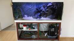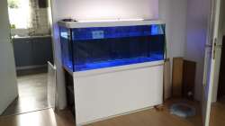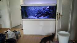 Gebraucht gekauftes, Wulstverklebtes Becken. War vorher ein Meerwasserbecken mit ??berlauf und 2 Bohrungen im Boden. Da ich aber einen normalen Aussenfilter haben wollte hab ich die eingeklebten Scheiben entfernt und die beiden Bohrungen zu geklebt.
