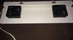 Die Kühlung ist ein Eigenbau mit zwei Lüftern der Marke Sunon Maglev, die jeweils 70m³ Volumenstrom erzeugen. Als Basis dient eine Schichtstoffplatte und die Ausschnitte der Lüfter habe ich entsprechend zugeschnitten.