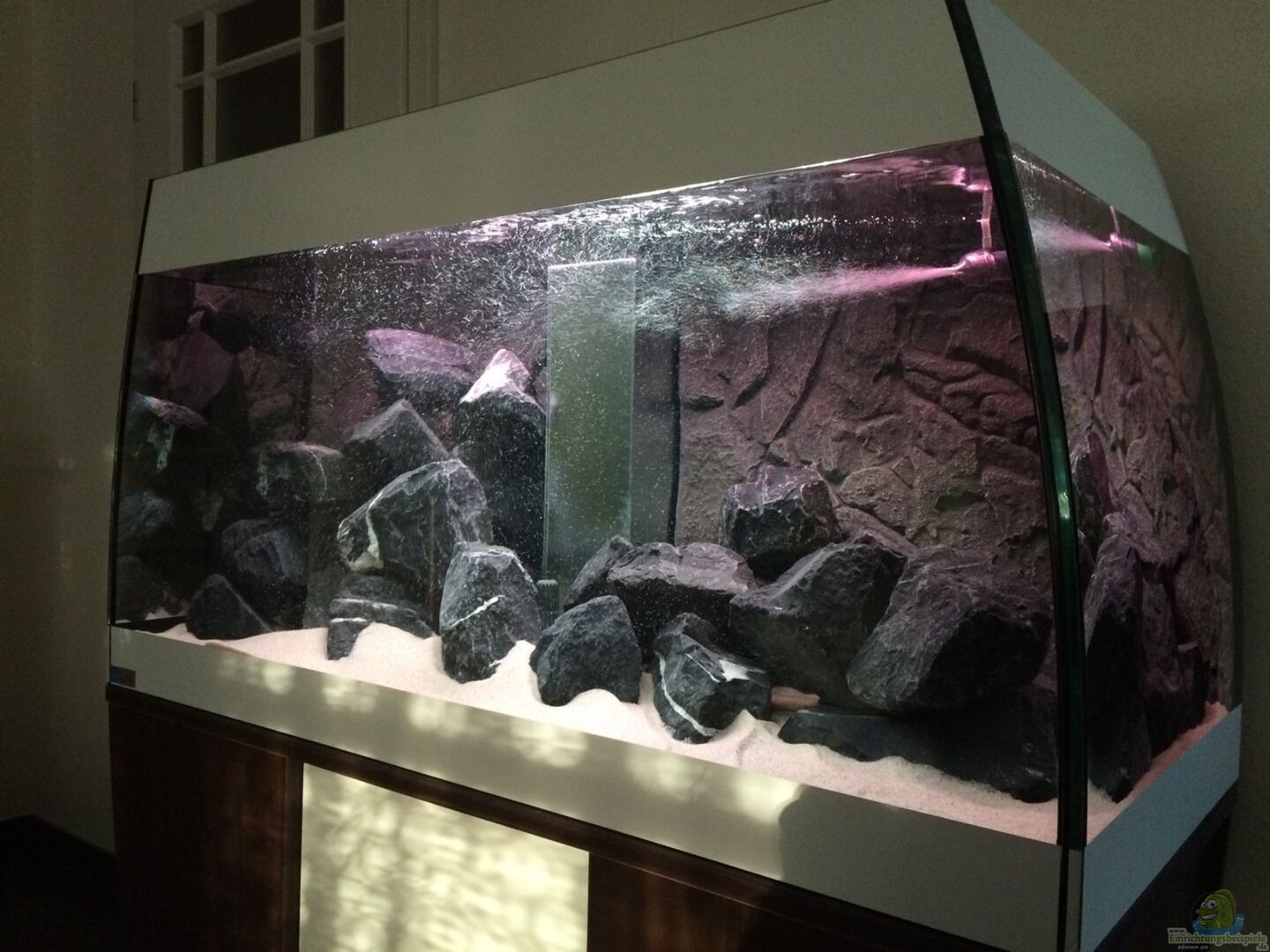 Als Rückwand wurde die Juwel Slim Granit verbaut. Bedingt durch die besondere Form des Aquariums, ist der Zuschnitt hierbei eine Herausforderung gewesen. Als Werkzeug kam eine Stichsäge (mit feinem Sägeblatt) zum Einsatz. Die Schnittkanten wurden anschlie??end mit schwarzem Acryllack versiegelt.