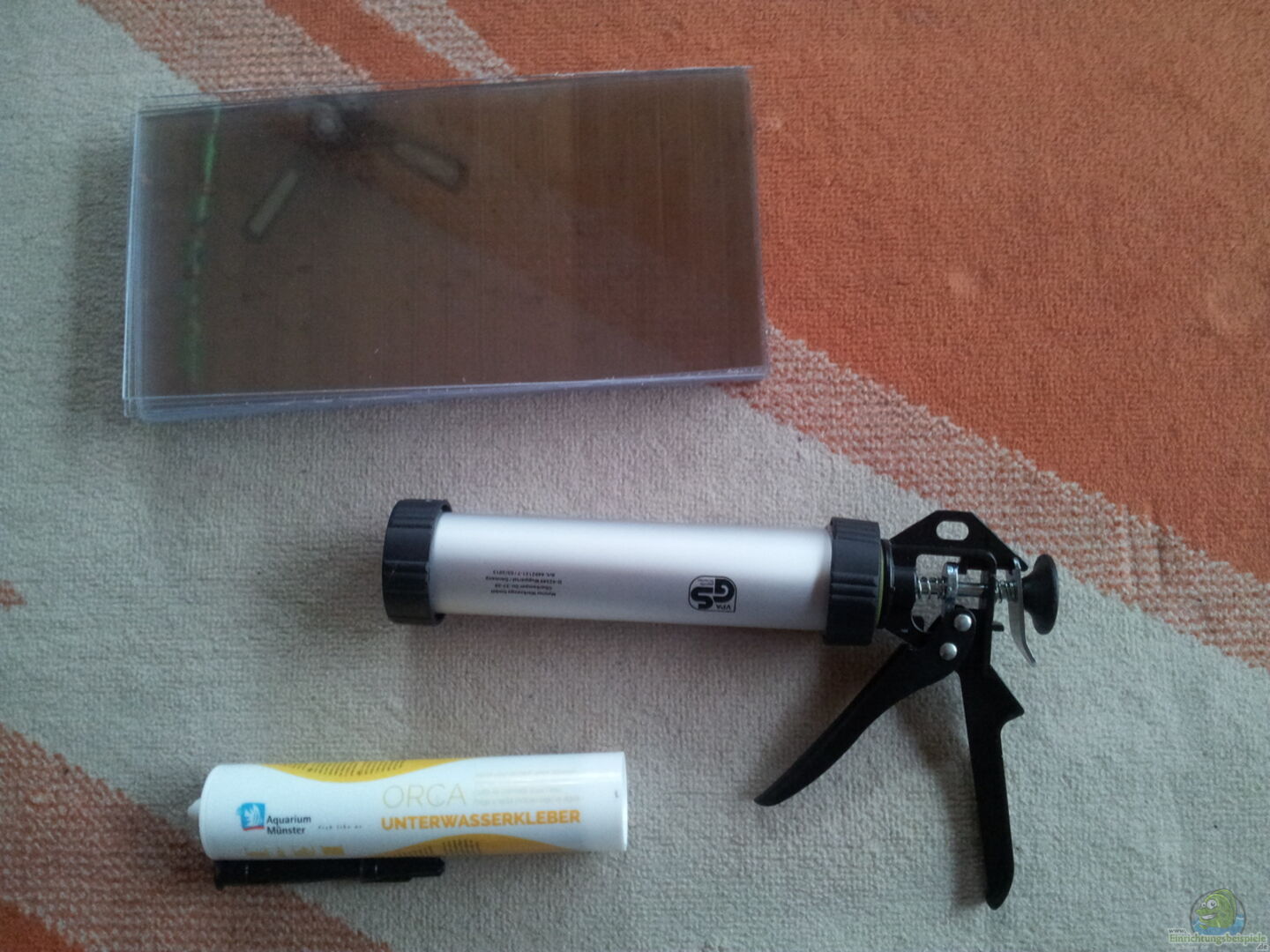 Bühlertal Granit ca. 200 Kg auf einer 3mm Plexiglas gestellt. Die Plexiglas scheibe wurde mit Orca Unterwasser Kleber ein geklebt.