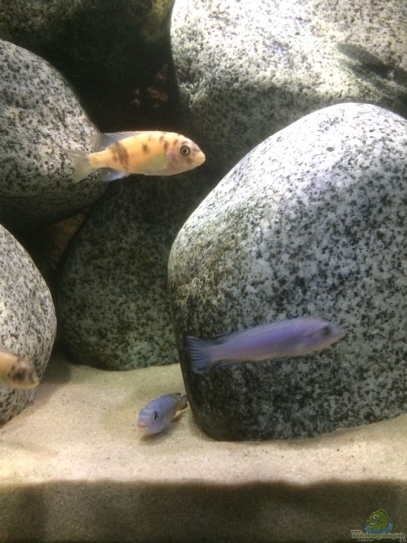 Auf Grund der verhältnismä??ig geringen Beckengrö??e (420 L) habe ich bewusst auf die Gruppenhaltung verzichtet und habe 4 Arten (Haremshaltung) gesetzt. Dabei war es mir wichtig, mit Jungtieren zu starten, die zusammenaufwachsen sollen und somit eine gemeinsame Hierachie aufbauen können. Das hier an oberste Stelle der M. zebra gold steht ist klar aber auch bewusst so gewählt.