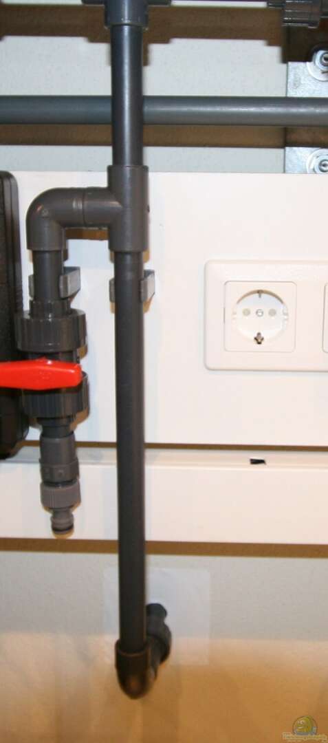 Die Besonderheit ist dass die Verrohrung im Aquarium durch eine 20mm PVC Leitung im Boden der Wohnung mit dem Spülenunterschrank in der Küche verbunden ist!
