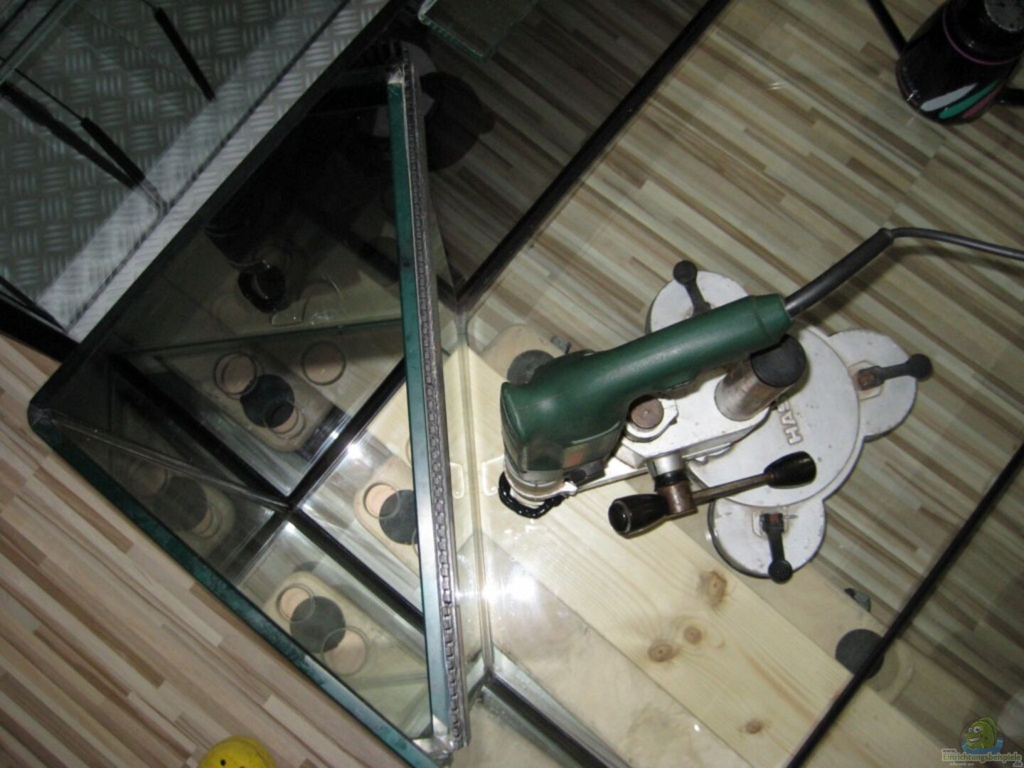Abgedeckt ist das Filterbecken mit zwei Glasscheiben 4mm stark in die ich zum besseren hantieren Löcher gebohrt habe.