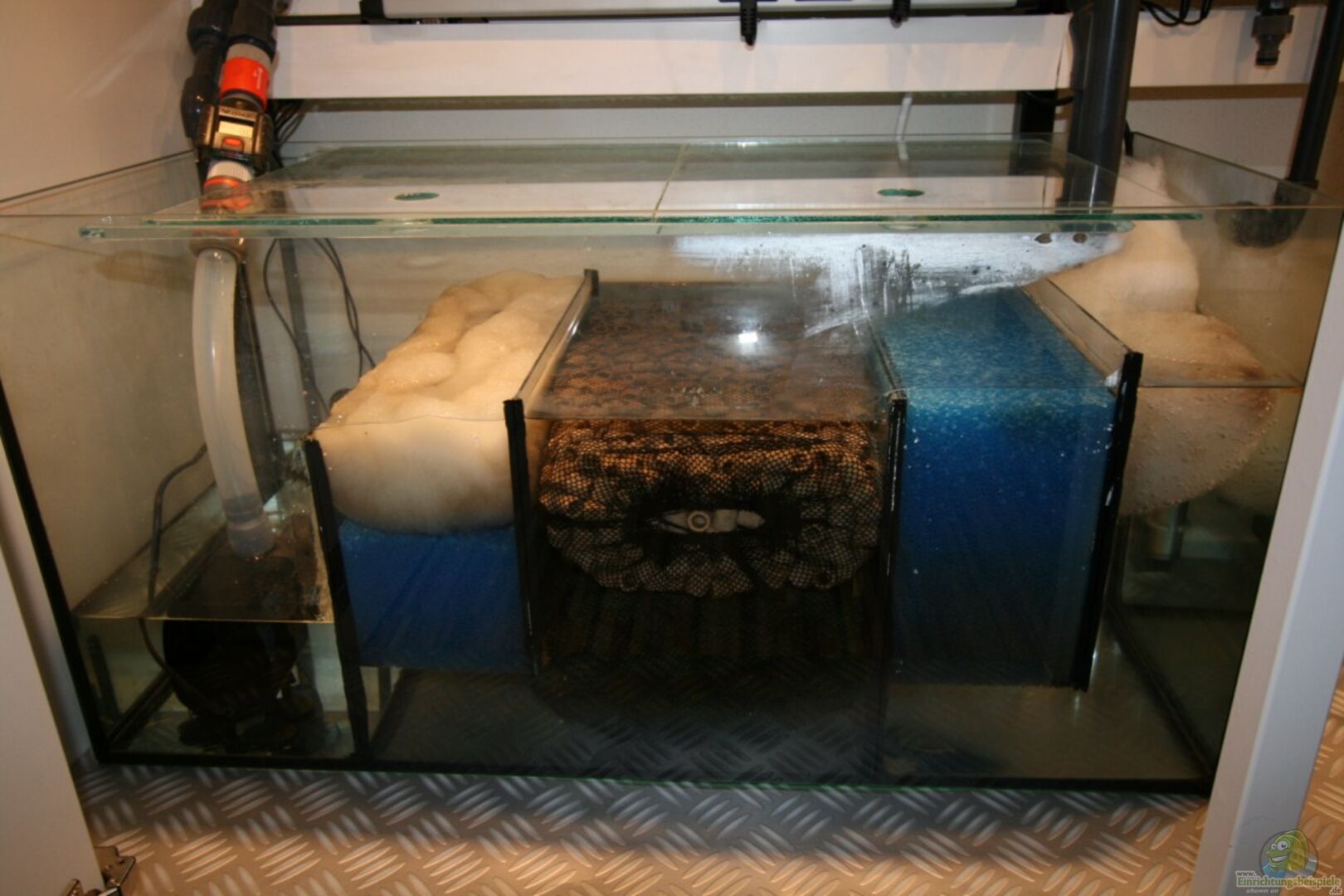 Offenes Filter/Technik Becken, 80x40x35cm. Das Becken war ein standard Aquarium aus dem Zoohandel, ich habe es mit Trennscheiben versehen damit verschiedene Kammern entstehen.
