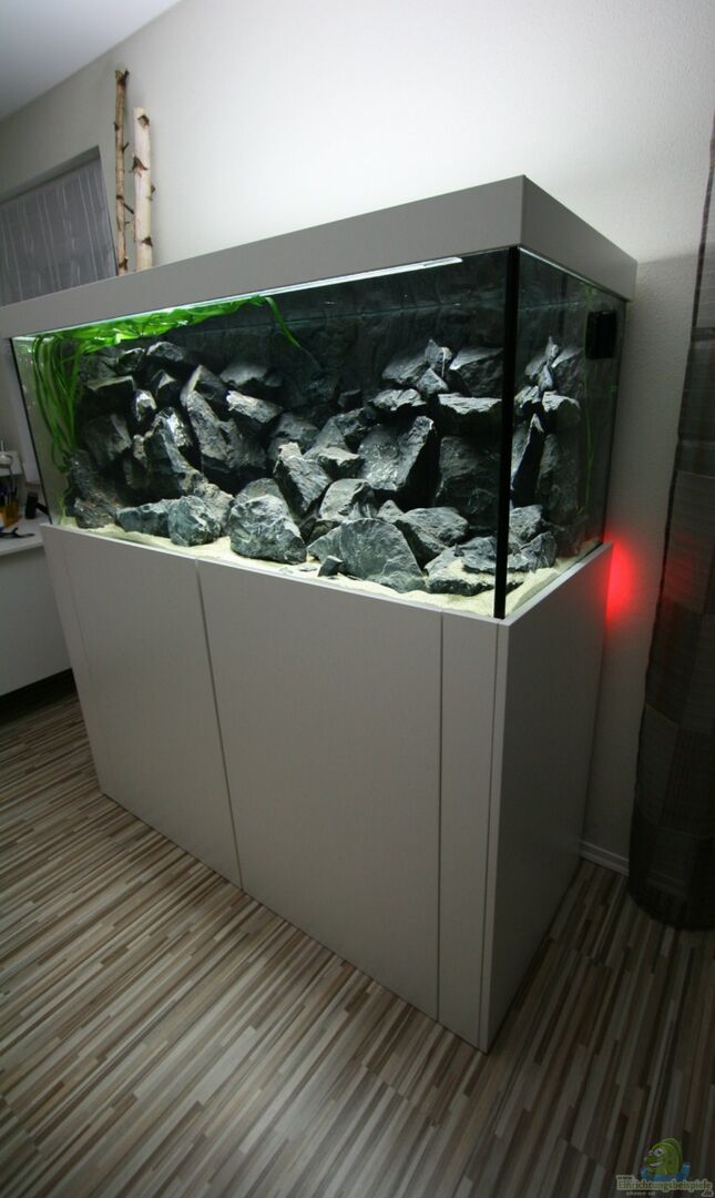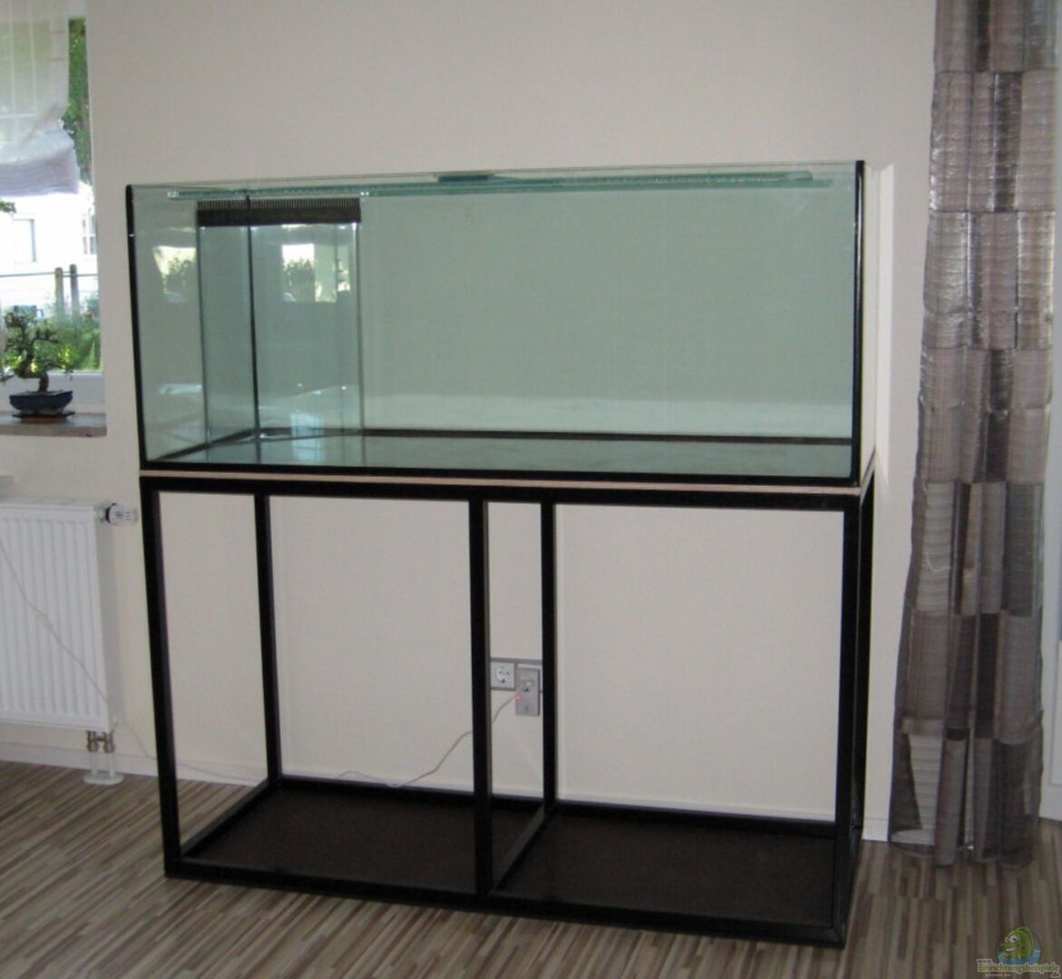 Das Aquarium steht auf einem 30x30mm vierkant Stahlrohr-Untergestell, nach dem Schweissen wurde das Gestell pulverbeschichtet und von meinem Schreiner-Freund mit hochwertigen Spanplatten (19mm) aus dem Küchenbau verkleidet. Die Spanplatten und Kanten sind Melamin beschichtet und somit sehr Wasserfest! Die Türen sind mit Klick-Topfbändern versehen was das entfernen wenn nötig komfortabel gestaltet.