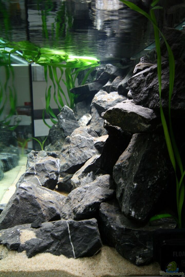 Die Rückwand besteht aus drei Juwel "Stone Granite" Elementen die ich mit Silikon auf die Aquarium-Rückscheibe geklebt habe. Die Stoss-Nähte der Elemente wurden mit Reststücken des gleichen Materials kaschiert/überklebt damit optisch eine durchgängige Rückwand daraus wurde.