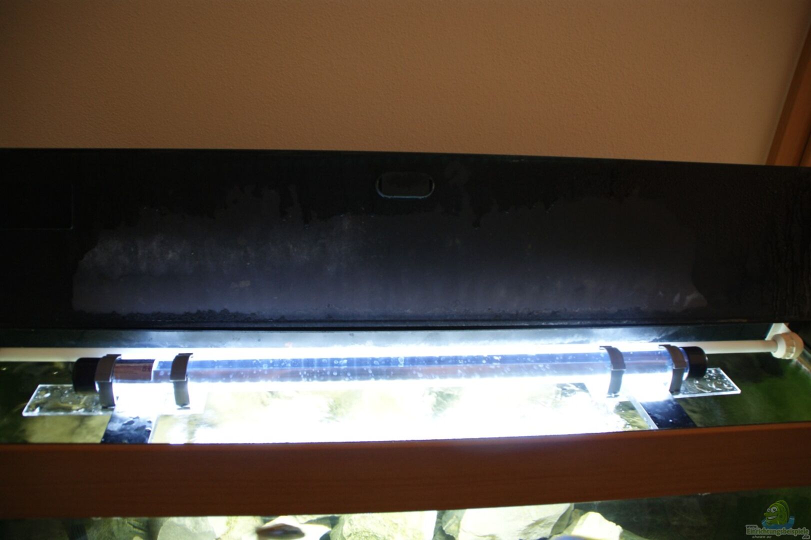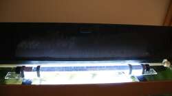 Die LED-Röhre ist im Grunde einfach eine Billiglösung und doch macht sie genau was sie soll: Perfektes Licht für ein Malawiquarium. Da die Röhre nur 80 cm lang ist, entstehen zwangsläufig im Randbereich des 120cm langen Aquariums Schattenzonen. Auch der hinteren Bereich um die Steinaufbauten herum, bleibt es ein wenig dunkler. Der Kringeleffekt ist bei dieser Leuchte trotz eines Verbrauchs von nur 16 Watt absolut top, so dass ich die gerne empfehle, falls jemand sein Aquarium günstig zu einer LED-Beleuchtung umrüsten will.