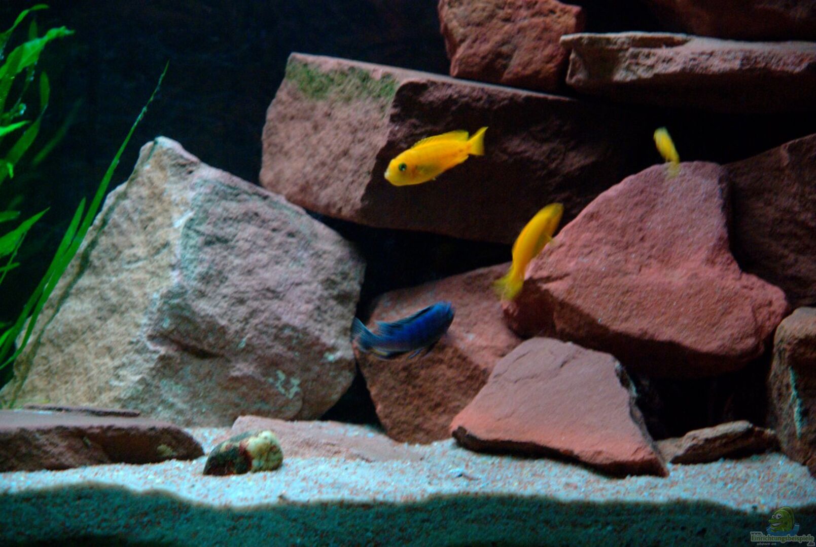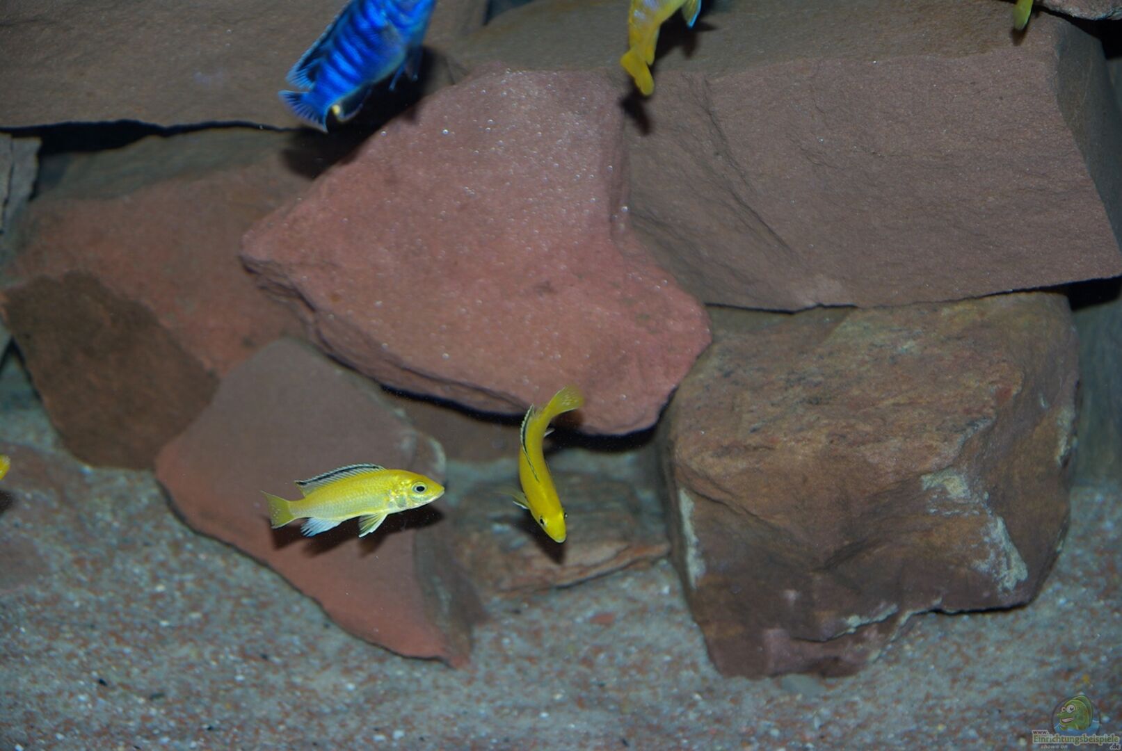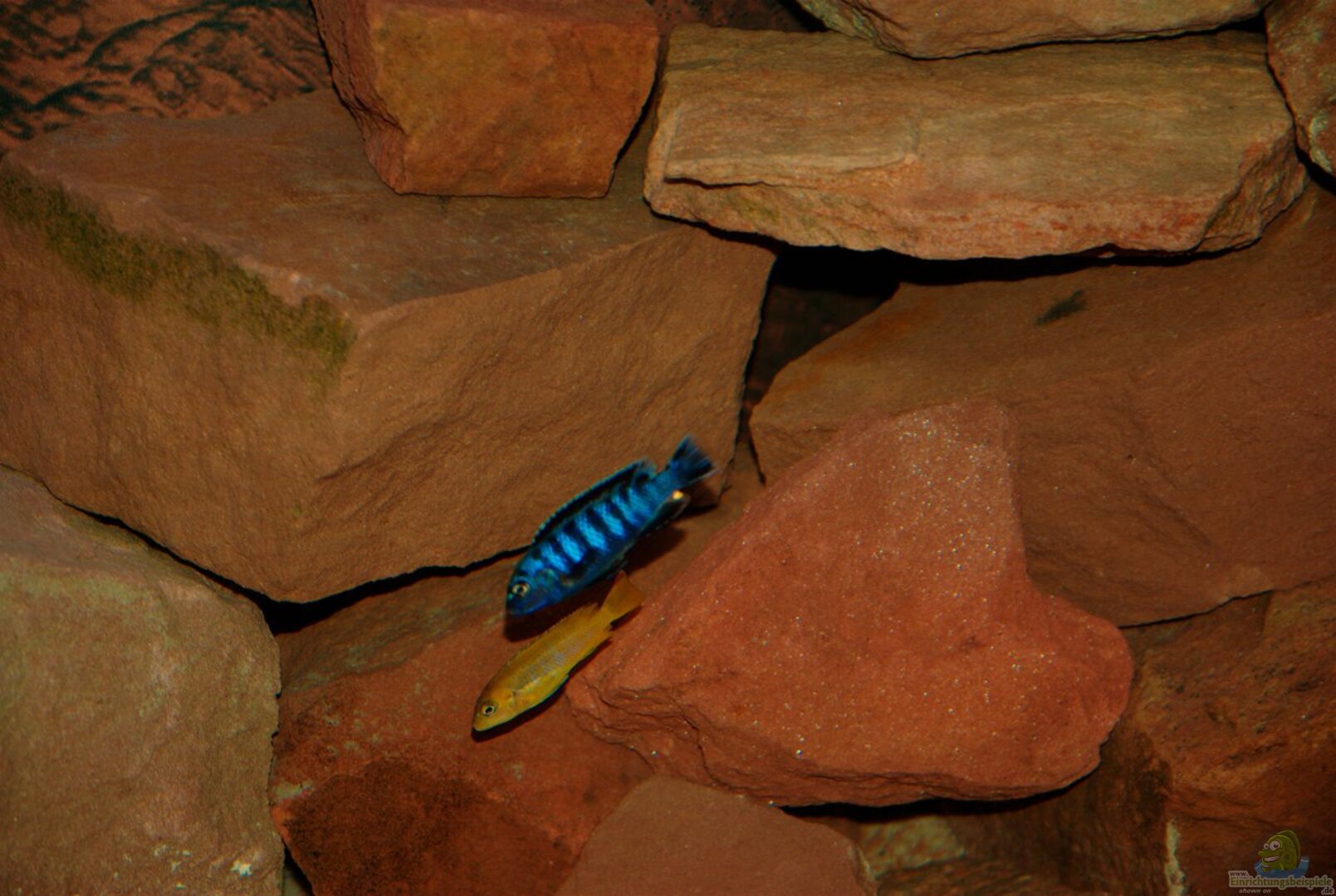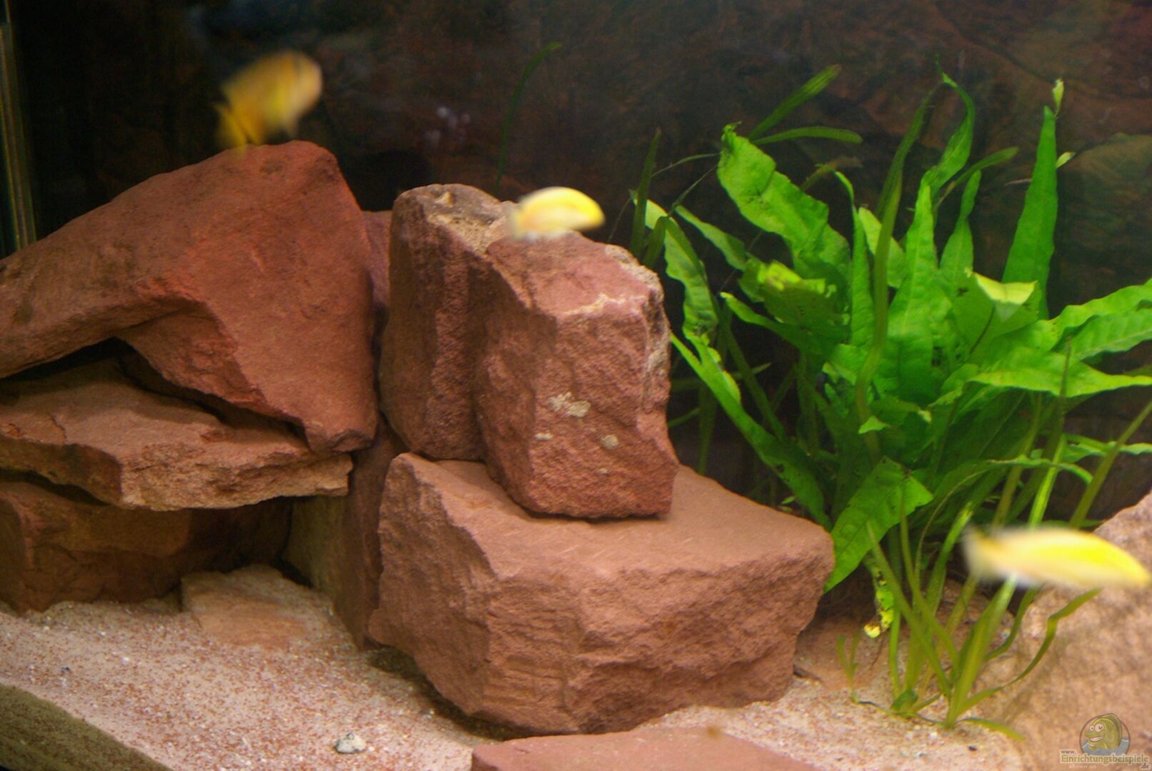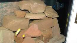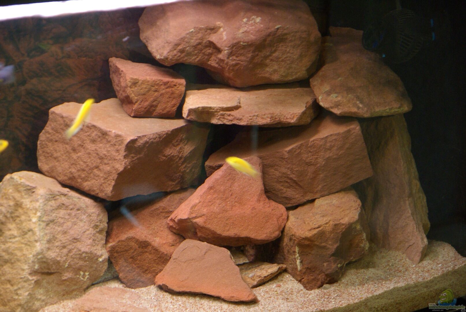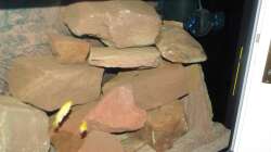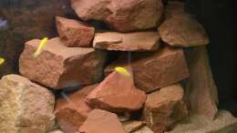 Links der Steinhaufen ist ein bisschen niedriger da ich bei anderen Becken beobachtet habe da?? die Yellows gerne über den Felshaufen rumwuseln. Wenn es ??rger zwischen den Mbunas gibt werde ich den linken Steinhügel noch erhöhen um 2 gleichwertige Reviere zu schaffen was aber für die Yellows nicht notwendig sein sollte.