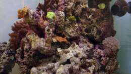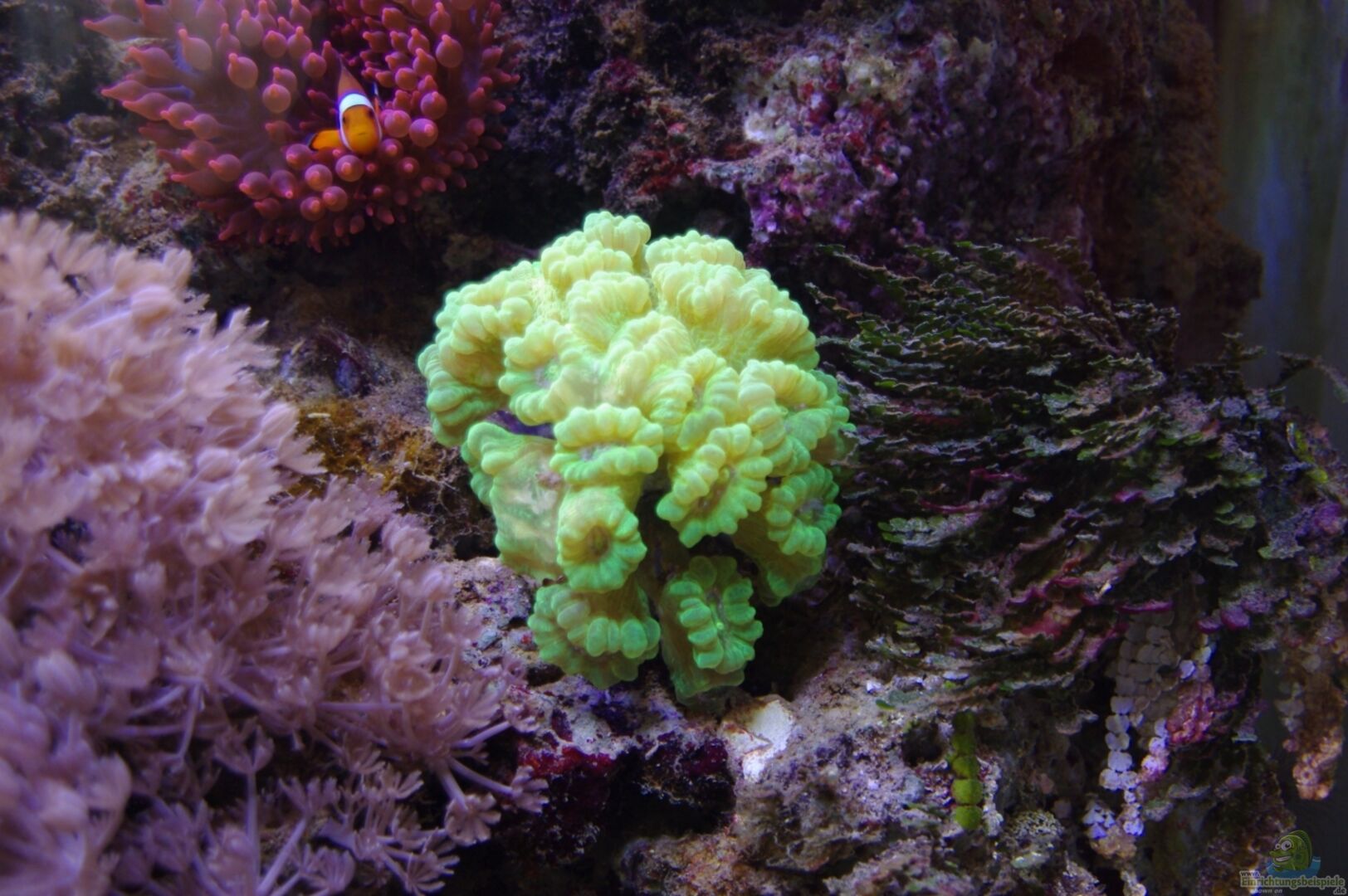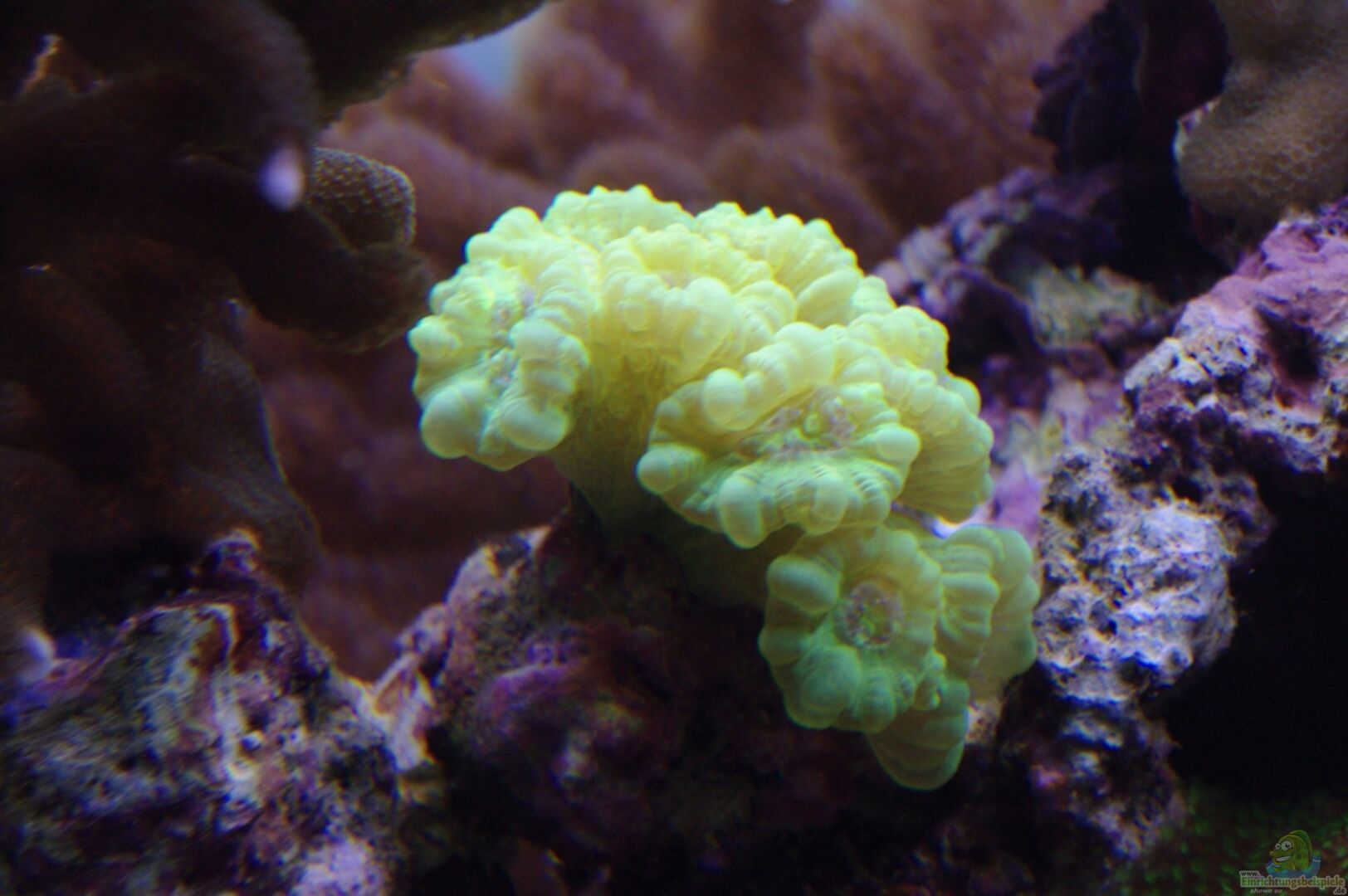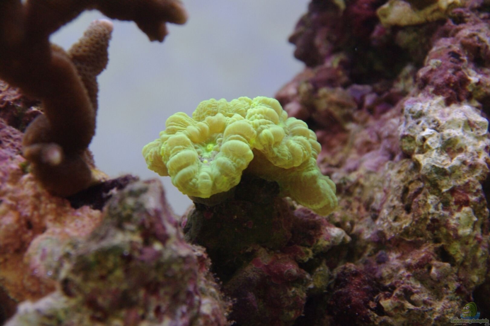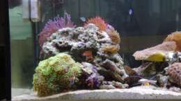01.07.2012: neue Tiere erfasst. Nachdem meine beiden Macropharyngodon bipartitus aus dem Becken gesprungen sind und ich sie leider zu spät gefunden habe, habe ich mich für Kardinalbarsche als Ersatz entschieden. Sie sind zwar nicht so farbenprächtig, aber ruhiger und angeblich weniger schreckhaft. Vielleicht klappt es auch mit Nachwuchs. Weiters habe ich noch Scheibenanemonen, eine Hirnkoralle und eine sehr schöne gelbe Turbinaria sowie einen grabenden Seestern eingebracht. Die anderen Korallen entwickeln sich sehr gut und breiten sich schön langsam aus. Ich bin wirklich glücklich, dass ich alles so schnell in den Griff bekommen habe. Die gründliche Vorbereitung und langfristige Planung macht sich also bezahlt.