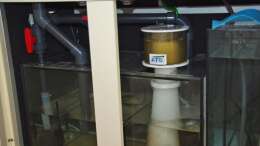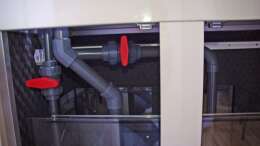 Das Becken hat drei Bohrungen für die Zu- und Abflüsse zum 120l Technikbecken. Die Abflussmenge regelt sich automatisch über den Wasserablauf "Riff-silent" vom Korallenriff-Center in Wien. Eine absolut geniale Erfindung, die leise ist und die Einstellung des Ablaufes entfällt. Au??erdem kann der Kugelhahn des Ablaufes nicht zuwachsen bzw. verstopfen.