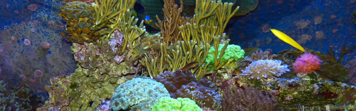 Riffaufbau ist mittig platziert damit sich die Fische auch hinter das Riff zurückziehen können. Riffaufbau mit einer 50 cm hohen Riffsäule aus totem Riffgestein und LG wurde so gestaltet, dass sich mehrere gro??e Höhlen ergeben.