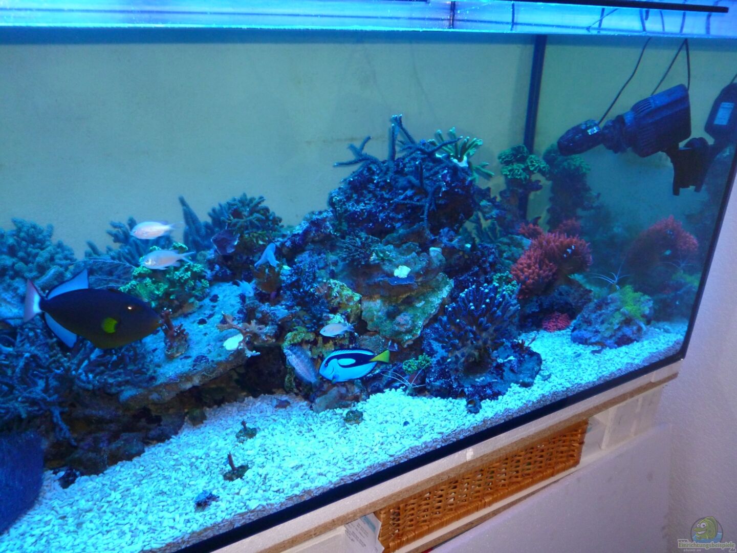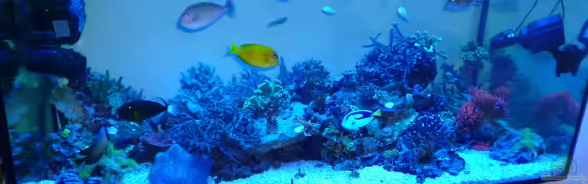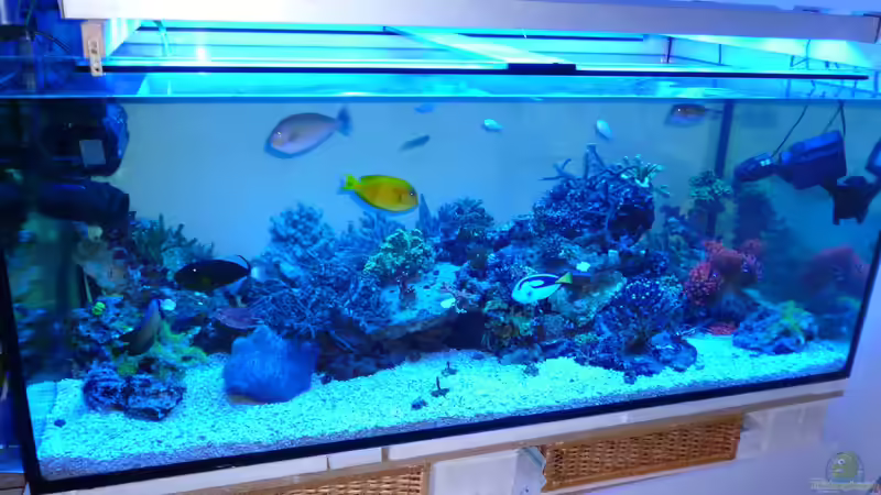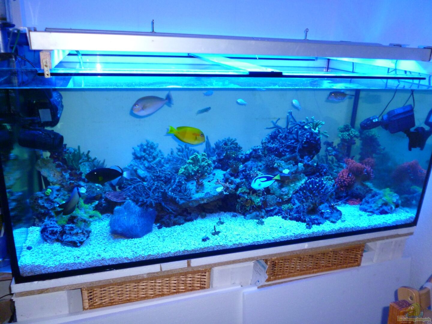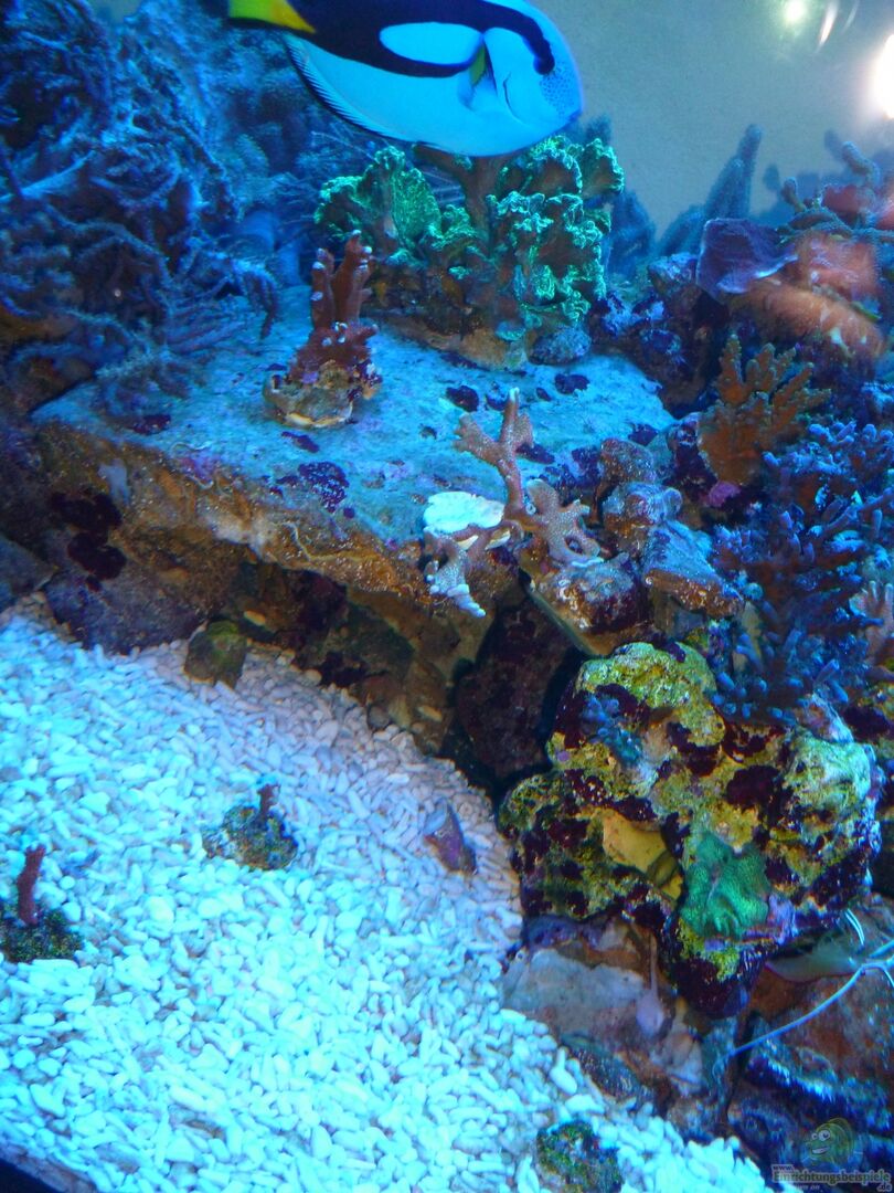 Das Becken ist sehr sparsam Beleuchtet für seine grö??e , deshalb stehen Lichthunrige Korallen wie Acroporas und Montiporas auch erst ab ca Beckenmitte .