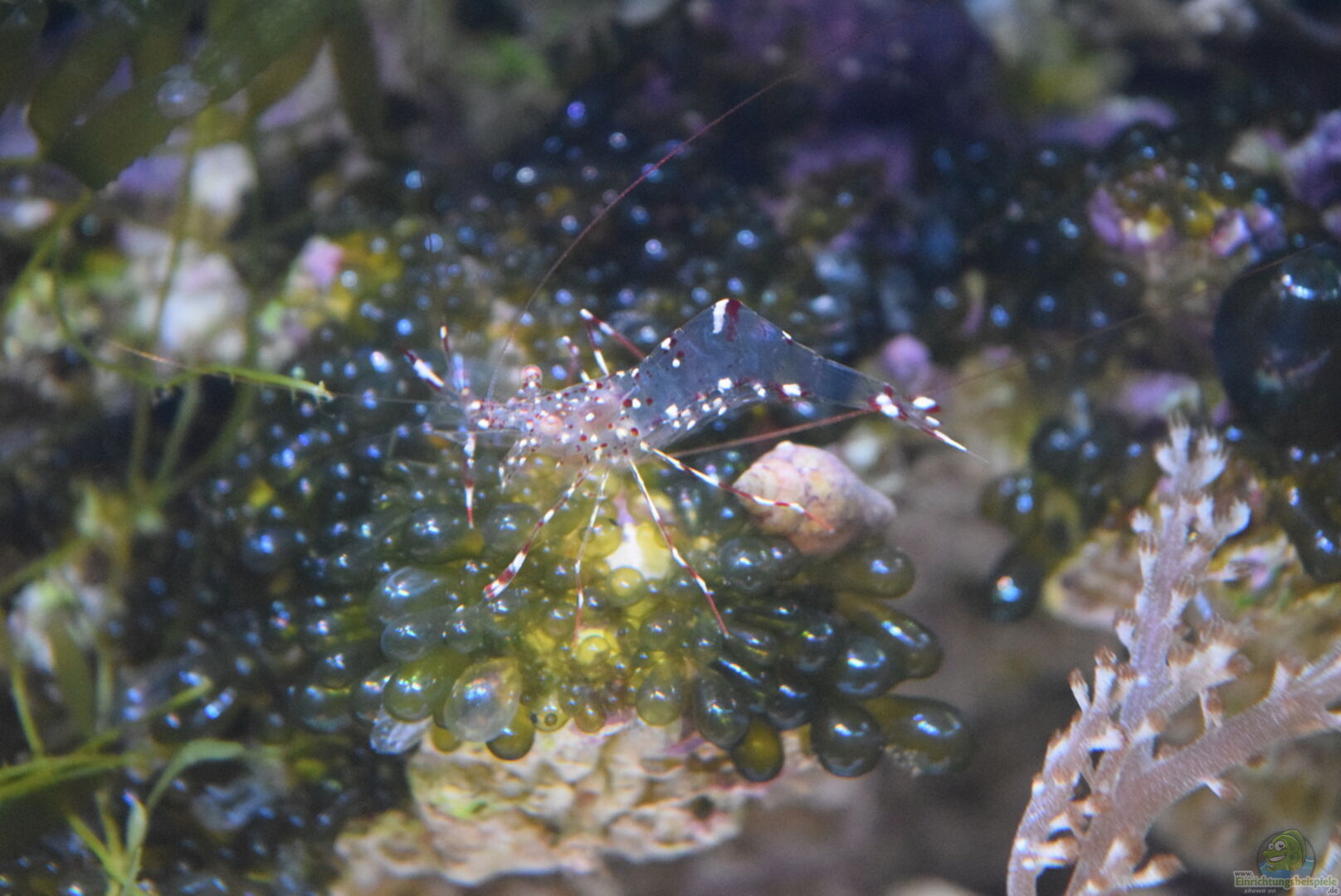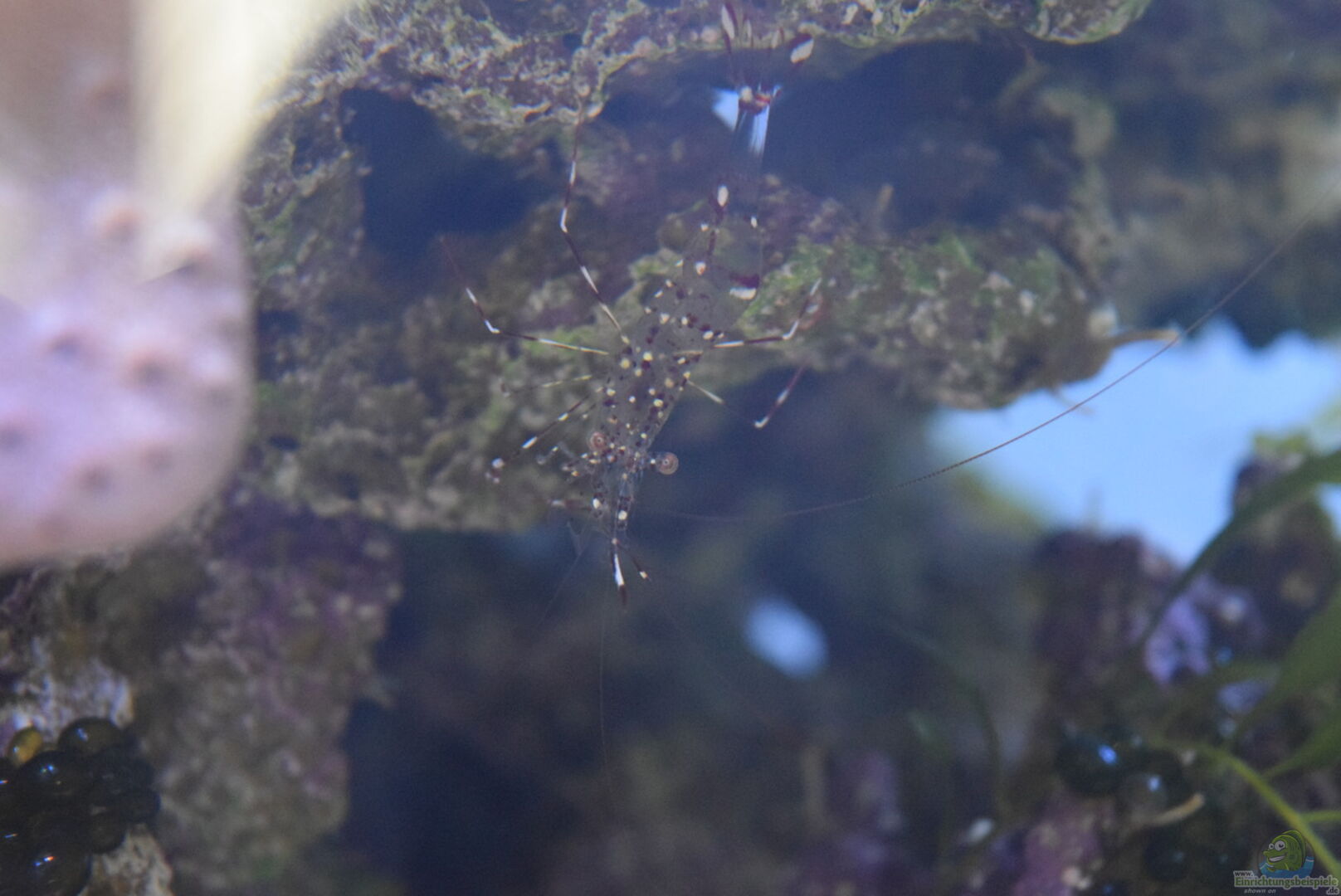 Die Stenopus-Garnelen haben sich mittlerweile 2 mal gehäutet und entwickeln sich prächtig. Sie kommen bei der Fütterung auch ohne Scheu aus Ihrem Versteck gestürmt. Die Krabbe, die mittlerweile auch recht forsch ans Futter geht, wird extra gefüttert, damit Sie sich nicht an den Korallen vergreift.