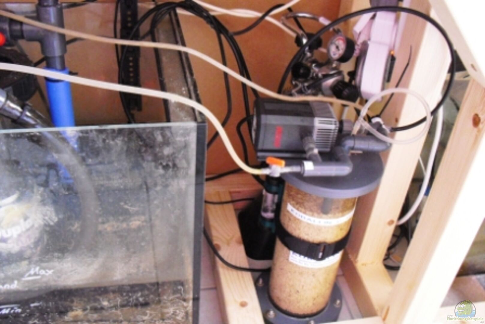 80 Literbecken mit Abschäumer, sowie Phos und Sil. Adsorber im Dauereinsatz.