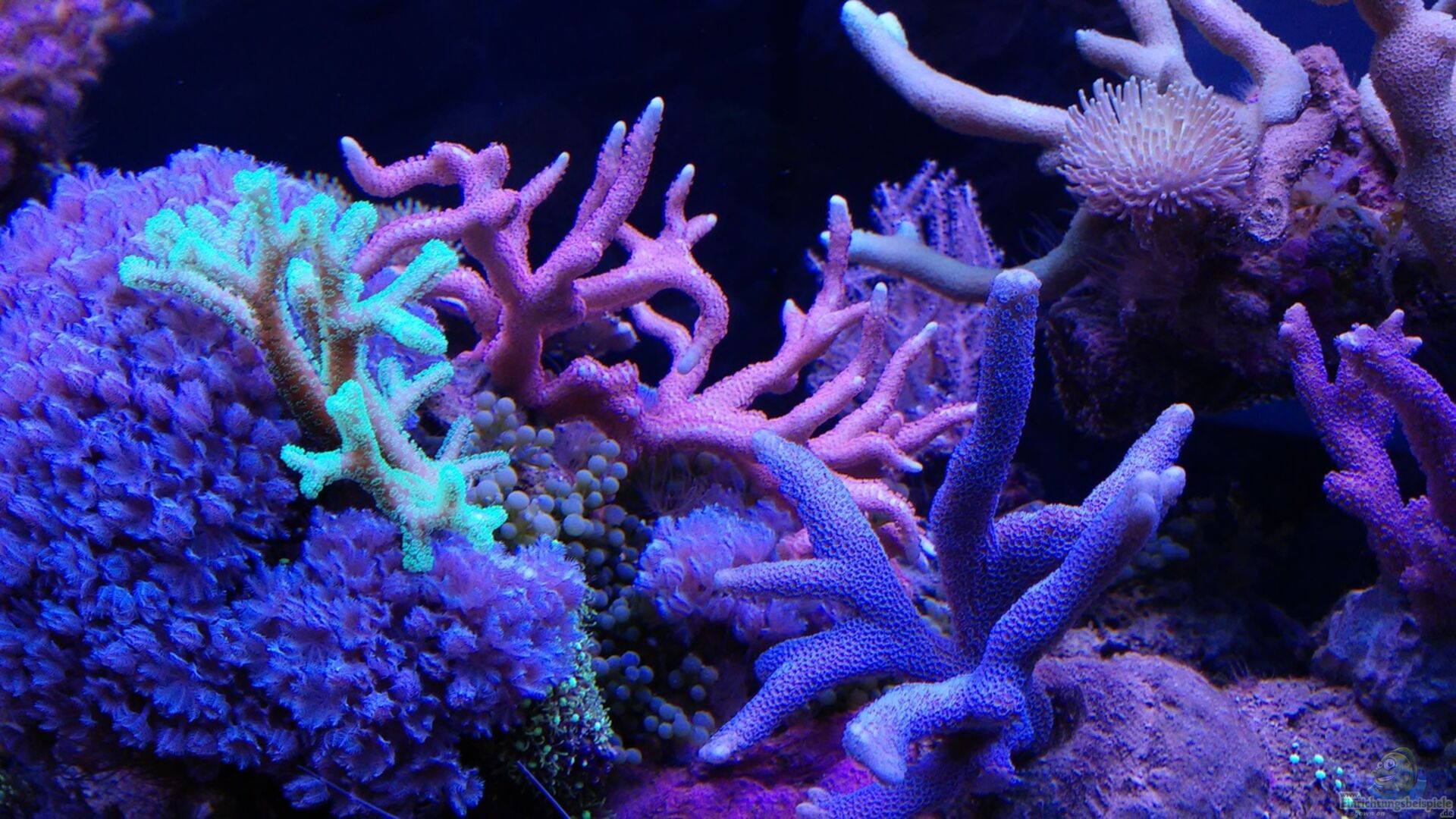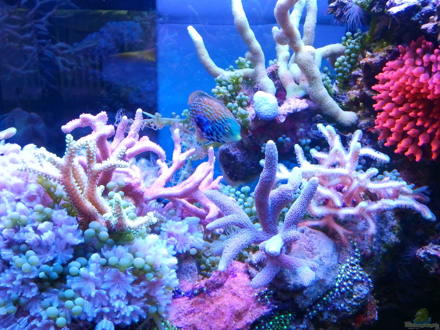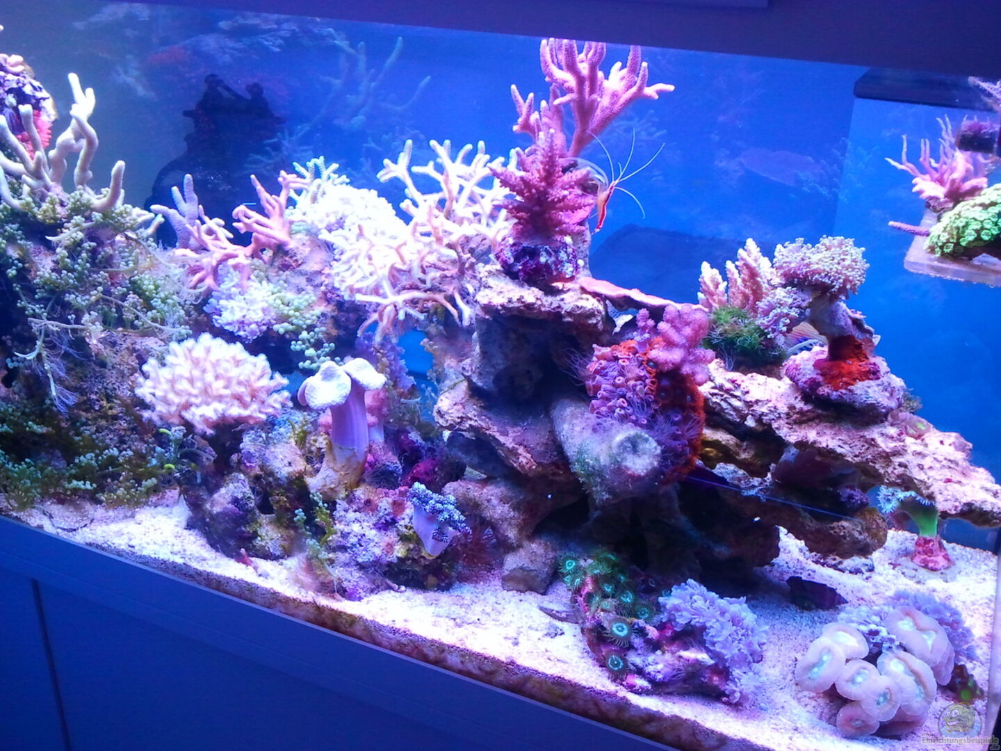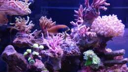 Mein Becken ist in meinen Augen ein offenes Einrichtungsbeispiel das nicht zu dicht mit Lebendgestein und Korallen zugebaut ist , aber trotzdem noch genug versteckmöglichkeiten für Fische und Garnelen bietet.