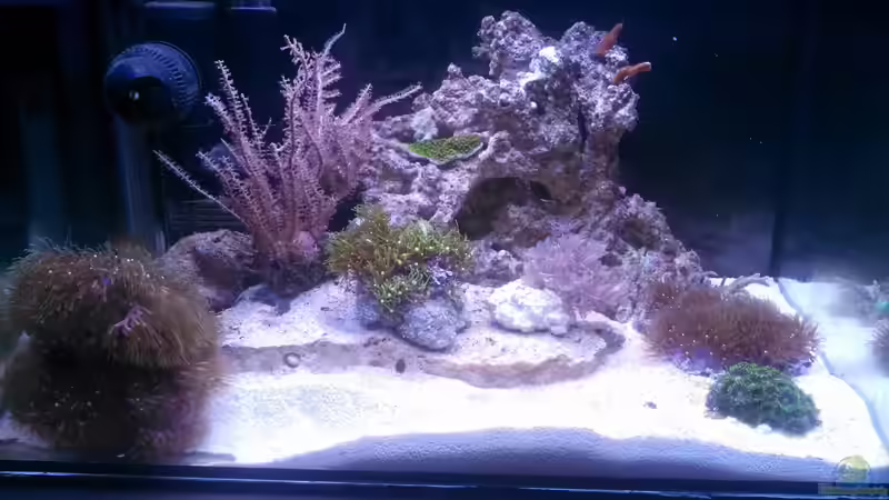 2-3 Kg Lebend Gestein ; aktuell ein wenig Live Sand und dem Dennerle Bio-Circulator 4 in 1 (Betrieben ohne Filterschwamm); Zusatz Hydor Flo Deflector für eine abwechselnde Strömung