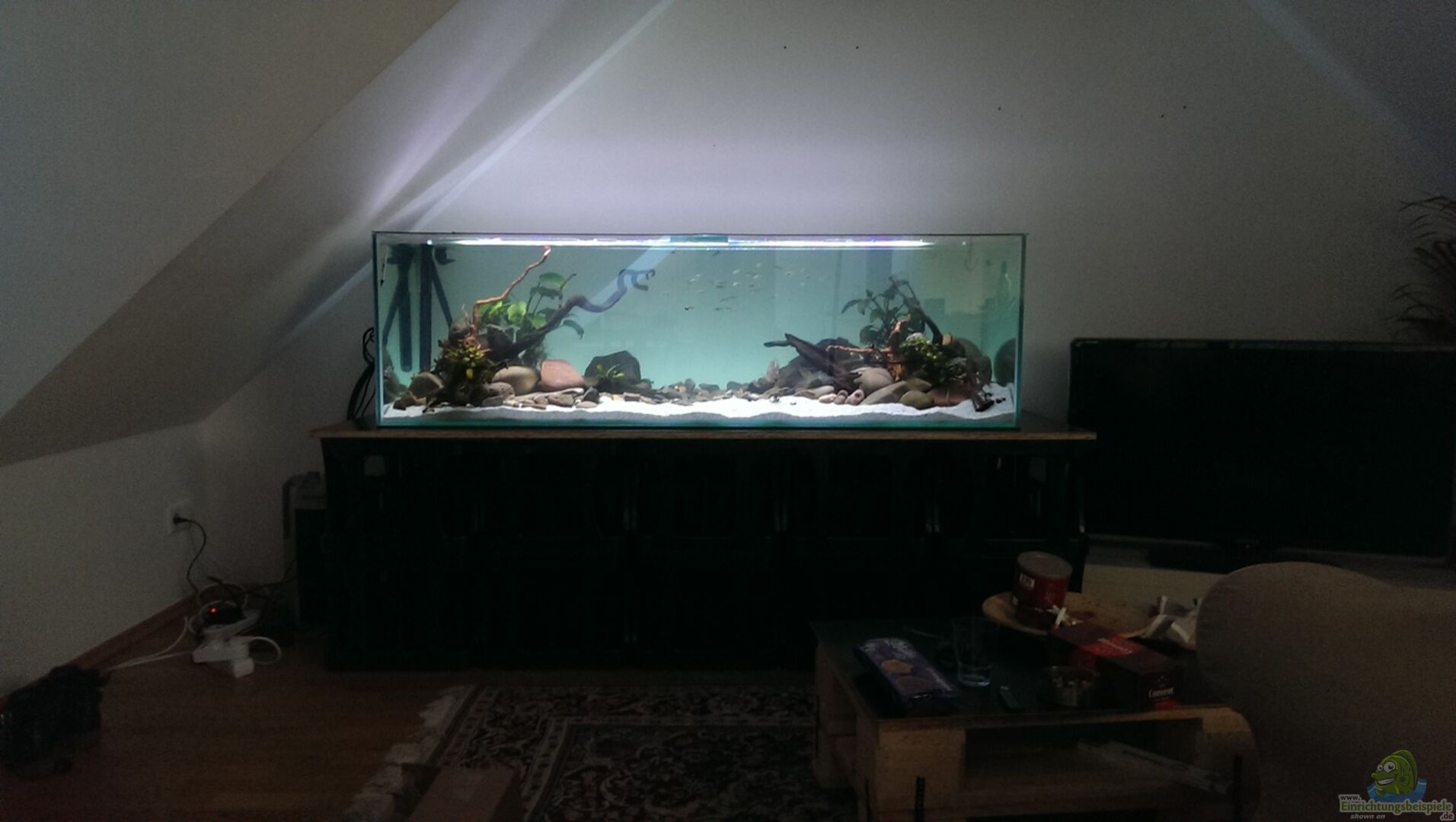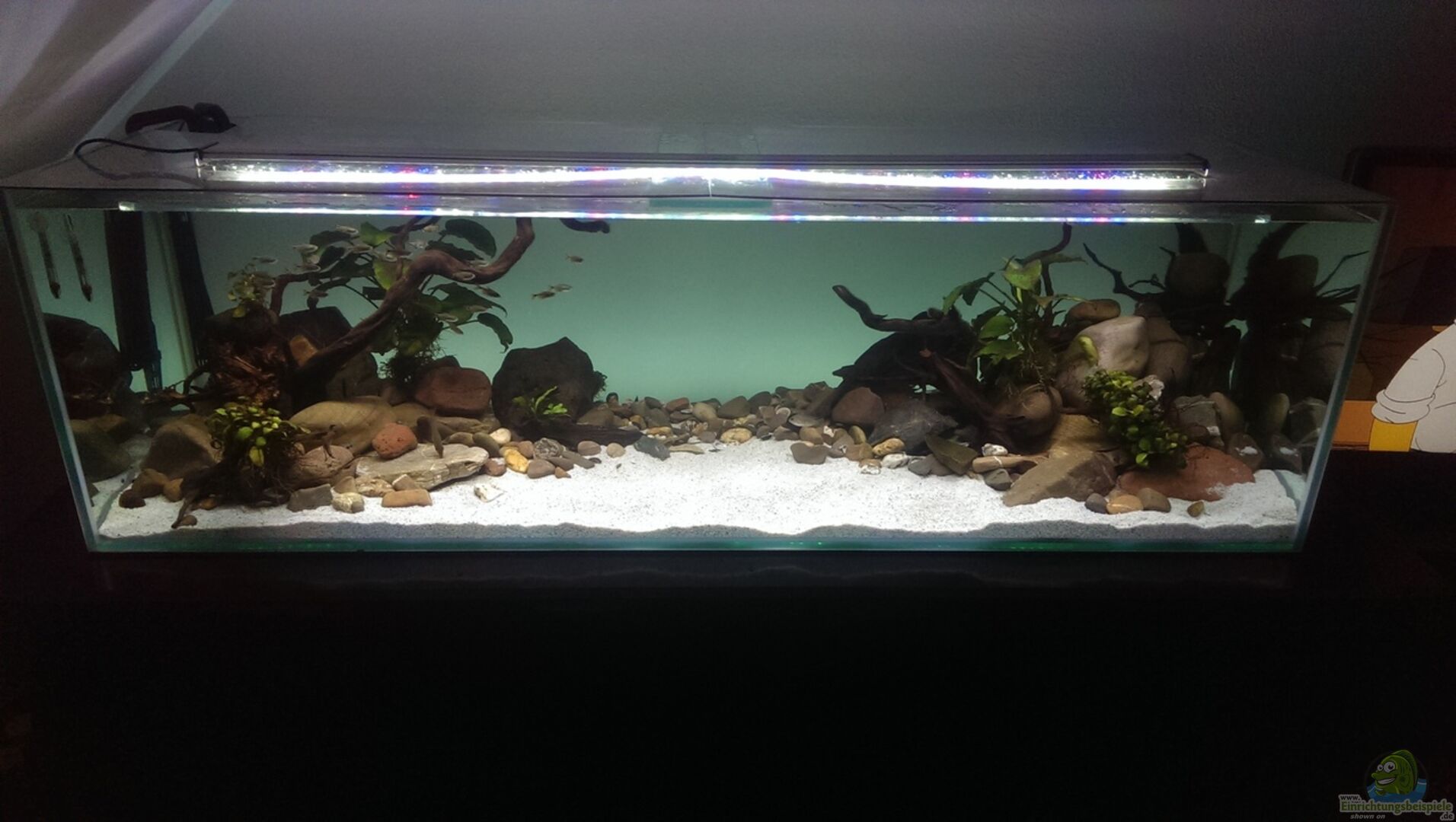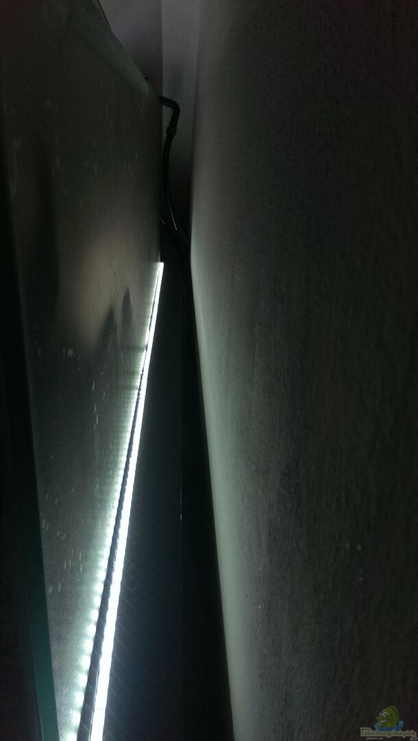 Hinter dem Aquarium klebt ein LED Strip mit der Farbe kaltwei??, also passend zur Eheim. Er wurde auf die Beckenlänge zugeschnitten und dient als Hintergundbeleuchtung, so wie als Zwischenstufe zur Eheim.