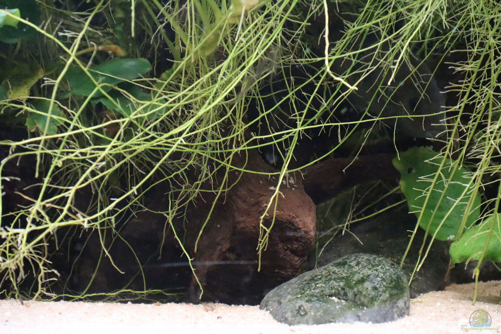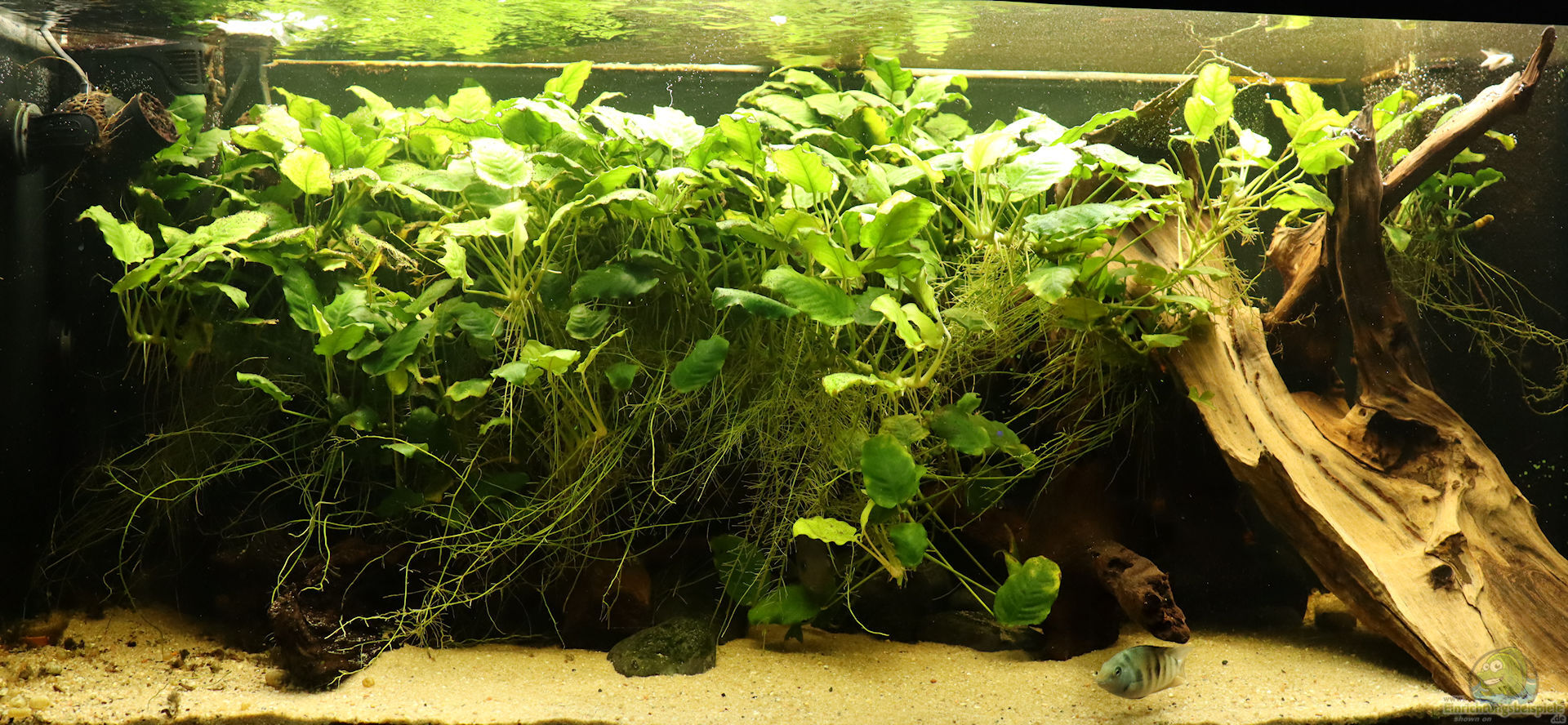 3 gro??e Moorkienwurzeln, diverse Flusskiesel. Von den Wurzeln ist zwar kaum mehr etwas zu sehen, aber sie bieten den aufsitzenden Pflanzen perfekten Halt und gliedern das Becken sehr schön in mehrere Bereiche. Für die Buntbarsche bieten sie zusammen mit den Steinen und Pflanzen unglaublich viele Rückzugsmöglichkeiten.