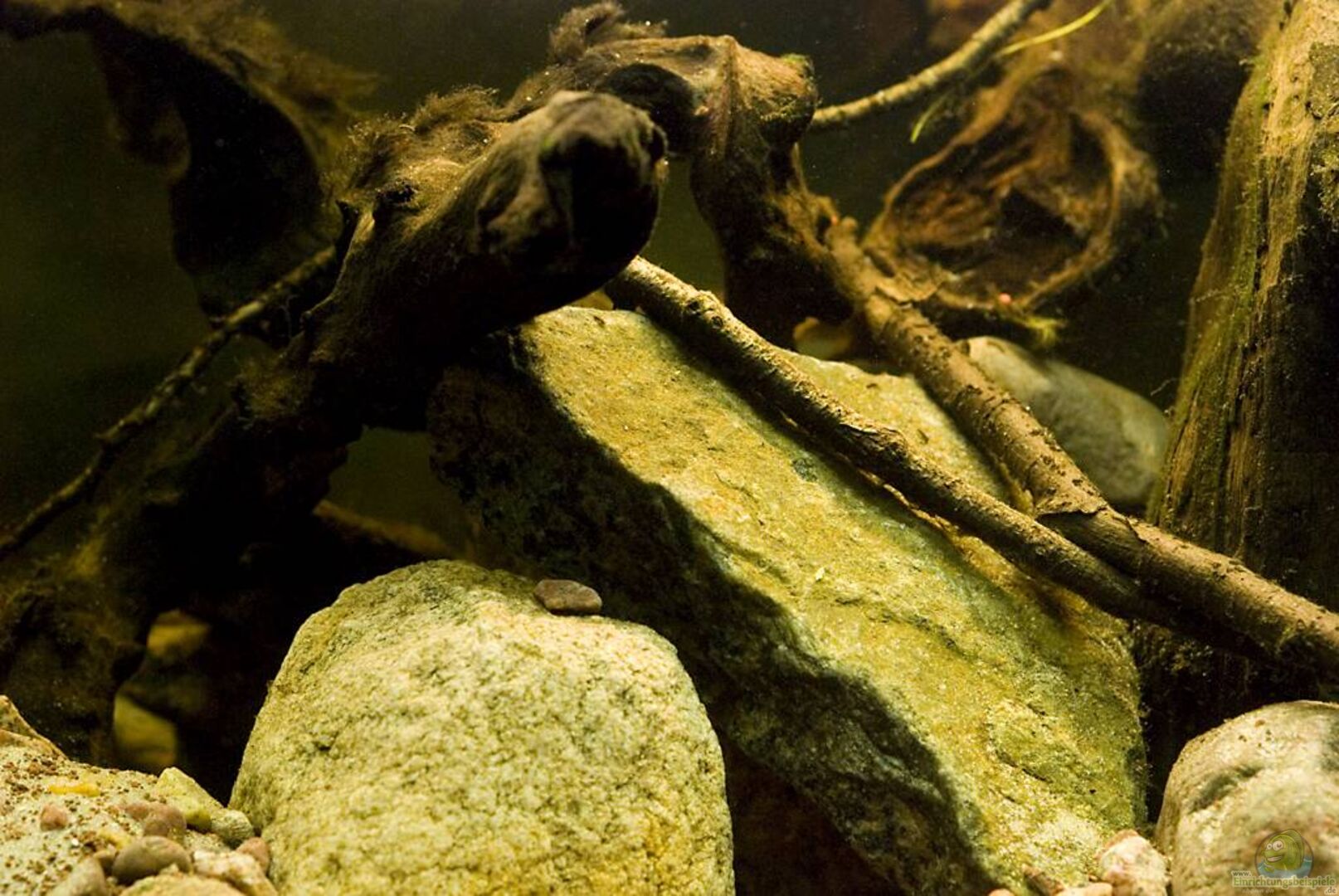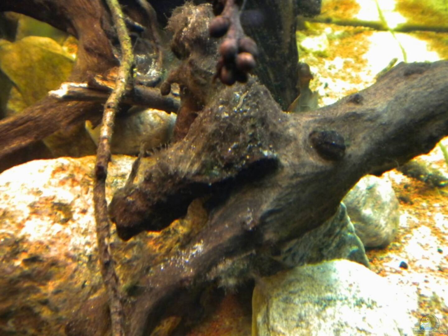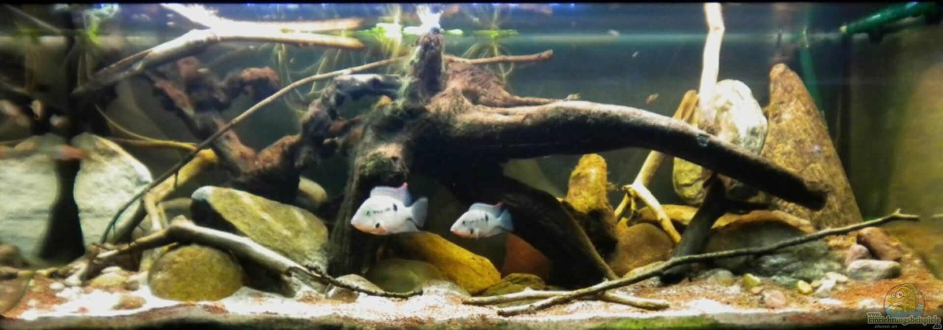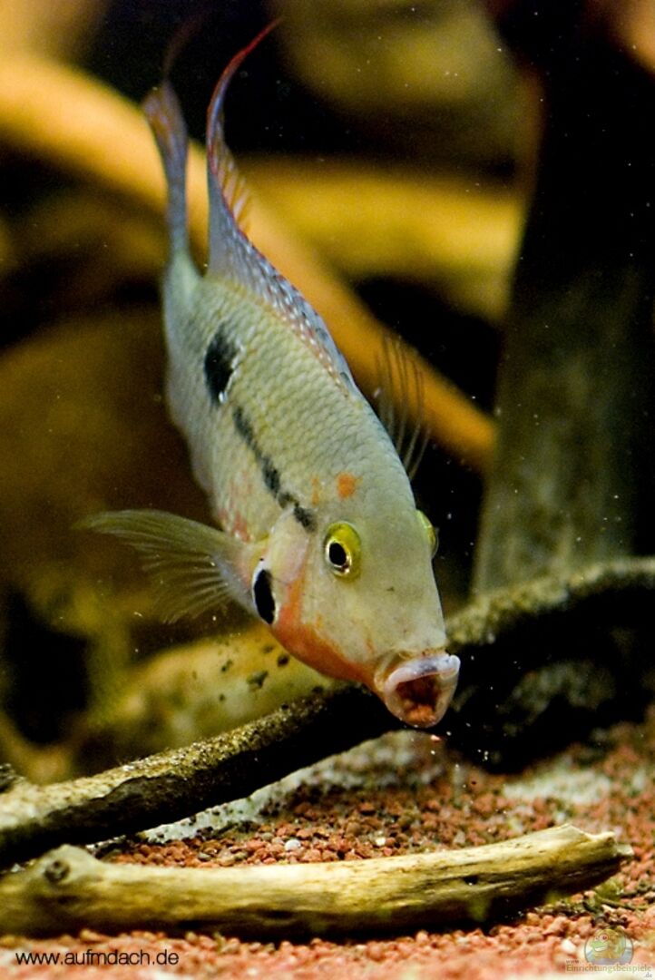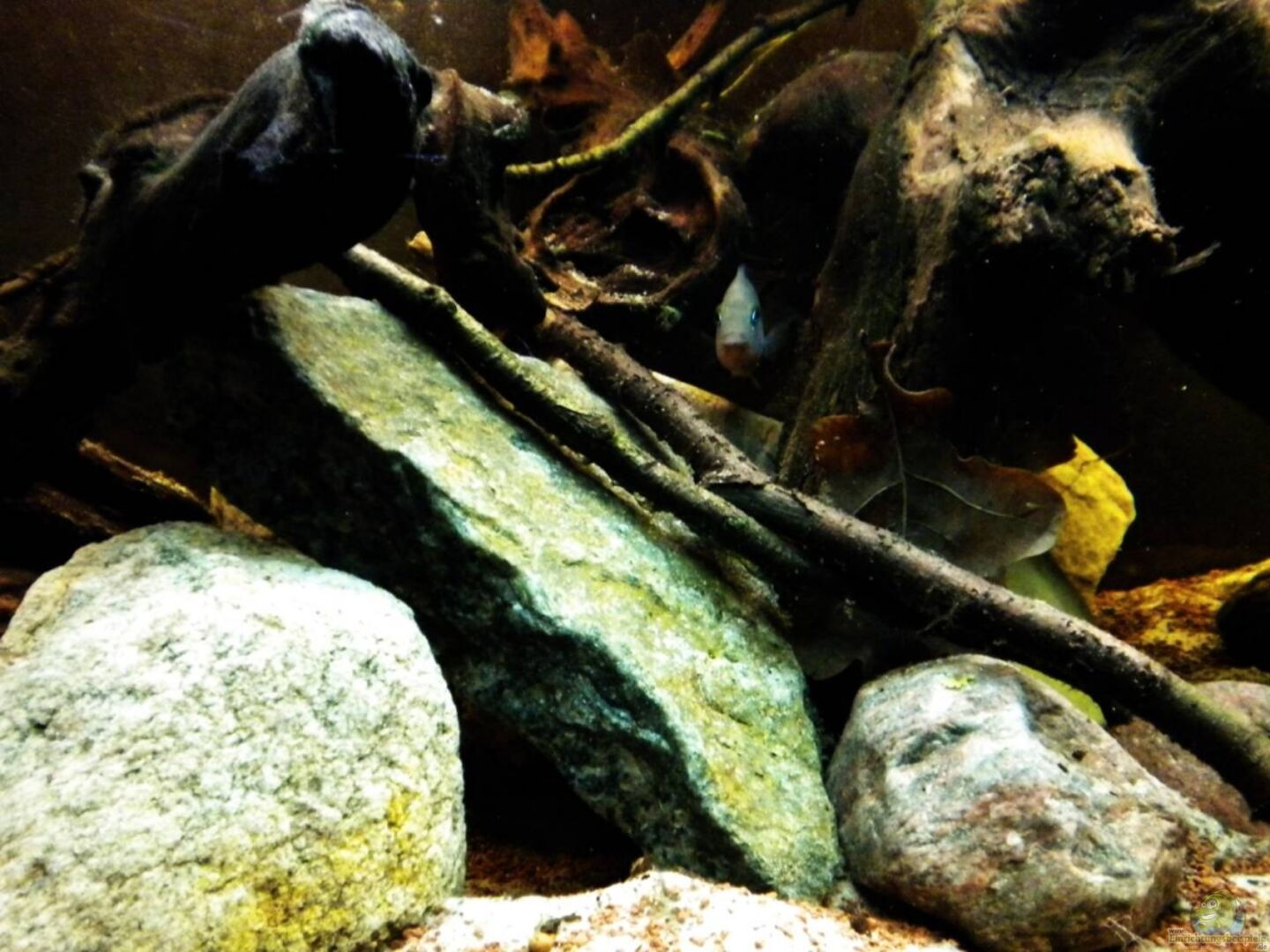 Dekoration erweitert: mehr kleine Kiesel, Treibholz! Videos hochgeladen: Beckenübersicht, Meeki-Weibchen bei der Nahrungsaufnahme!