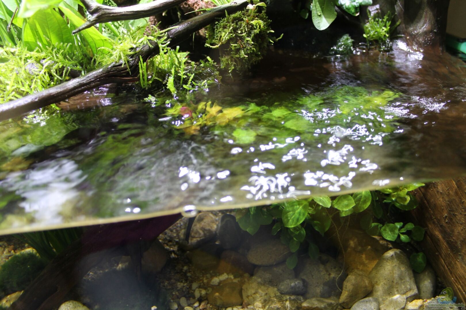 der Filter läuft auf voller Leistung, was keinesfalls zu viel ist, die Wasseroberflächen Bewegung ist so eingestellt, das ca 2/3 der Oberfläche eine gute Strömung aufweisen, das letzte drittel ist quasi die Ruhezone.