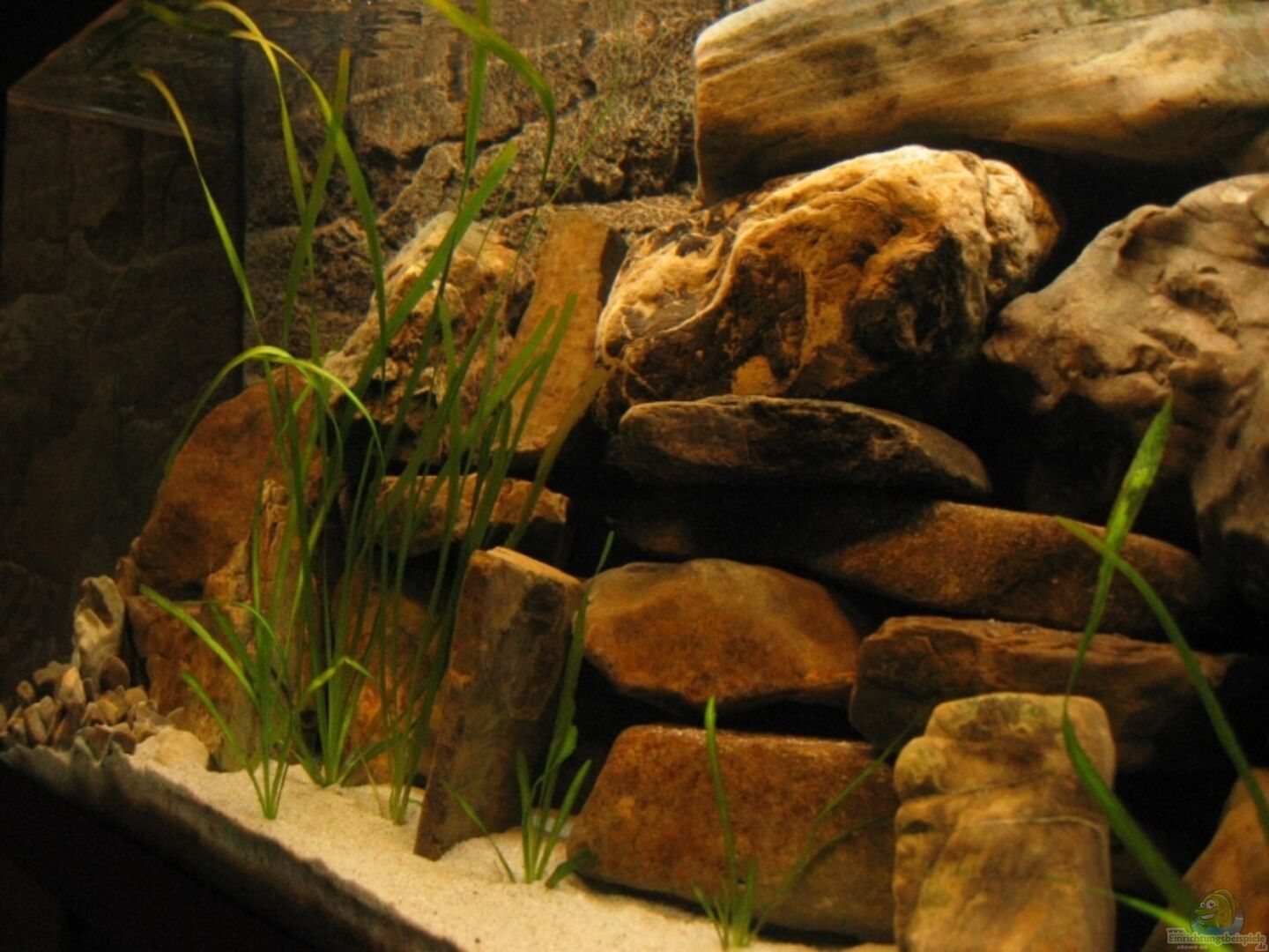 Bachsteine bis zu 15kg das Stück so aufgebaut, dass sich viele Hölhen ergeben, teilweise bis knapp unter Wasserniveau. In einer Ecke kleiner Bachsteine in der anderen einige Schneckenhäuser